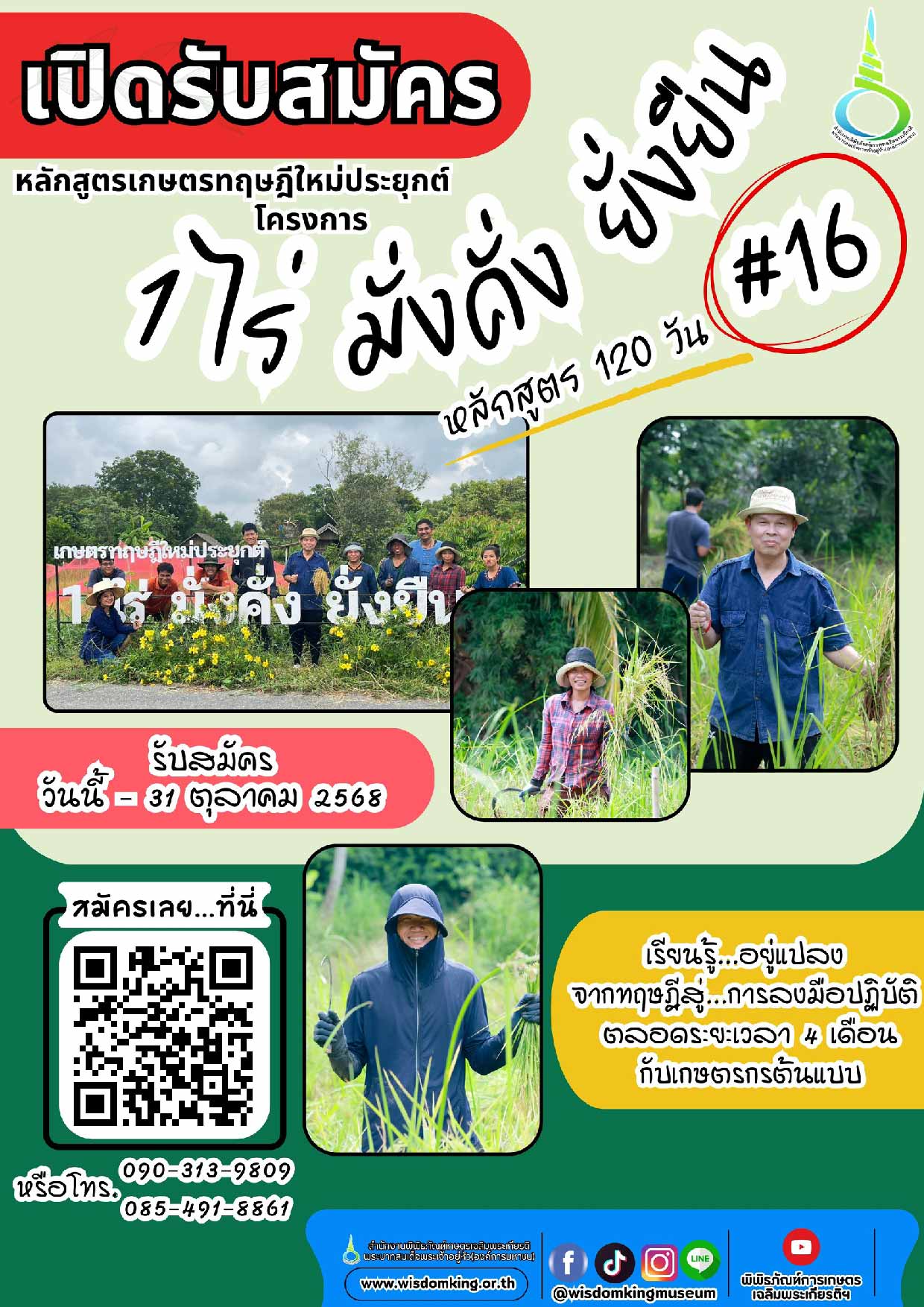 ขยายเวลา...ตามคำเรียกร้อง !! ค้นหา 9 ผู้กล้า รุ่นที่ 16เปิดรับสมัครตั้งแต่วันนี้ ถึง 31 ตุลาคม 2568 คลิ๊กเลย https://forms.gle/CV4sAeeAfbAQyiNU8 พิพิธภัณฑ์การเกษตรฯ เปิดรับสมัครท่านที่สนใจเข้ามาเรียนรู้การทำเกษตรตามศาสตร์ของแผ่นดินแบบเข้มข้นระยะเวลา 4 เดือนเต็ม ในหลักสูตรเกษตรทฤษฎีใหม่ประยุกต์ 1 ไร่ มั่งคั่ง ยั่งยืน รุ่นที่ 16เรียนรู้อยู่แปลงแบบครบเครื่องเรื่องการเกษตรตั้งแต่ทฤษฎีสู่การลงมือปฏิบัติบนพื้นที่ในสถานการณ์จริง โดยผ่านกระบวนการสอนอย่างเข้มข้นจากวิทยากรต้นแบบผู้มากประสบการณ์ อาทิ อาจารย์เฉลิม พีรี อาจารย์ปรีชา บุญท้วม เป็นต้นเปิดรับสมัคร : วันนี้ - 31 ตุลาคม 2568สัมภาษณ์ : 8 พฤศจิกายน 2568**ประกาศผล : 9 พฤศจิกายน 2568**ระยะเวลาเรียนรู้ : 13 พฤศจิกายน 2568 - 12 มีนาคม 2569****(เวลาอาจมีการเปลี่ยนแปลงตามความเหมาะสม)