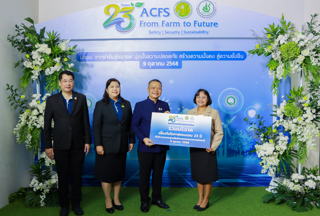 วันที่ 9 ตุลาคม 2568 พันจ่าเอก ประเสริฐ มาลัย ผู้อำนวยการสำนักงานพิพิธภัณฑ์เกษตรเฉลิมพระเกียรติพระบาทสมเด็จพระเจ้าอยู่หัว มอบหมายให้นางสาวสำเภาว์ งามเชย รองผู้อำนวยการสำนักงานพิพิธภัณฑ์เกษตรเฉลิมพระเกียรติพระบาทสมเด็จพระเจ้าอยู่หัว ร่วมแสดงความยินดีเนื่องโอกาสครบรอบ 23 ปี วันคล้ายวันสถาปนาสำนักงานมาตราฐานสินค้าเกษตรและอาหารแห่งชาติ (มกอช.) พร้อมร่วมสมทบทุนสวัสดิการสำนักงานมาตราฐานสินค้าเกษตร และอาหารแห่งชาติ (มกอช.) โดยมี นายสัตวแพทย์ชัยวัฒน์ โยธคล เลขาธิการสำนักงานมาตรฐานสินค้าเกษตรและอาหารแห่งชาติ (มกอช.) ให้การต้อนรับ ณ สำนักงานมาตราฐานสินค้าเกษตรและอาหารแห่งชาติ (มกอช.) ถนนพหลโยธิน เขตจตุจักร กรุงเทพฯ