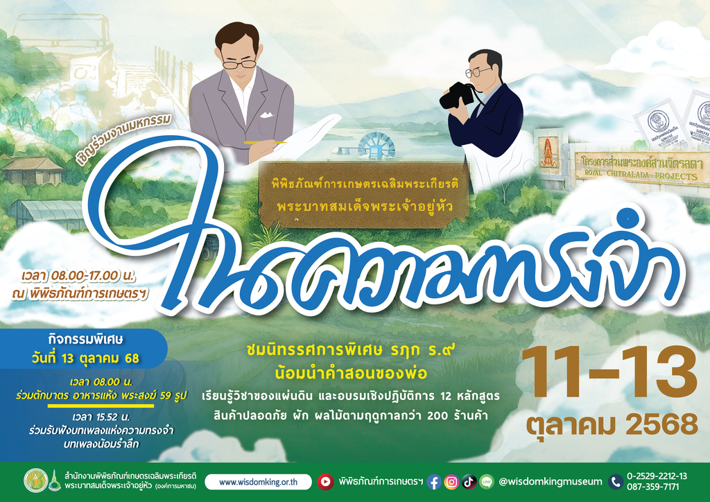 พิพิธภัณฑ์การเกษตรเฉลิมพระเกียรติพระบาทสมเด็จพระเจ้าอยู่หัว จ.ปทุมธานี ขอเชิญประชาชนทุกหมู่เหล่าเข้าร่วมงานมหกรรม “ในความทรงจำ” ระหว่างวันที่ 11–13 ตุลาคม 2568 เวลา 08.00–17.00 น. เพื่อน้อมรำลึกถึงพระมหากรุณาธิคุณและพระราชจริยวัตรอันงดงามของพระบาทสมเด็จพระบรมชนกาธิเบศร มหาภูมิพลอดุลยเดชมหาราช บรมนาถบพิตร ผู้ทรงเป็น “พ่อแห่งแผ่นดิน” ที่สถิตอยู่ในหัวใจคนไทยตราบนิรันดร์ พันจ่าเอก ประเสริฐ มาลัย ผู้อำนวยการสำนักงานพิพิธภัณฑ์เกษตรเฉลิมพระเกียรติฯ กล่าวว่า “ทุกปีที่เดือนตุลาคมเวียนมา เราคนไทยทุกคนต่างหวนคิดถึงพระมหากรุณาธิคุณอันหาที่สุดมิได้ของพระบาทสมเด็จพระบรมชนกาธิเบศร มหาภูมิพลอดุลยเดชมหาราช บรมนาถบพิตร งานมหกรรม ‘ในความทรงจำ’ ครั้งนี้ จัดขึ้นด้วยหัวใจที่เปี่ยมด้วยความรักและความภักดี เพื่อน้อมรำลึกถึงคุณงามความดีของพระบาทสมเด็จพระบรมชนกาธิเบศร มหาภูมิพลอดุลยเดชมหาราช บรมนาถบพิตร ที่ทรงเสียสละพระวรกายประกอบพระราชกรณียกิจในถิ่นทุรกันดาร เพื่อหวังให้เกิดความผาสุกแก่ประชาชนที่อาศัยบนพื้นแผ่นดินไทย นอกจากนี้ยังเป็นเวทีในการถ่ายทอดองค์ความรู้ หลักคิด และภูมิปัญญาที่ทุกคนสามารถนำไปปรับใช้ได้จริงในชีวิตประจำวัน เราจึงอยากให้ทุกคนได้มาเรียนรู้ สัมผัส และแบ่งปันเรื่องราวดี ๆ เพื่อเป็นแรงบันดาลใจให้ก้าวเดินต่อไปตามคำสอนของพ่อ พร้อมกับร่วมสืบสานพระราชปณิธาน และขับเคลื่อนสังคมไทยไปสู่ความมั่นคงและยั่งยืนตามหลักปรัชญาของเศรษฐกิจพอเพียง” กิจกรรมสำคัญในงาน คือ กิจกรรมน้อมรำลึกในวันนวมินทรมหาราช วันที่ 13 ตุลาคม 2568 เวลา 08.30 น. ขอเชิญร่วมทำบุญตักบาตรข้าวสารอาหารแห้งแด่พระภิกษุสงฆ์ จำนวน 59 รูป เพื่อถวายเป็นพระราชกุศลพระบาทสมเด็จพระบรมชนกาธิเบศร มหาภูมิพลอดุลยเดชมหาราช บรมนาถบพิตร และตั้งแต่เวลา 15.30 น. เป็นต้นไป ร่วมใจน้อมรำลึกสงบนิ่งอย่างพร้อมเพรียง เพื่อน้อมสำนึกในพระมหากรุณาธิคุณอันหาที่สุดมิได้ของพระมหากษัตริย์ผู้เป็นที่รักของประชาชน ในบรรยากาศที่อบอวนไปด้วยเสียงขลุ่ย “แห่งความทรงจำ” และ “บทเพลงแห่งคุณงามความดี” จากศิลปินแห่งชาติ สาขาศิลปะการแสดง (ดนตรีไทยสากล) อาจารย์ธนิสร์ ศรีกลิ่นดี และคุณขวัญข้าว ธิดารินทร์ นิทรรศการเทิดพระเกียรติ “รฦก ร.9 ในความทรงจำ” ที่จะพาผู้เข้าชมย้อนรำลึกผ่านภาพถ่ายและเรื่องราวพระราชกรณียกิจในพื้นที่ห่างไกลทุรกันดาร สะท้อนภาพพระวิริยะอุตสาหะและพระเมตตาของในหลวง รัชกาลที่ 9 ที่ทรงมุ่งหวังให้คนไทยมีชีวิตที่ดีขึ้น โดยพระองค์ทรงเน้นไปที่การ