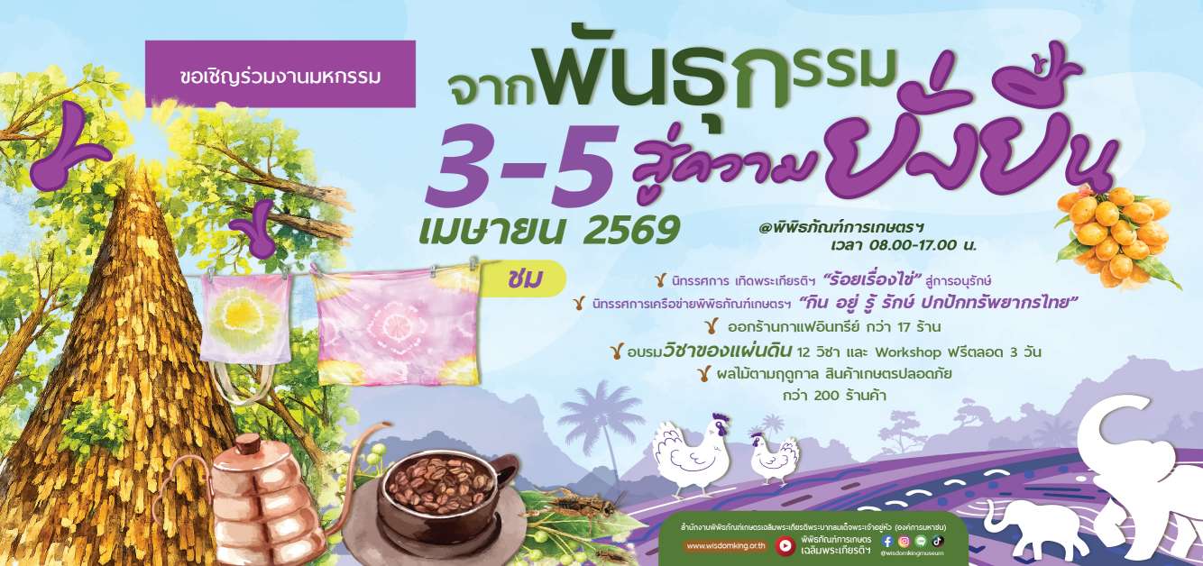 วันพุธที่ 11 มีนาคม 2569 พิพิธภัณฑ์การเกษตรเฉลิมพระเกียรติฯ จังหวัดปทุมธานี ให้การต้อนรับ อาจารย์ นักศึกษา จากมหาวิทยาลัยเทคโนโลยีราชมงคลสุวรรณภูมิ ศูนย์หันตรา จังหวัดพระนครศรีอยุธยา เข้าร่วมโครงการส่งเสริมการเรียนรู้เกษตรเศรษฐกิจพอเพียง ในรูปแบบหลักสูตร “ตามรอยพ่อ” เริ่มต้นด้วยการเรียนรู้พระเกียรติคุณ และพระอัจฉริยภาพของพระมหากษัตริย์ไทย ด้านการเกษตร ผ่านนิทรรศการเกษตรไทย เกษตรโลก นิทรรศการนวัตกรรมเกษตรเศรษฐกิจพอเพียง นิทรรศการเกษตรอนาคต ภายในพิพิธภัณฑ์ในหลวงรักเรา และเข้าชมภาพยนตร์แอนิเมชัน 3 มิติ “เรื่องทรัพย์ดินสินน้ำ” พร้อมฝึกทักษะการคิด การทำงานเป็นทีม สอดแทรกหลักปรัชญาของเศรษฐกิจพอเพียง ผ่านกิจกรรมรากฐานแห่งความมั่นคง หน่วยงานใดที่สนใจเข้าร่วมเรียนรู้ในรูปแบบหมู่คณะ สามารถดูหลักสูตรต่างๆได้ที่ https://www.wisdomking.or.th/views/course/ สอบถามรายละเอียด 094-649-2333 087-359-7171 02-529-2212 หรือ www.wisdomking.or.th facebook: wisdomkingmuseum และ Line ID: @wisdomkingmuseum
