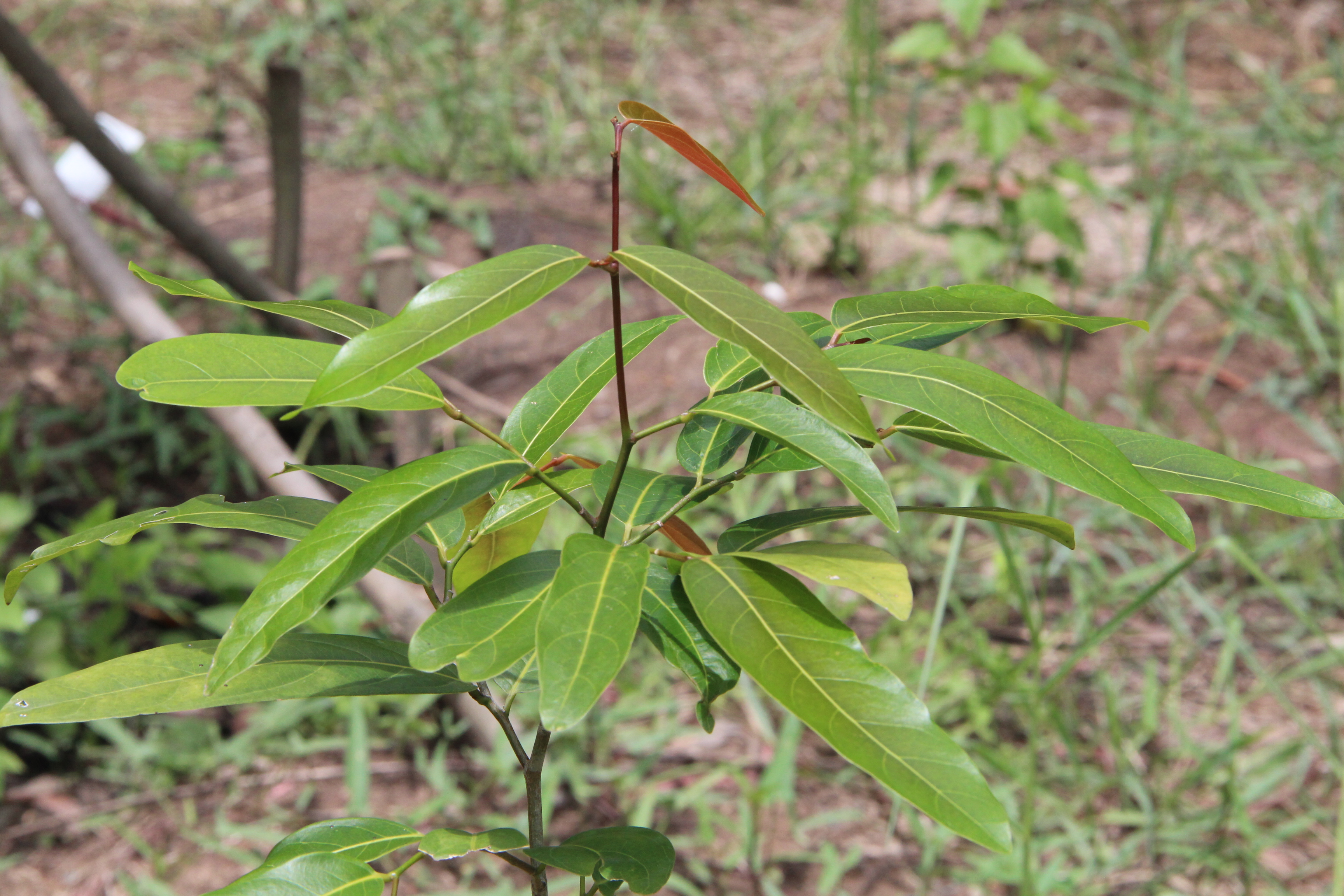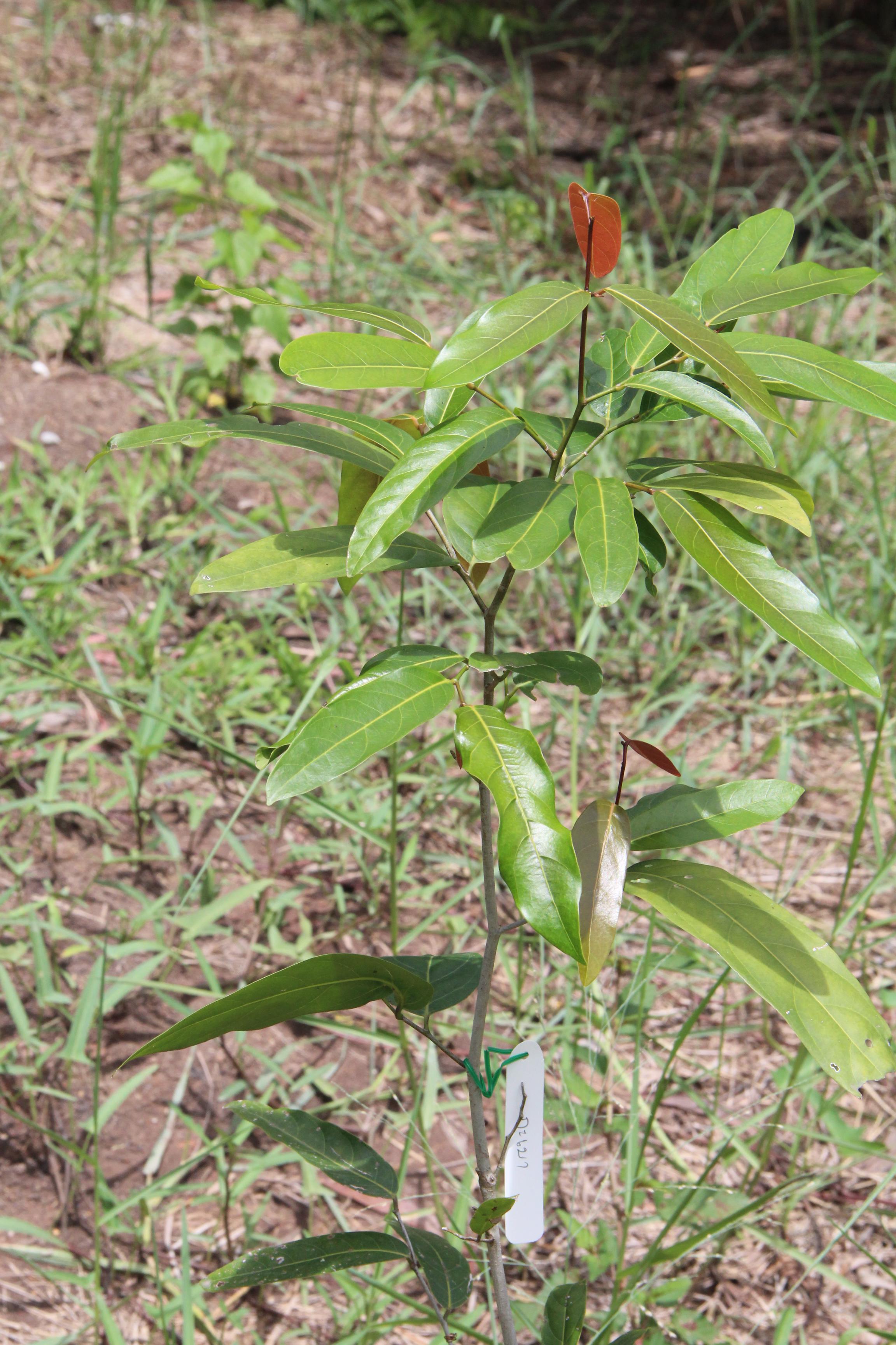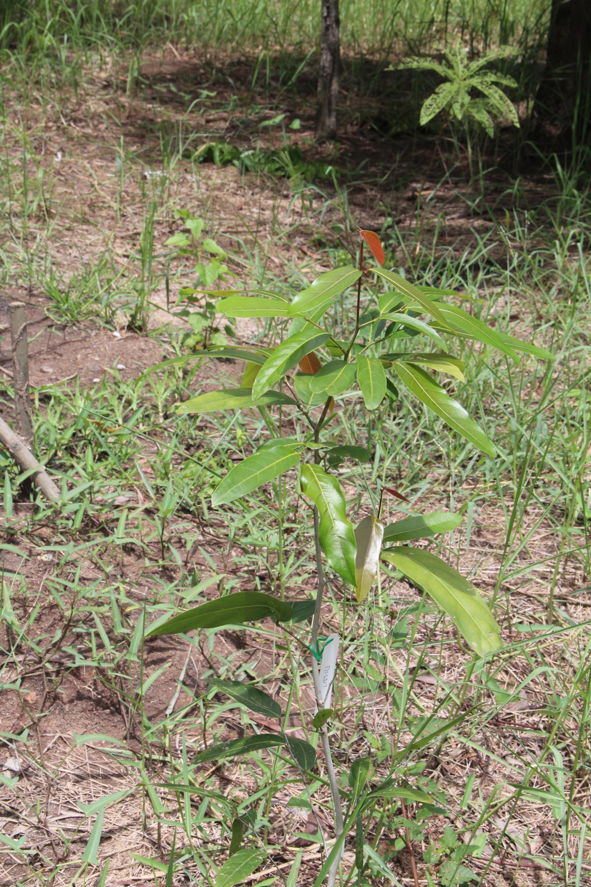 | ลักษณะใบ | ใบเดี่ยว เรียงสลับ รูปขอบขนานแกมรีหรือรูปขอบขนาน ค่อนข้างหนา ปลายเป็นติ่งแหลมสั้นๆ โคนสอบกว้างถึงมน เบี้ยวเล็กน้อย ขอบเรียบ ด้านบนเกลี้ยงและค่อนข้างเป็นมัน ด้านล่างมีขนสั้นๆ ตามเส้นกลางใบและเส้นแขนงใบ เส้นแขนงใบเยื้องกันข้างละ 8 - 10 เส้น เห็นชัดทางด้านล่าง ก้านใบยาว 1 - 2 เซนติเมตร |