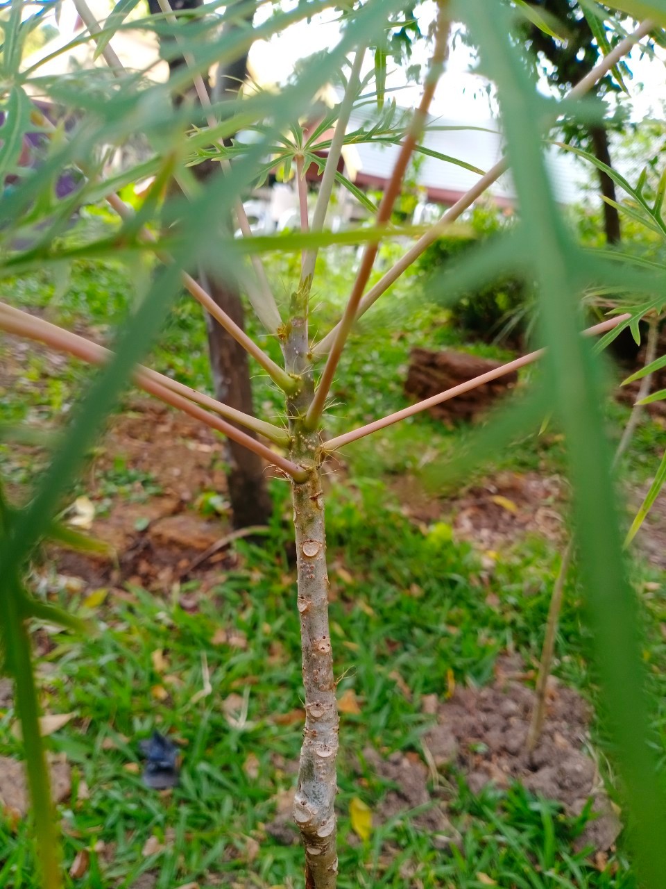 | ลักษณะใบ | ใบเดี่ยวขนาดใหญ่ ขอบใบเว้าลึกเป็นแฉกๆ แบบนิ้วมือ 9 - 10 แฉก แต่ละแฉกแบ่งเป็นหยักปลายแหลมเรียว ก้านใบยาว โคนก้านใบมีหูใบเป็นเส้นๆ หลายเส้น ใบออกแบบสลับ |