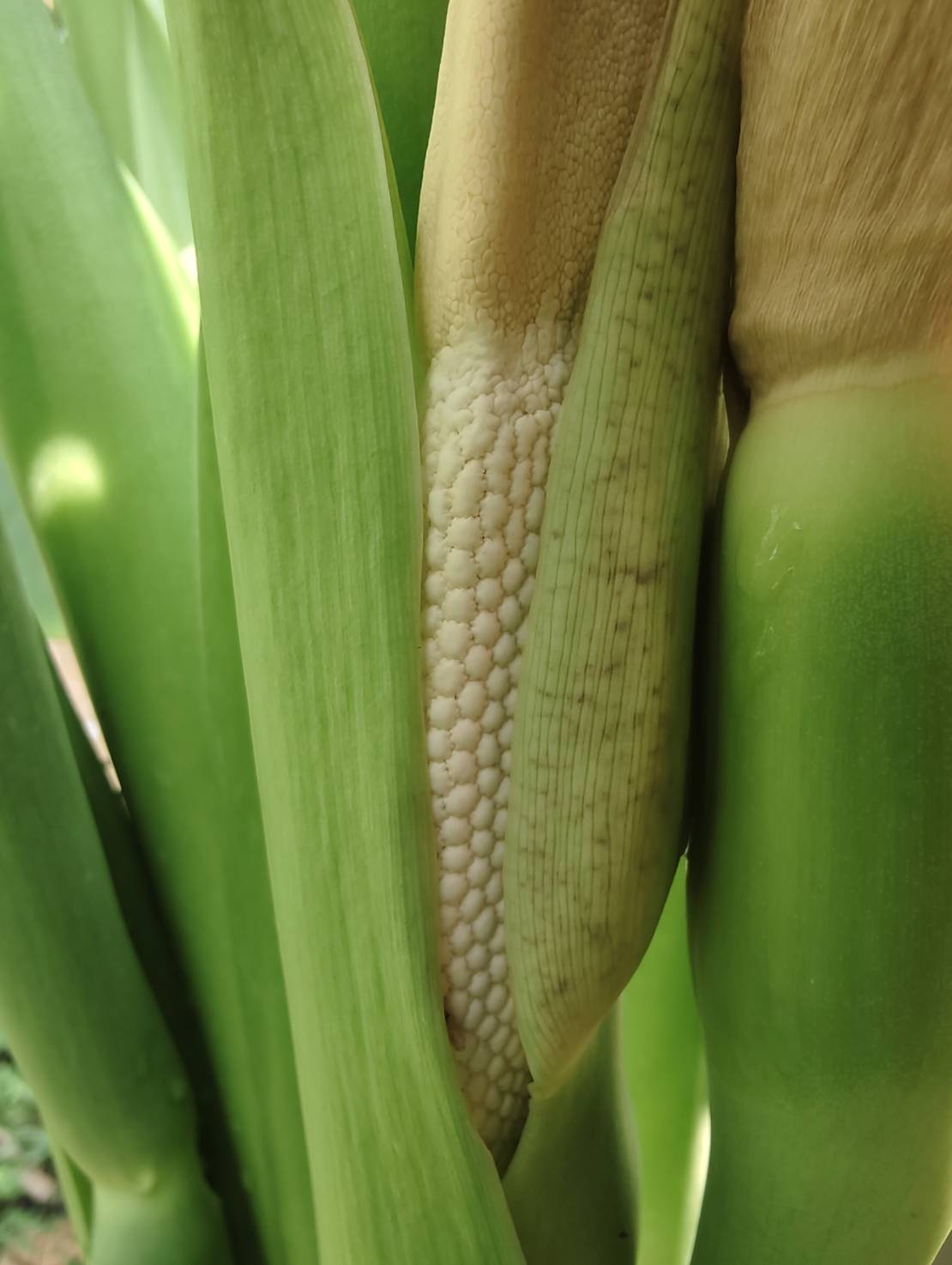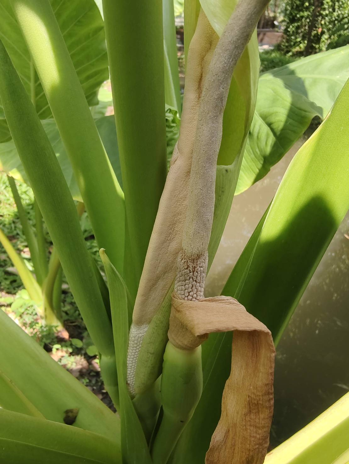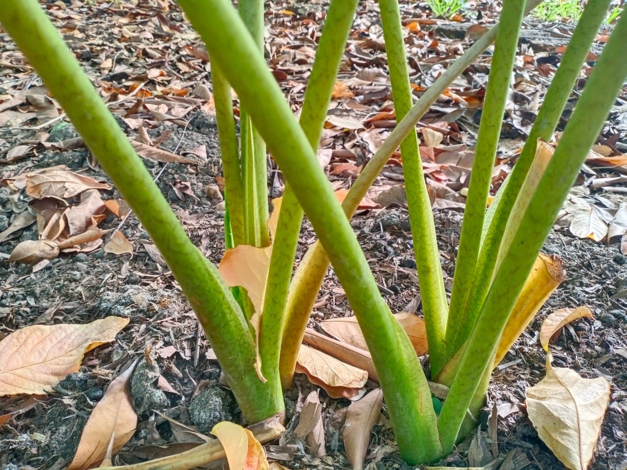 | ลักษณะวิสัย | เป็นไม้ล้มลุก มีความสูงของต้นประมาณ 0.85 เซนติเมตร เป็นลำต้นเหนือดิน ตั้งทรงเองได้ เปลือกมีสีเขียว มียางสีใส ใบและก้านคล้ายบอน ก้านจะมีจุดสีคล้ายเกร็ดงูอยู่ทั่วทั้งก้าน หัวคล้ายกับเผือกคัน |