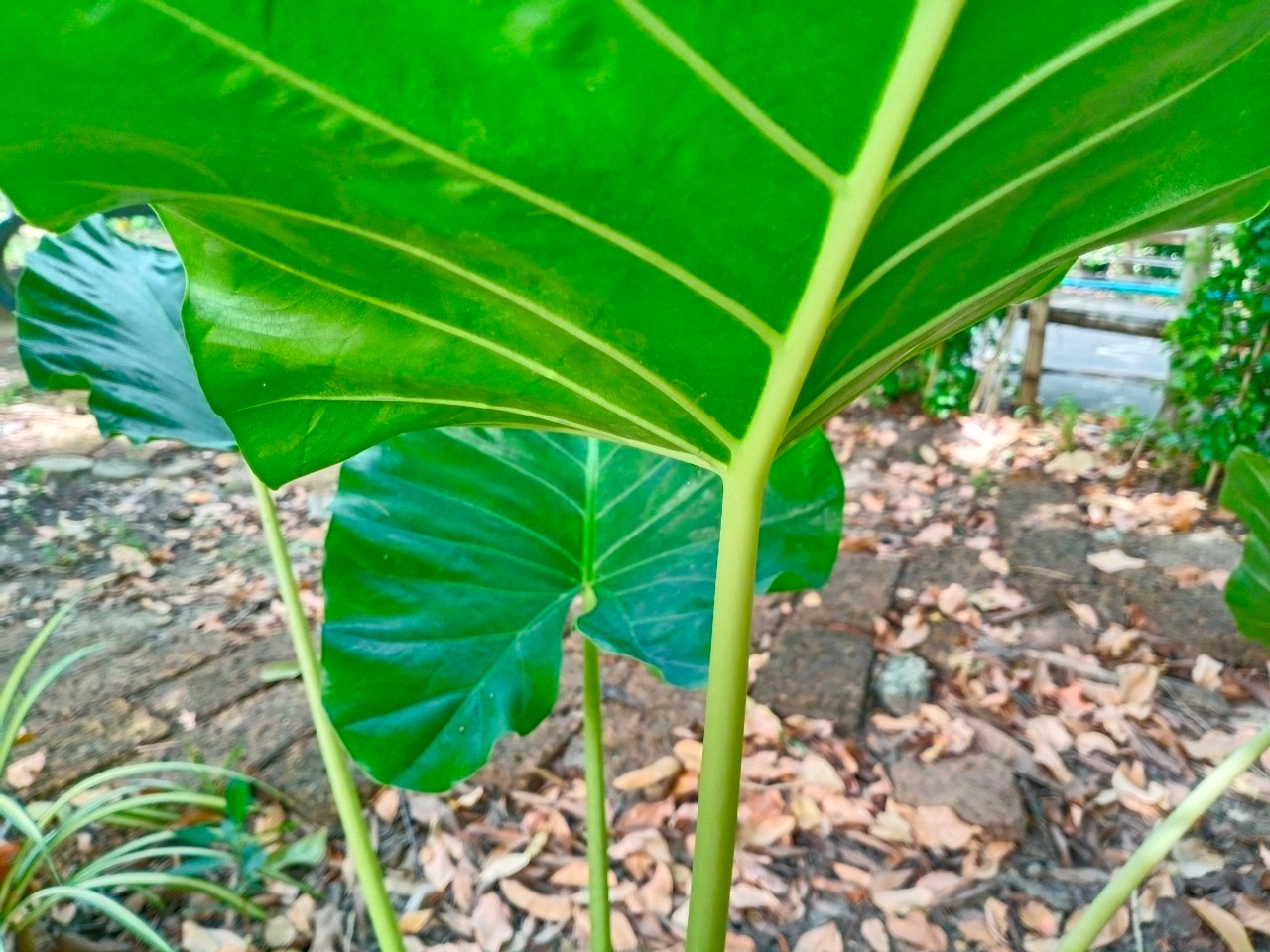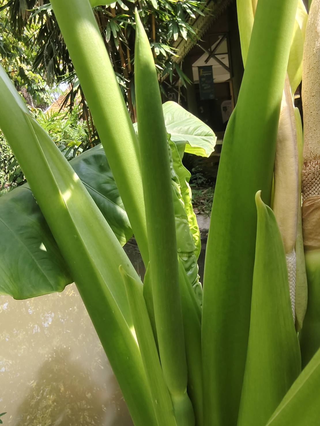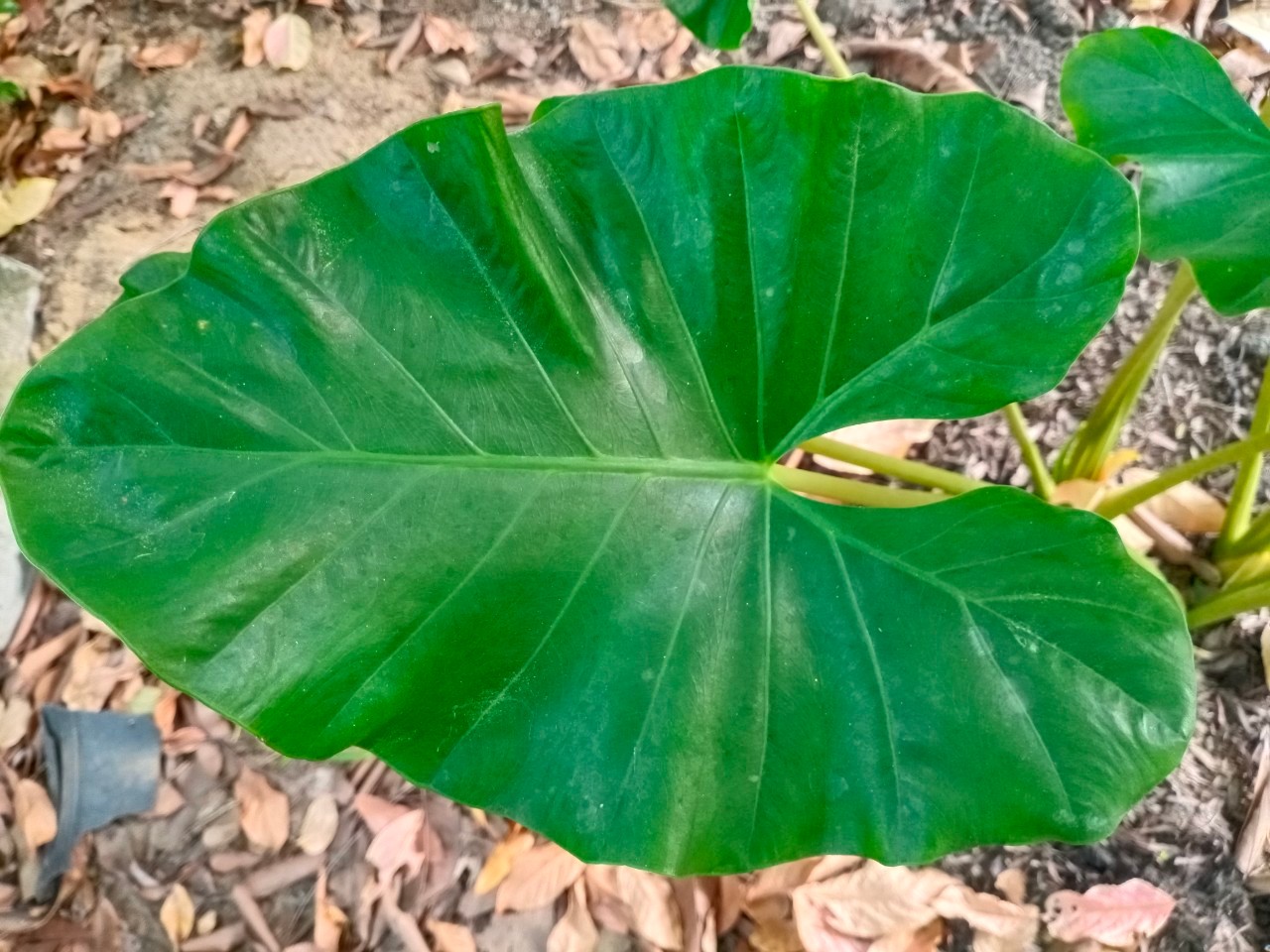 | ลักษณะใบ | เป็นใบเดี่ยวมีสีเขียว รูปร่างของแผ่นใบเป็นรูปแบบหัวลูกศร ปลายใบแหลม โคนใบเป็นรูปเงี่ยงลูกศร ขอบใบเป็นคลื่น ใบเป็นสีเขียวอ่อน โคนก้านใบต้องมีลายสีน้ำตาลคล้ายลายของงูจงอาง |