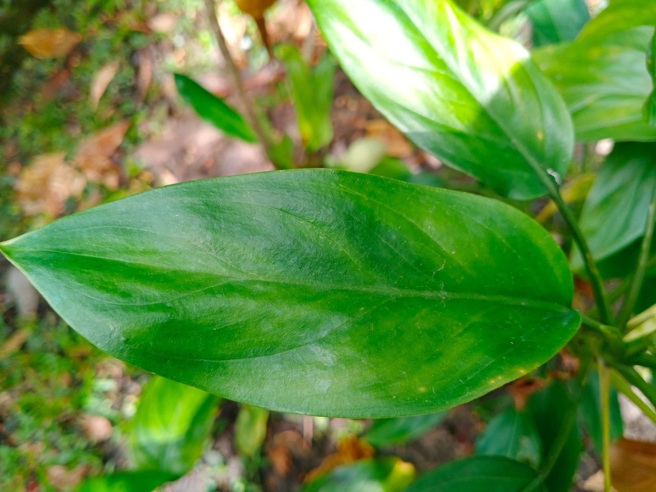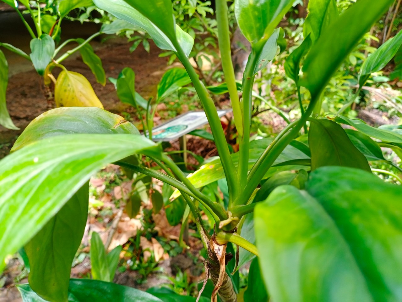 | ลักษณะดอก | ออกดอกเป็นช่อตรงยอดหรือตรงด้านข้าง และมีกาบหุ้มช่อดอกลักษณะเป็นรูปขอบขนาน ปลายแหลม มีจุดเล็ก ๆ สีขาว ลักษณะช่อดอกเป็นแท่งกลมยาว |