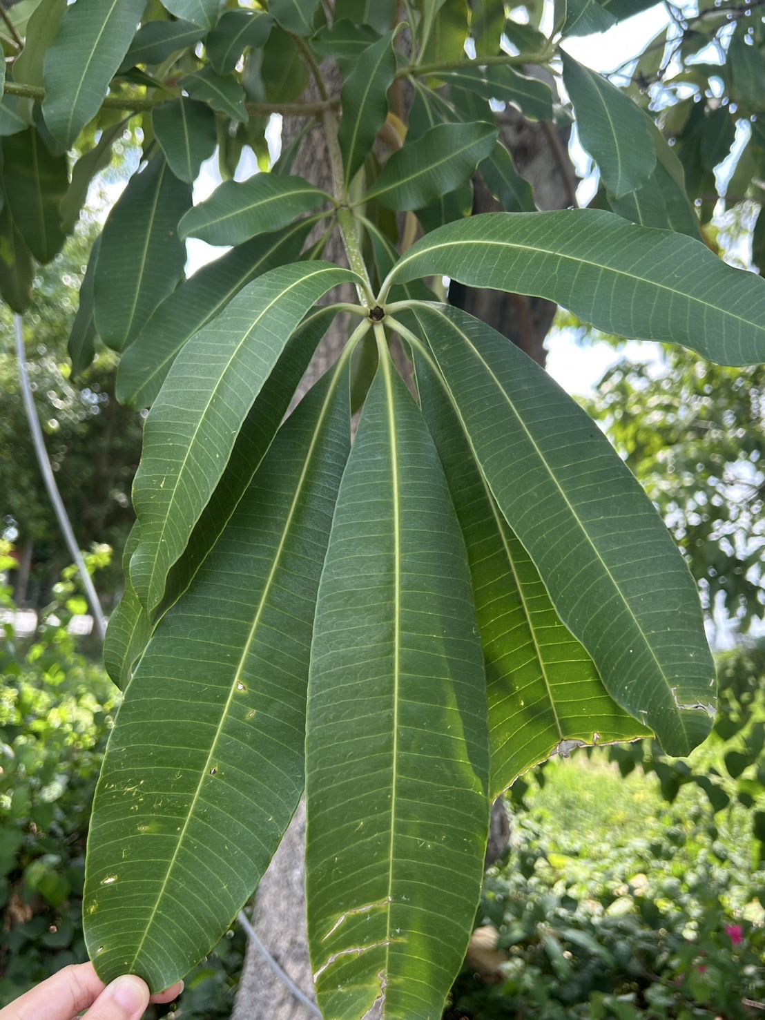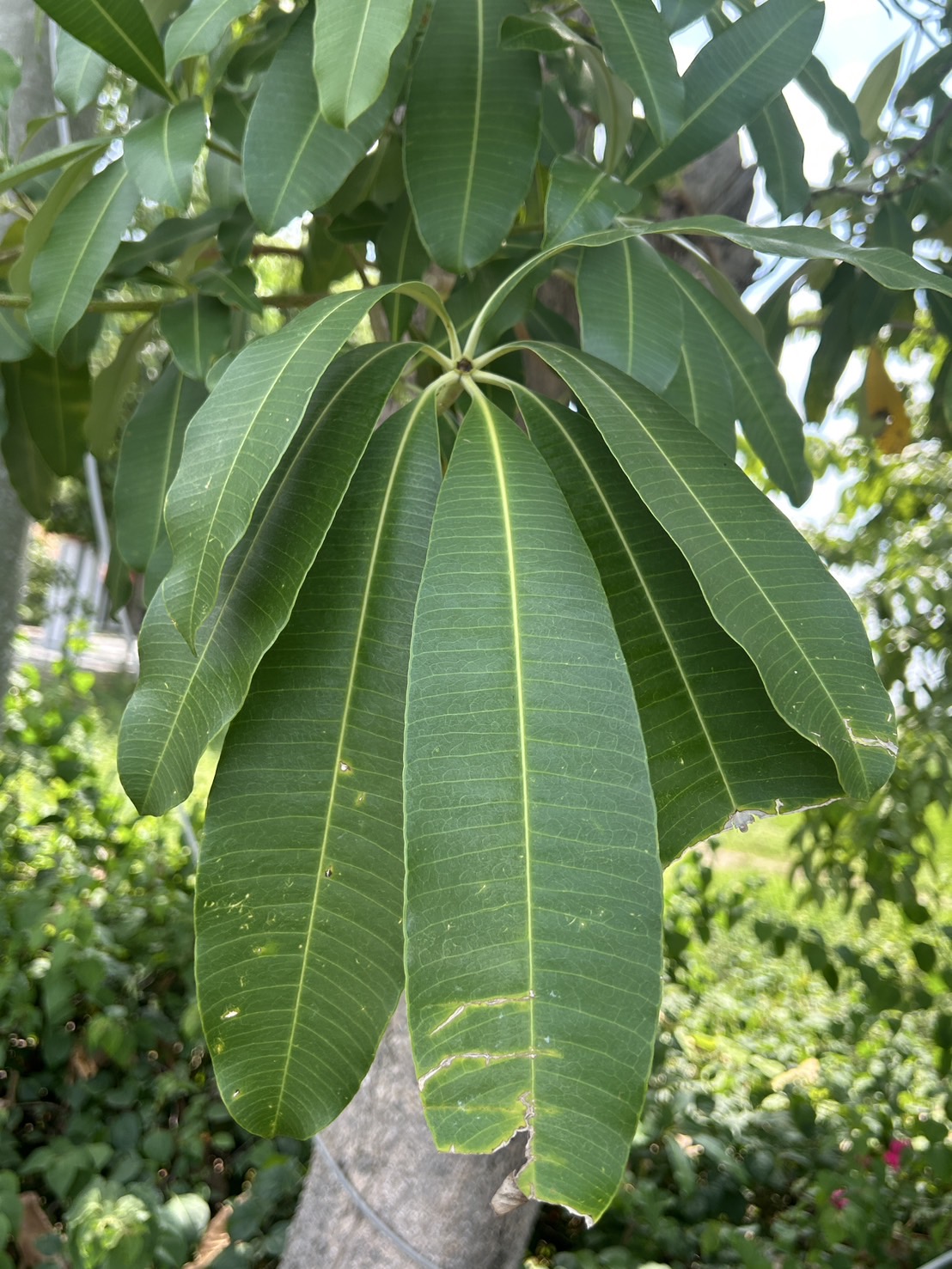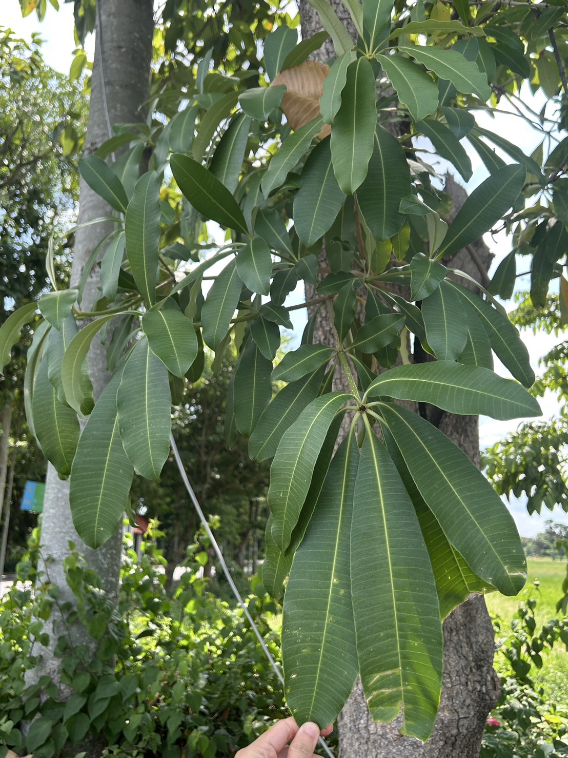 | ลักษณะใบ | ใบเดี่ยวออกเรียงสลับกันหนาแน่นที่ปลายกิ่ง ลักษณะของใบเป็นรูปรียาวหรือเป็นรูปใบหอกแกมรูปไข่ ปลายใบมีติ่งหรือหางใบแหลม โคนใบสอบหรือเป็นรูปลิ่ม ส่วนขอบใบเรียบหรือเป็นคลื่นเล็กน้อย ใบเป็นสีเขียวเข้ม หลังใบเรียบเกลี้ยงเป็นมัน มีเส้นแขนงใบประมาณ 12 - 25 เส้น เห็นเส้นใบได้ชัดเจน ส่วนท้องใบเรียบ ก้านใบยาวประมาณ 3 เซนติเมตร |