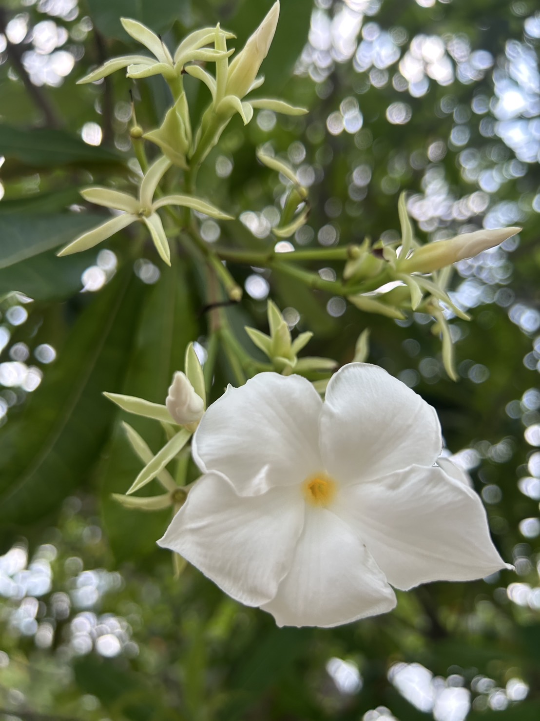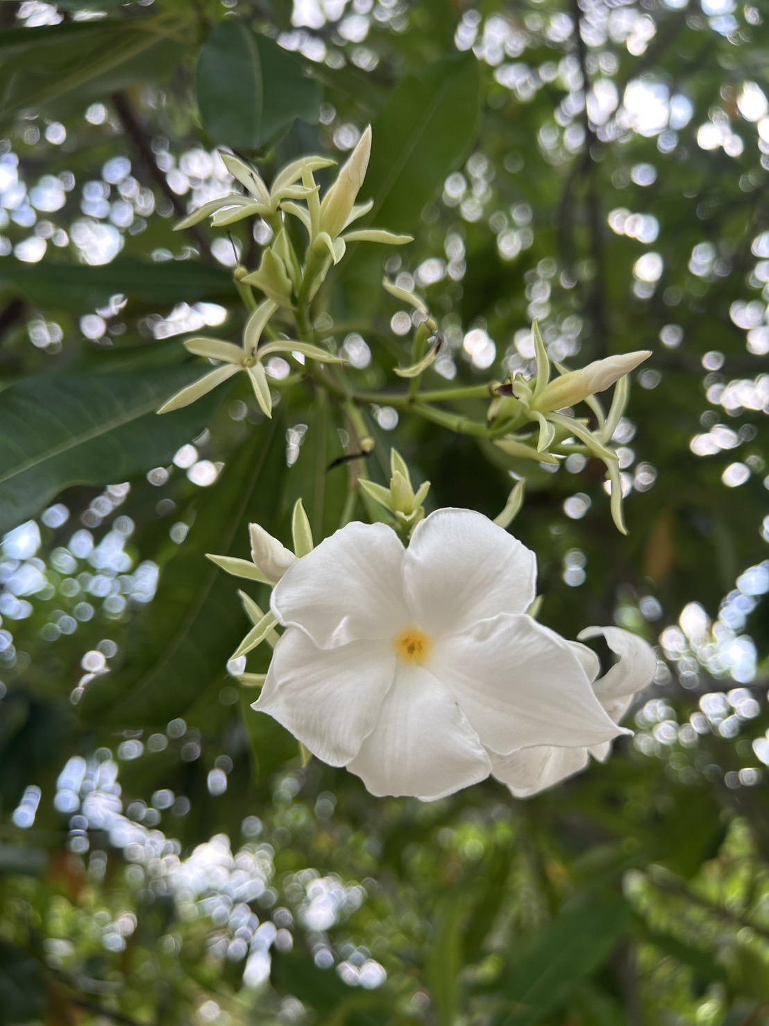| ลักษณะดอก | ดอกเป็นช่อตามปลายกิ่ง ช่อดอกยาวประมาณ 8 - 35 เซนติเมตร แต่ละช่อมีดอกหลายดอก ประมาณ 10 - 14 ดอก ดอกย่อยเป็นสีขาว ดอกมีกลิ่นหอมอ่อน ๆ ก้านดอกยาวประมาณ 1 - 4 เซนติเมตร มีกลีบดอก 5 กลีบ เรียงซ้อนทับกันด้านซ้ายในตาดอก ปลายกลีบดอกแหลม ดอกบานมีแต้มเหลืองรอบปากหลอดกลีบดอก หลอดกลีบยาวประมาณ 1 - 2 เซนติเมตร ดอกมีเกสรเพศผู้ 5 ก้านติดกลางหลอดกลีบดอก ส่วนกลีบรองดอกหรือกลีบเลี้ยงมี 5 กลีบ ลักษณะเป็นรูปแถบหรือรูปใบหอก ปลายกลีบเรียวแหลม เมื่อดอกบานเต็มที่จะมีขนาดกว้างประมาณ 6 - 7 เซนติเมตร |