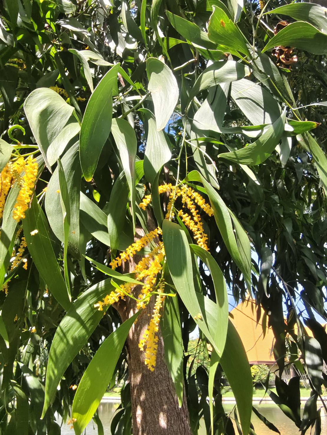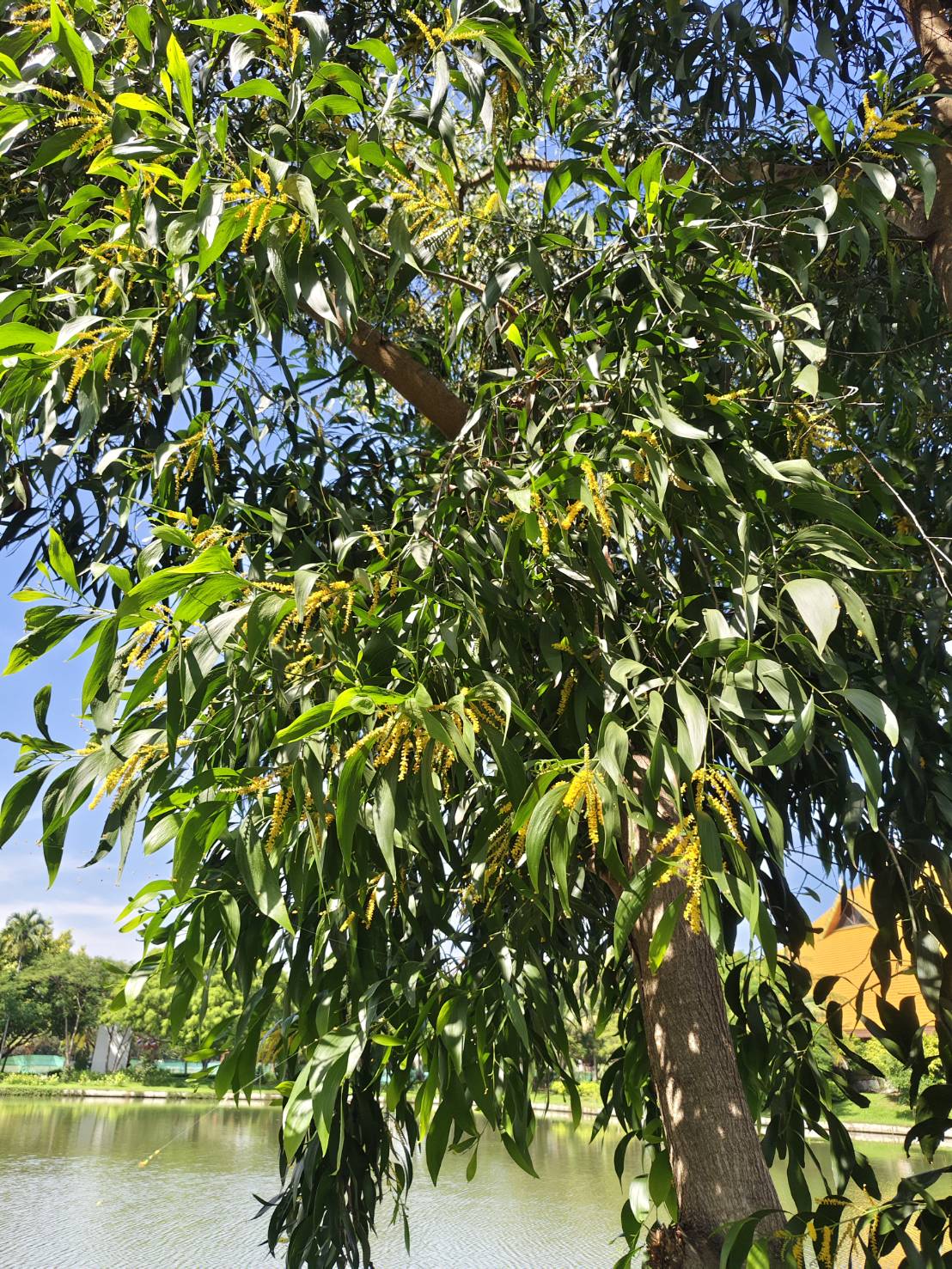 | ลักษณะดอก | ดอกสีเหลือง มีกลิ่นหอม ออกเป็นช่อแบบช่อแยกเเขนงเป็นคู่ ๆ ที่ซอกใบและปลายกิ่ง มีดอกย่อยขนาดเล็กจำนวนมาก โคนกลีบเลี้ยงติดกันปลายแยกเป็น 5 แฉก โคนกลีบดอกติดกัน ปลายแยกเป็น 5 แฉก โค้งกลับลง เกสรเพศผู้สีเหลืองจำนวนมาก |