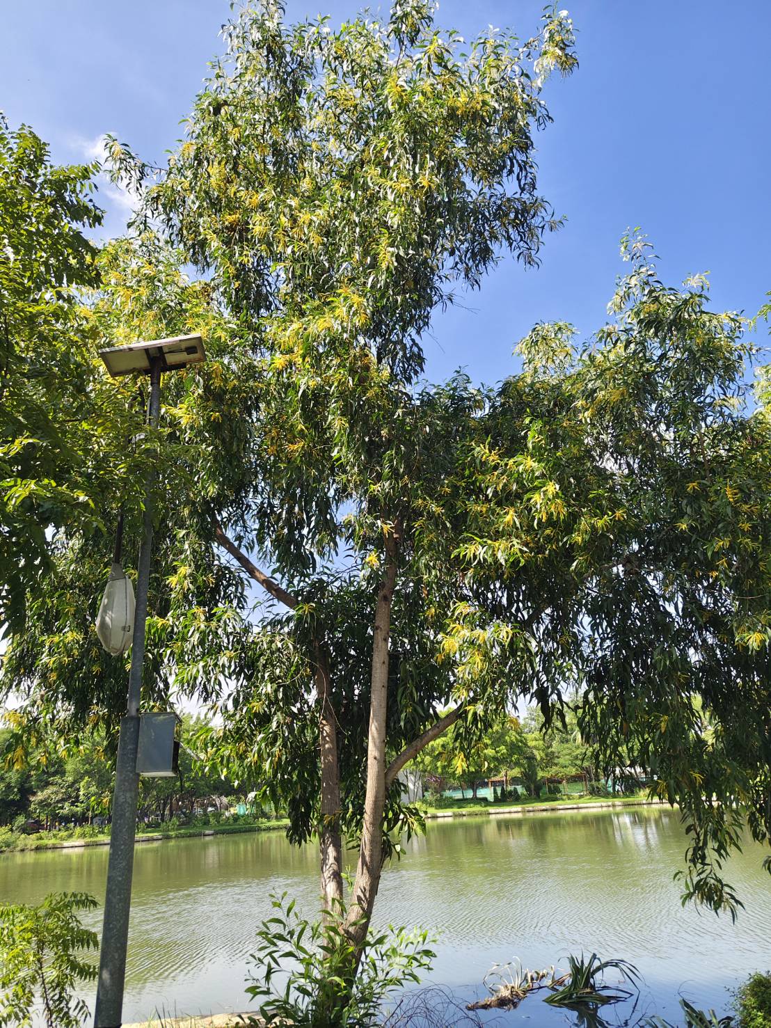| ลักษณะใบ | ใบประกอบเเบบชนนกสองชั้น ไม่ผลัดใบ แตกใบได้ตลอดทั้งปี ต้นอ่อนแตกใบ 1 - 2 คู่ เป็นใบผสมขนาดเล็ก เมื่อโตขึ้นใบผสมจะร่วงหมดเกิดเป็นใบเดี่ยวแท้ แตกออกตามกิ่งเรียงสลับกัน ใบมีลักษณะเรียวยาว และโค้งเป็นรูปเคียว มีสีเขียวเข้ม ลักษณะค่อนข้างหนา มองเห็นเป็นเส้นใบ 3 เส้น ขนานกันตามแนวยาวจากโคนใบจรดปลายใบ |