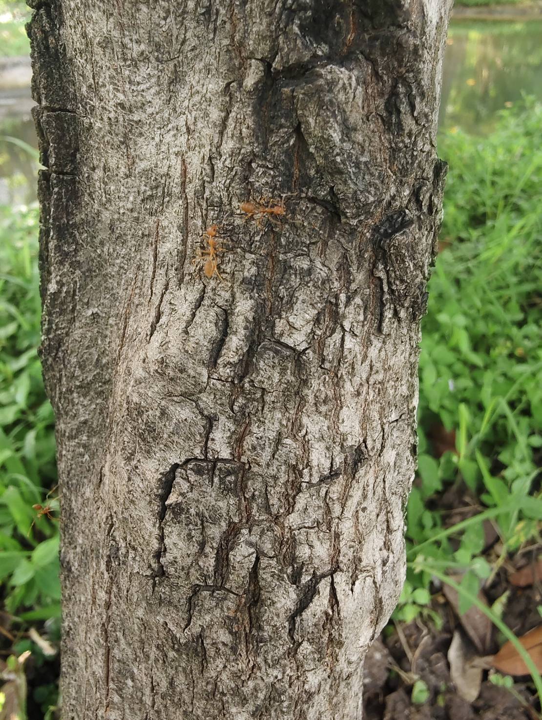 | ลักษณะวิสัย | ไม้ยืนต้นขนาดกลาง สูงได้ถึง 30 เมตร ทรงพุ่มกลม แน่นทึบ เปลือกต้นสีน้ำตาลอมเทา แตกกิ่งก้านเป็นชั้นรอบลำต้น ทุกส่วนของต้นมีน้ำยางสีขาว |