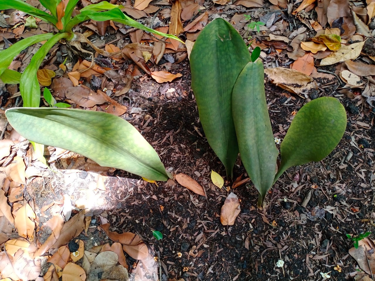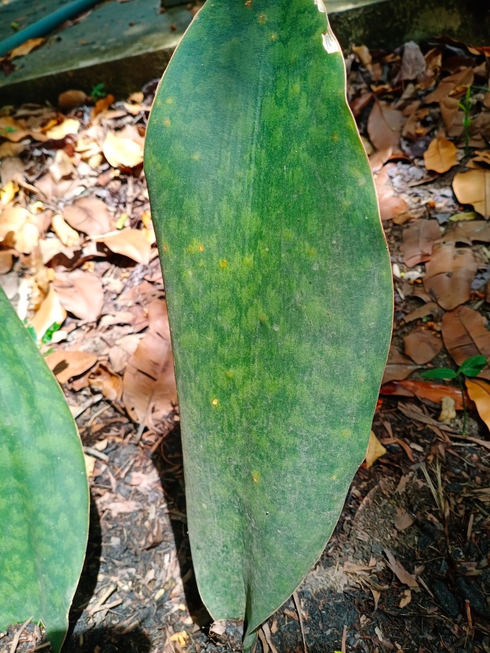 | ลักษณะใบ | ใบออกเรียงสลับเป็นรูปรีแกมรูปขอบขนาน ปลายแหลม โคนใบมน ก้านใบใหญ่และแข็ง เนื้อใบหนาและแข็งมาก ผิวใบเรียบ สีเขียวสด มีลายประดับคล้ายคลื่นน้ำทั่วทั้งใบ เวลามีใบดกจะชูใบตั้งขึ้นดูเหมือนครีบปลาวาฬขนาดใหญ่ |