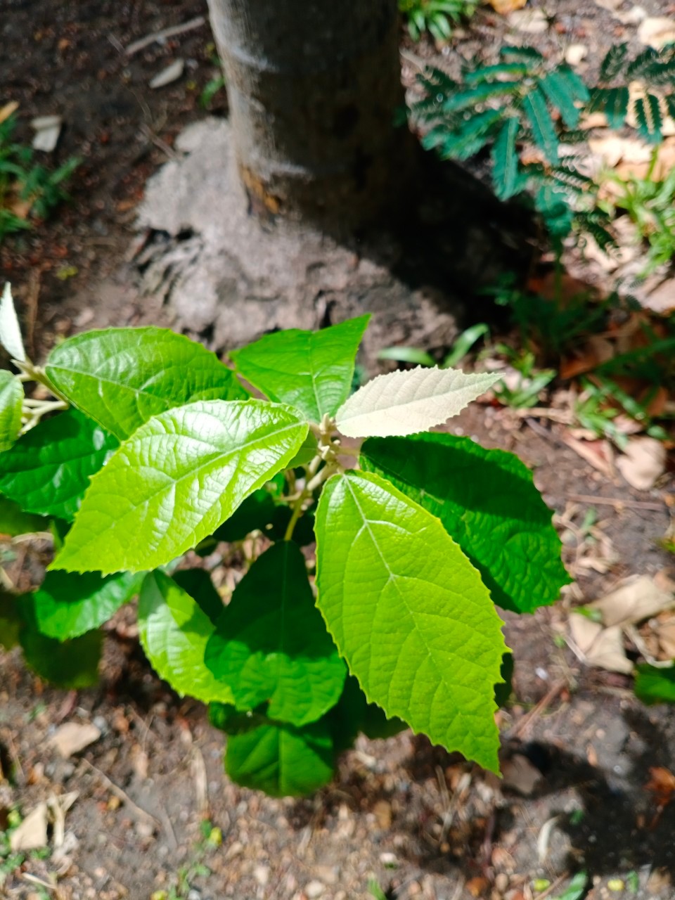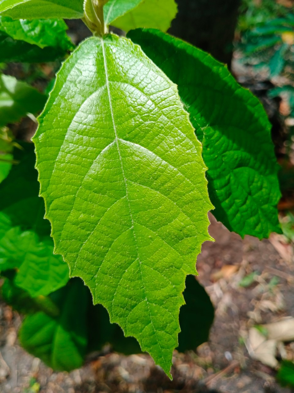 | ลักษณะใบ | ใบเป็นรูปไข่หรือรูปวงรี ปลายใบแหลม โคนใบสอบมน หรือเป็นรูปทรงกลมแคบ ส่วนขอบใบหยักและไม่สม่ำเสมอ แผ่นใบเป็นสีเขียวเข้ม ใบหนา ด้านบนของใบเกลี้ยง ส่วนแผ่นใบด้านล่างมีขนสีขาวจำนวนมาก ทำให้มองเห็นแผ่นใบเป็นสีขาวหรือสีเงิน มีเส้นใบข้างละประมาณ 4-5 คู่ ก้านใบมีขน ส่วนหูใบเป็นรูปใบหอก มีขนาดประมาณ 3 มิลลิเมตร ที่ฐานมีต่อม 1 ต่อม |