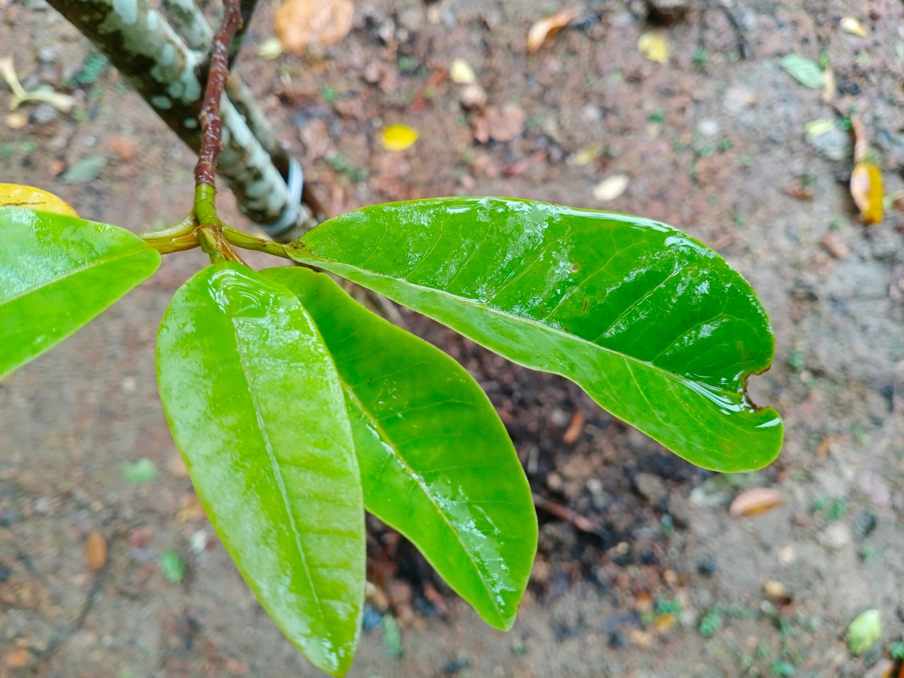 | ลักษณะใบ | ใบรูปรี โคนใบมนกลม หรือรูปลิ่ม ปลายใบมนทู่ถึงแหลม ผิวใบด้านบนมีขนเล็กน้อย สีเขียวอมเหลือง มีเส้นกลางใบนูนเล็กน้อย และมีเส้นแขนงใบเป็นร่อง ผิวใบด้านล่างสีอ่อนกว่าและมีขน มีเส้นกลางใบและเส้นแขนงใบนูนเด่น เนื้อใบหนา แข็งกรอบ ขอบใบเรียบ |