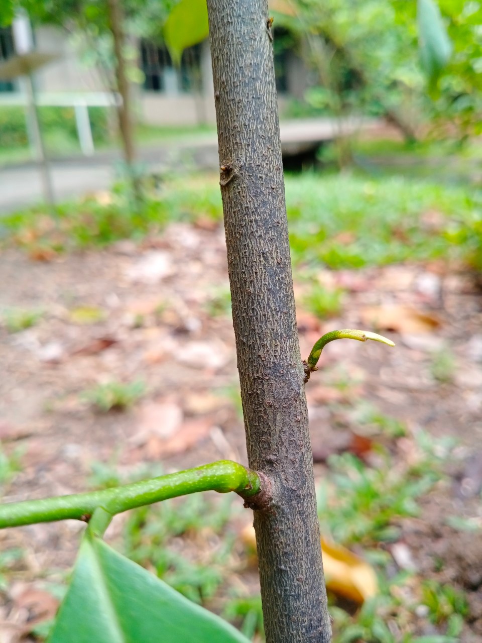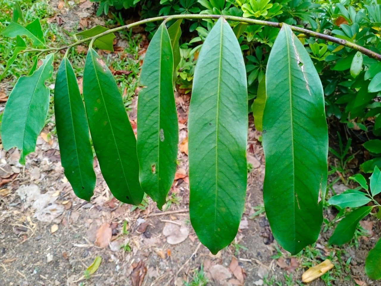 | ลักษณะใบ | ใบเดี่ยวเรียงสลับสองข้างกิ่งในระนาบเดียวกัน แผ่นใบรูปขอบขนานแกมรูปไข่กลับ ปลายเรียวแหลม โคนใบสอบ ใบด้านบนสีเขียวเข้มเป็นมัน ด้านล่างสีอ่อนกว่า ก้านใบยาว |