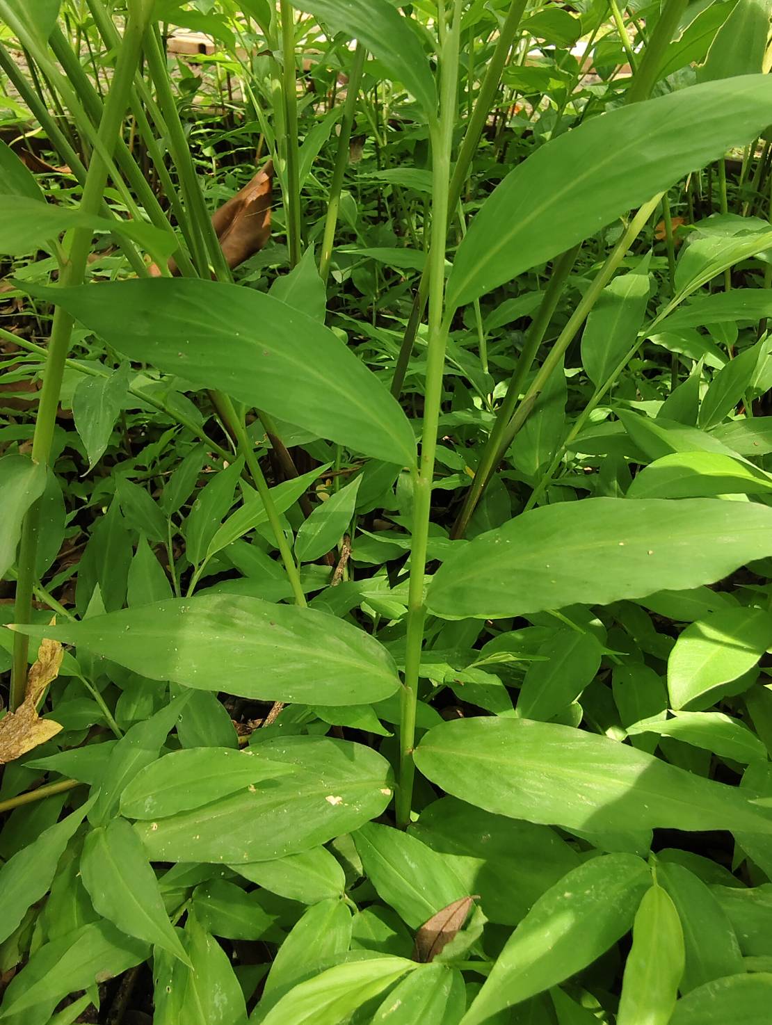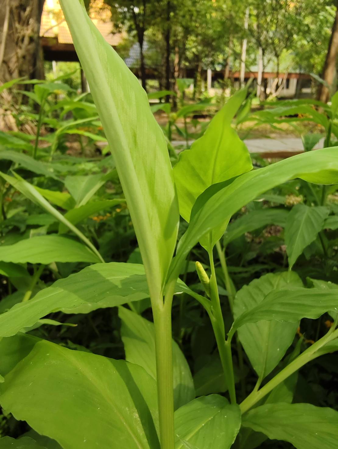| ลักษณะใบ | ใบเดี่ยวเรียงสลับระนาบเดียว รูปรีแกมรูปใบหอก โคนใบสอบ ปลายใบแหลมถึงเรียวแหลม เห็นเส้นใบชัดเจน ก้านใบแผ่เป็นกาบสีเขียว โคนกาบใบมีสีแดงเรื่อ |