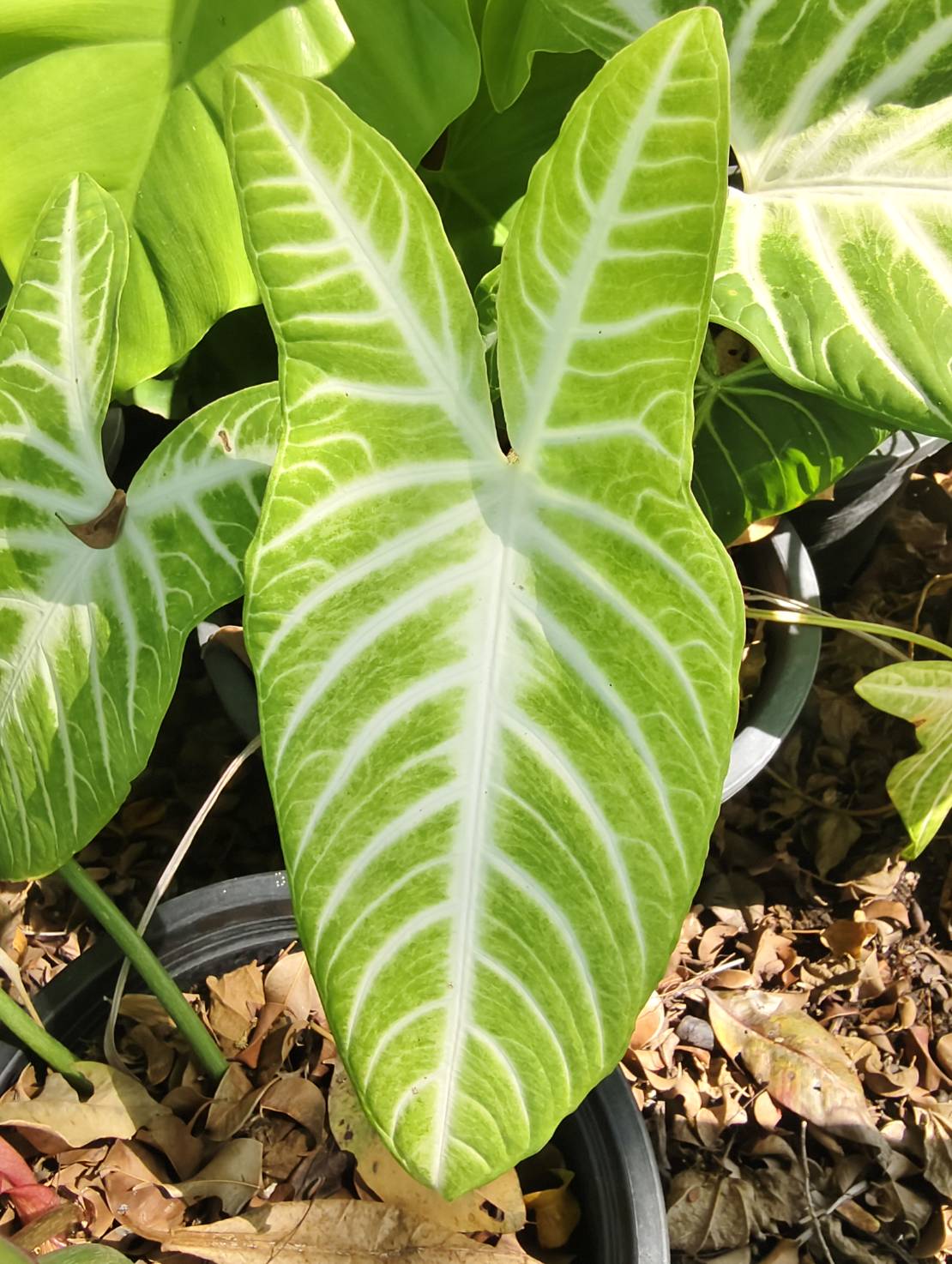 | ลักษณะใบ | ใบเป็นรูปหัวใจ มีขนาดใหญ่ หนา มีลายสีขาวเหมือนก้างปลา |