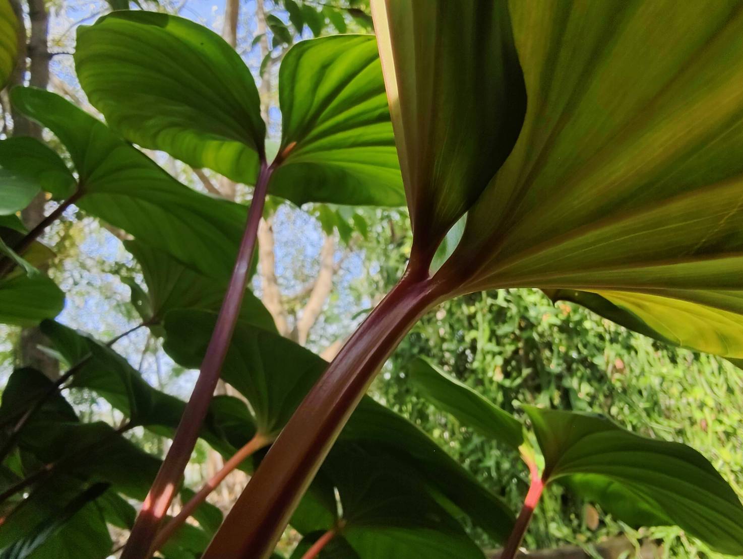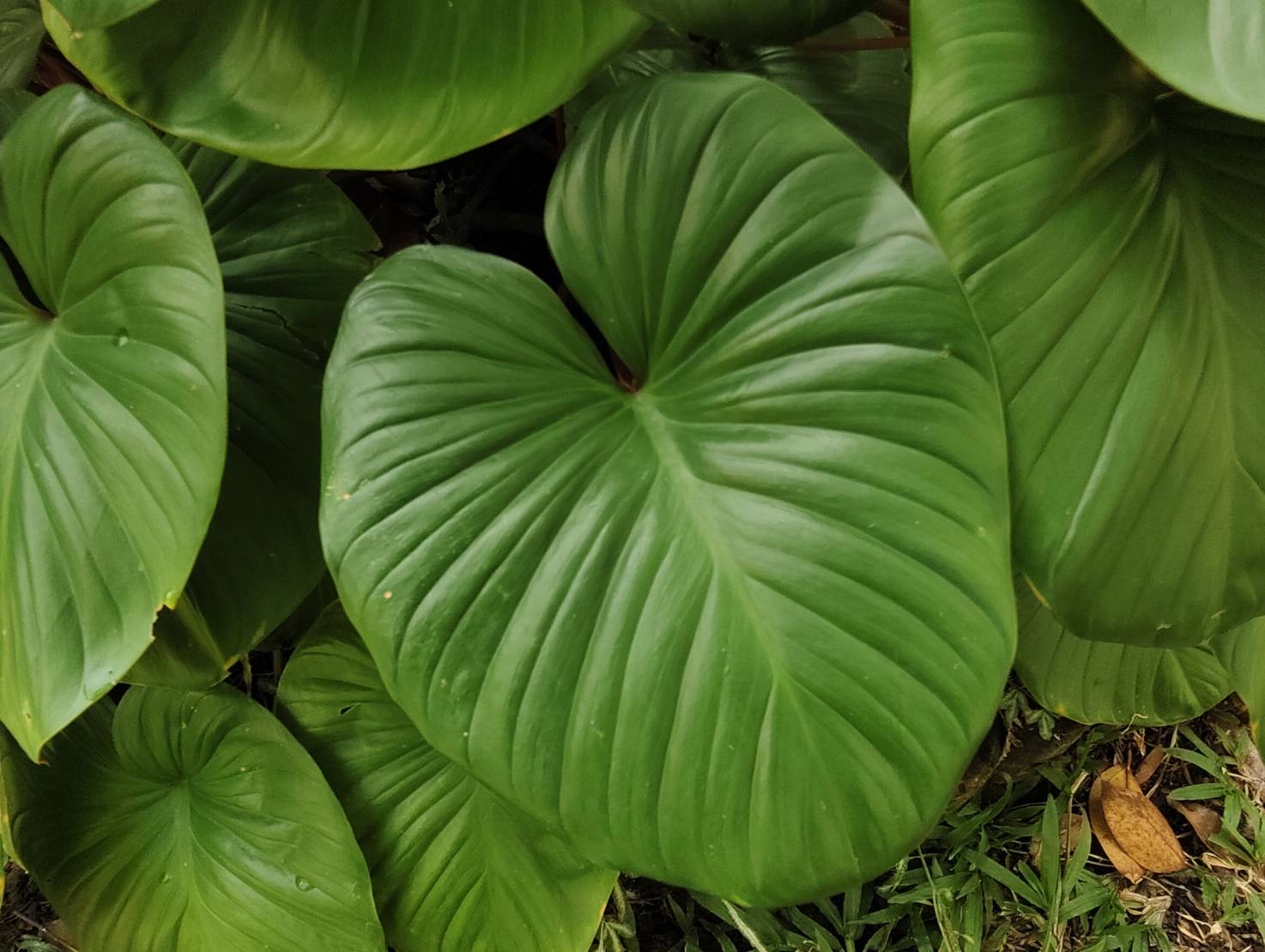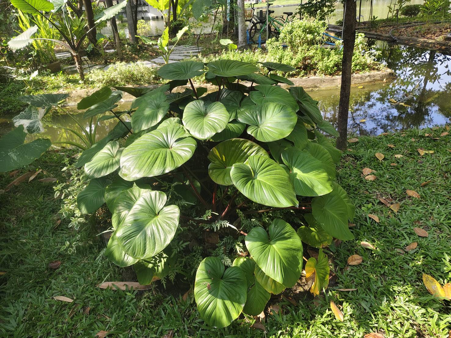 | ลักษณะใบ | รูปร่างใบดูคล้ายหัวใจขนาดใหญ่ มีร่องเว้าลึกตรงจุดที่เชื่อมต่อกับก้านใบ ขอบใบเป็นลอนคลื่นบางๆ โคนใบกว้างป้าน ปลายใบแคบและโค้งมน เส้นใบจะเป็นร่องเล็กที่แตกจากแกนกลางใบไปจนจรดขอบใบ เนื้อใบอ่อนนิ่มมีสีเขียวสด ก้านใบเป็นทรงกลมสีอมแดง |