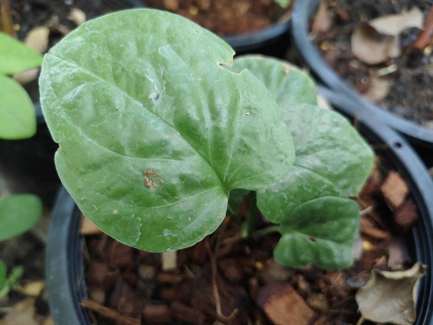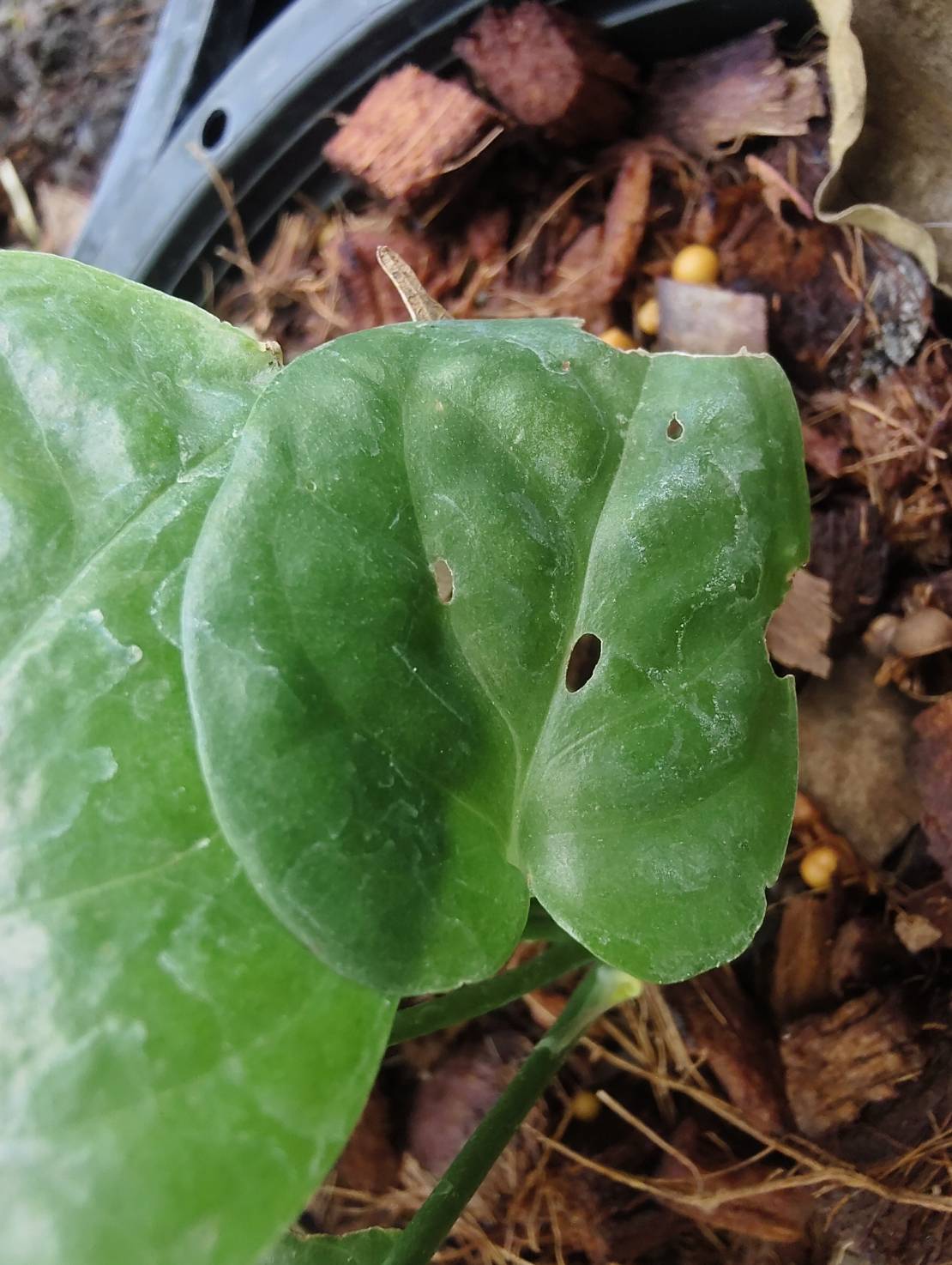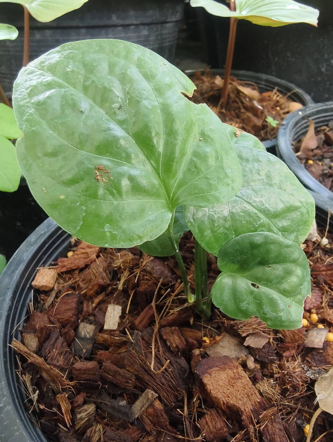 | ลักษณะใบ | รูปทรงใบคล้ายกับรูปหัวใจ โคนใบกว้างและปลายใบเรียวแหลม ก้านใบยาว เนื้อใบเรียบเกลี้ยงมีสีเขียวสด ขอบใบมีรอยเว้าแหว่งลึกจนเกือบถึงแกนกลางใบ ตำแหน่งและรูปแบบของรอยแหว่งไม่แน่นอน แต่จะเพิ่มจำนวนมากขึ้นตามขนาดของใบเสมอ หากบำรุงดีพอก็สามารถแตกใบใหม่ได้ทุกสัปดาห์ |
