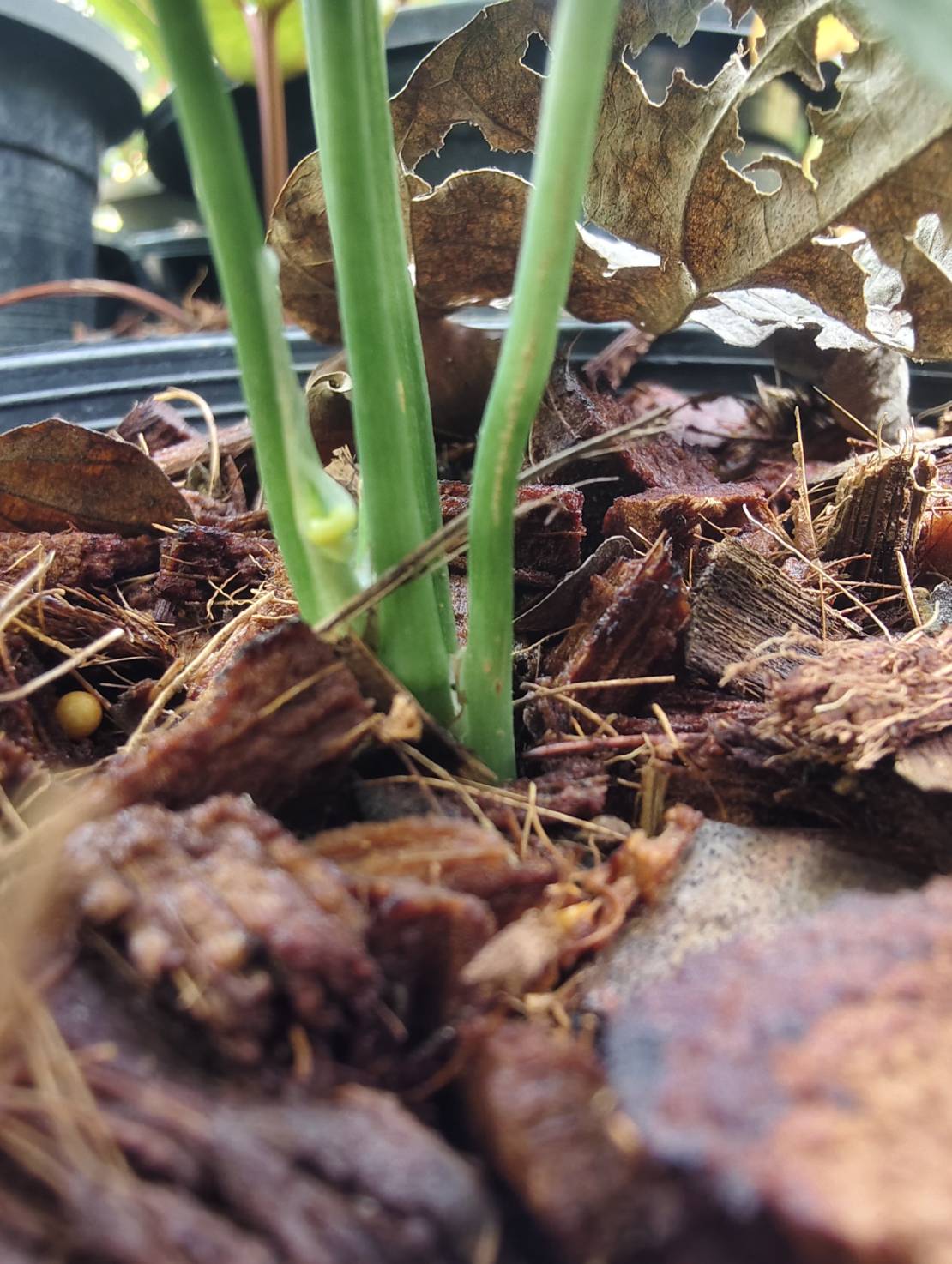 | ลักษณะวิสัย | เป็นไม้เลื้อยที่เติบโตได้ดีในบริเวณที่มีความชื้นสูง ลำต้นเป็นเถายาวทรงกลมสีเขียวเข้ม แบ่งเป็นข้อปล้องให้เห็นชัดเจน แต่ละข้อปล้องจะมีรากอากาศสั้นๆ งอกออกมา อัตราการเติบโตค่อนข้างเร็วเมื่อเทียบกับสายพันธุ์ใบใหญ่ |