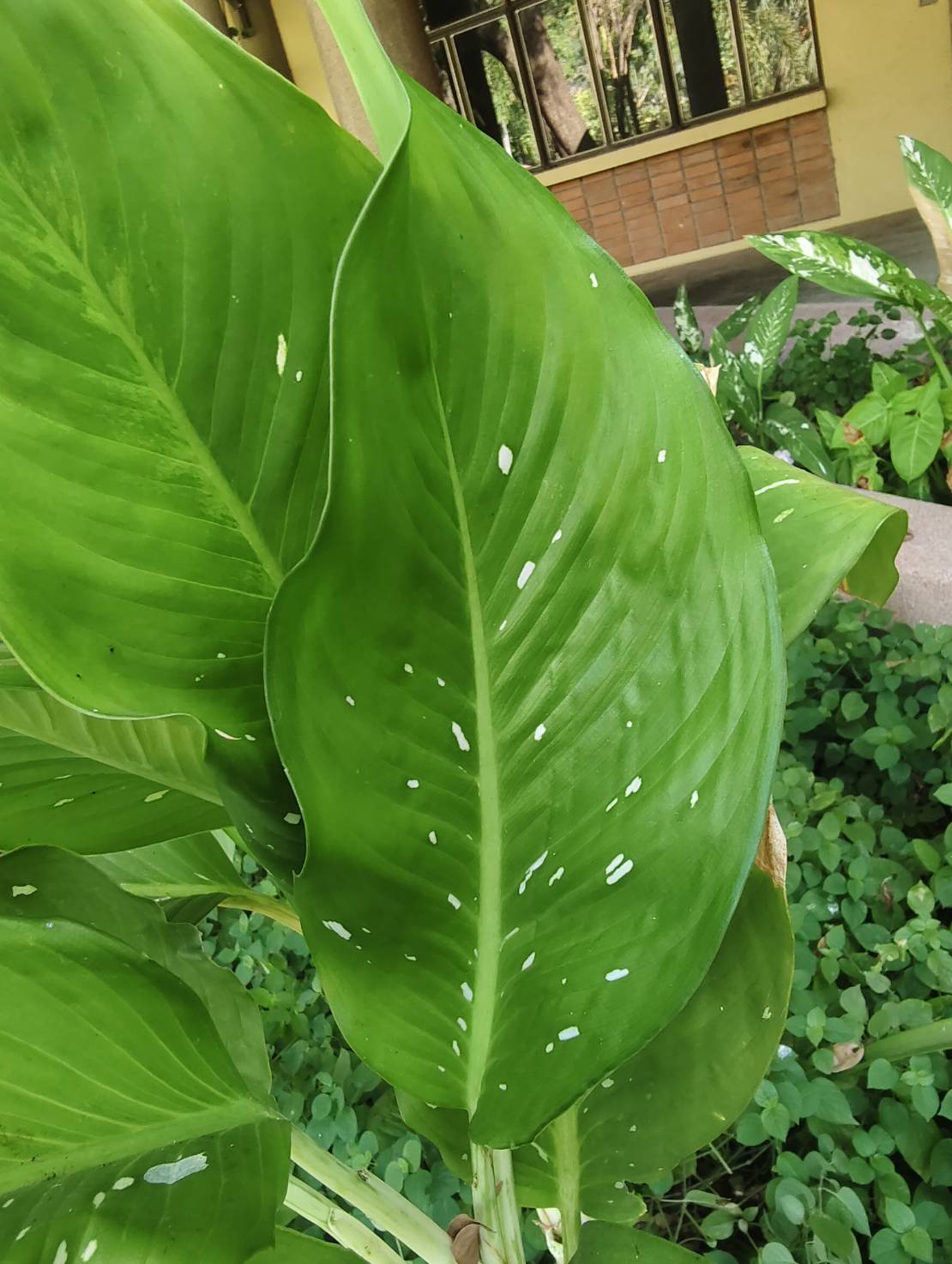 | ลักษณะใบ | ใบเดี่ยว เรียงเวียนสลับ รูปรีแกมรูปขอบขนาน โคนใบมน ปลายใบแหลม ใบสีเขียว มีจุดสีขาวกระจายอยู่ทั่วใบ ก้านใบสีขาว |