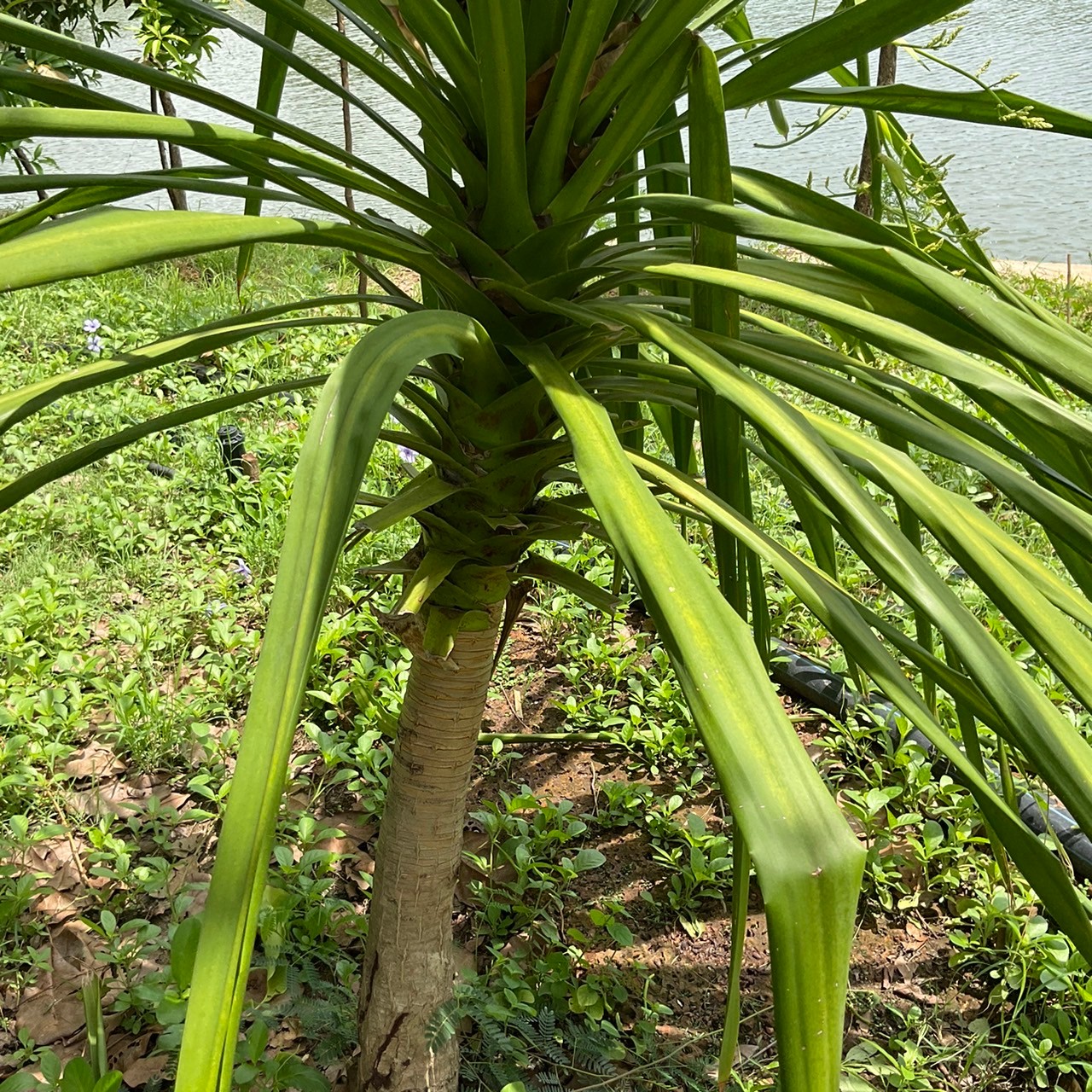| ลักษณะใบ | ใบเป็นใบเดี่ยวออกเรียงสลับกับถี่ ๆ ที่ปลายกิ่ง ลักษณะของใบเป็นรูปยาวรีขอบขนาน หรือเป็นรูปแถบยาวแคบ ปลายใบเรียวแหลม โคนใบแผ่เป็นกาบหุ้มลำต้น ขอบใบเรียบ กว้างประมาณ 4-5 เซนติเมตร ยาวประมาณ 45-80 เซนติเมตร เนื้อใบหนากรอบ โคนใบจะติดกับลำต้นหรือโอบคลุมลำต้น ไม่มีก้านใบ |