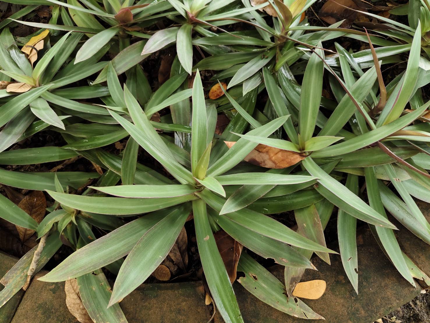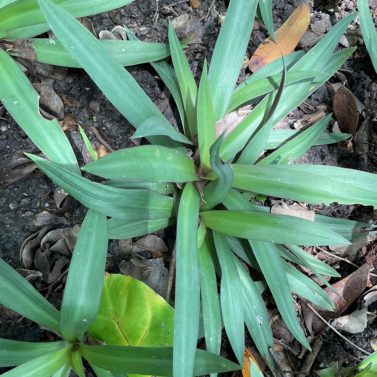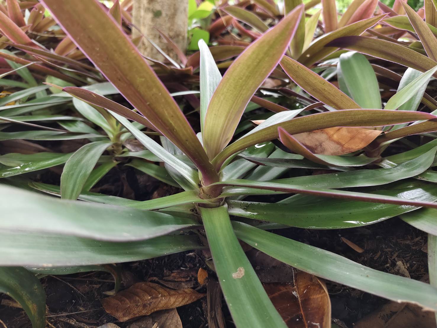 | ลักษณะใบ | ใบออกจากลำต้น ออกเรียงเป็นวงซ้อนกันหลายชั้น ใบเป็นใบเดี่ยว ลักษณะใบเป็นรูปหอกยาว หรือรูปแกมขอบชนานปลายแหลม ปลายใบแหลม โคนใบตัดและโอบลำต้น ขอบใบเรียบ แผ่นใบหนาและตั้งตรง ใบกว้างประมาณ 2-6 เซนติเมตร ยาวประมาณ 10-30 เซนติเมตร หน้าใบเป็นสีเขียวเข้ม ส่วนหลังใบเป็นสีม่วงแดง ไม่มีก้านใบ |