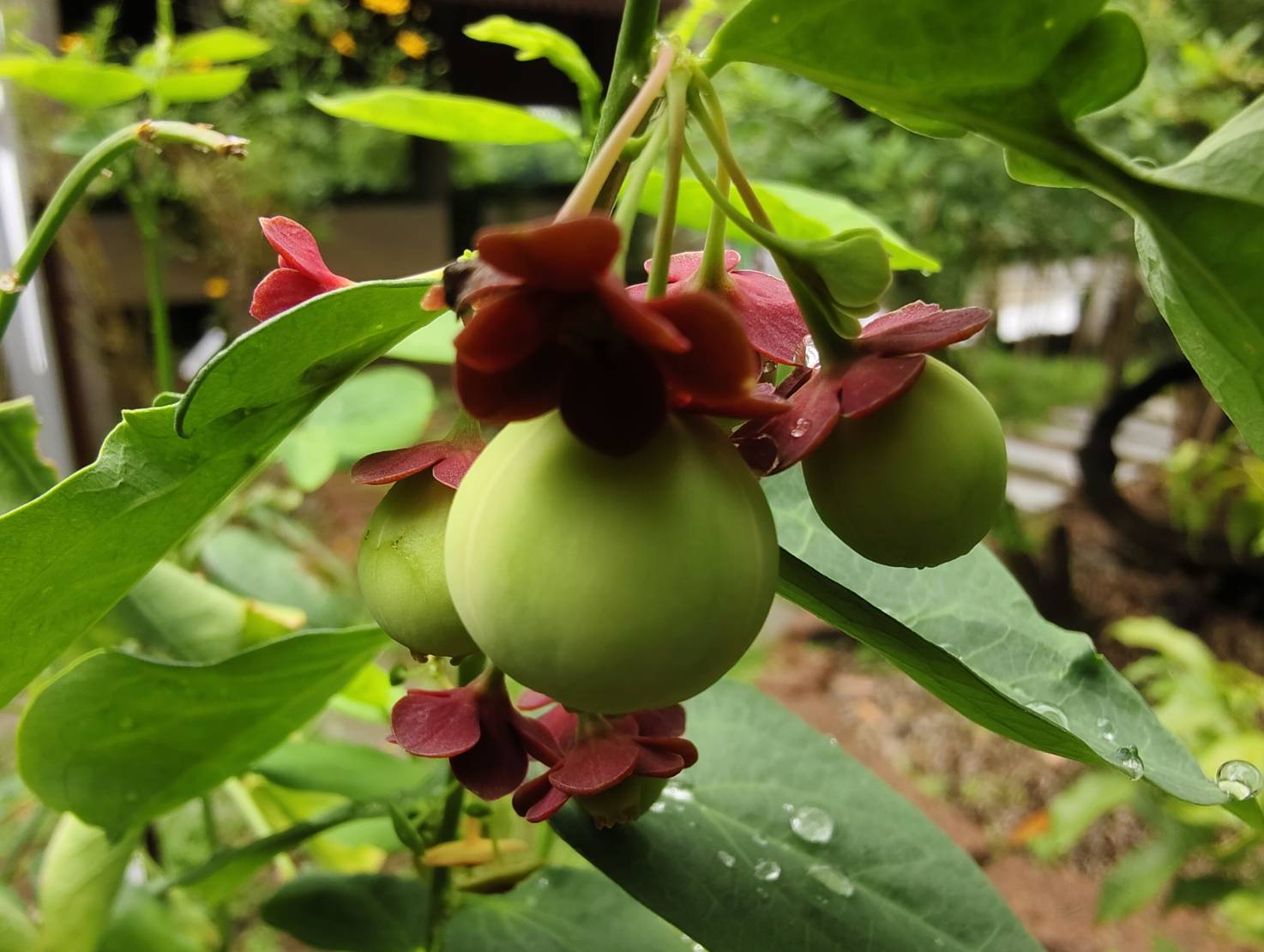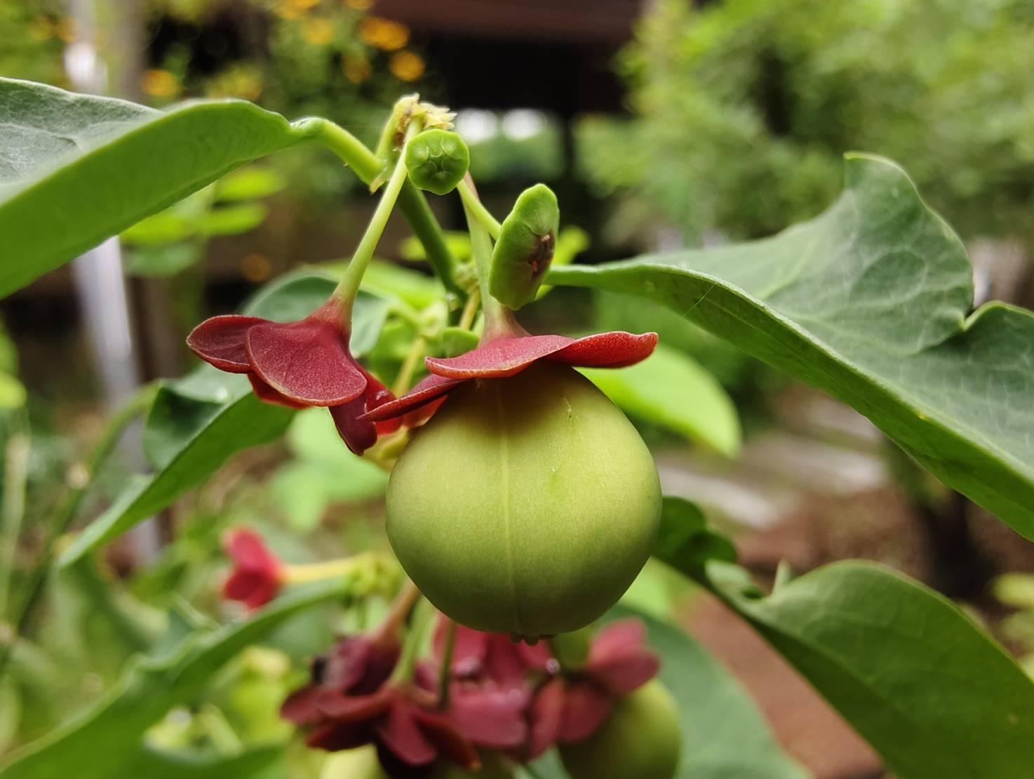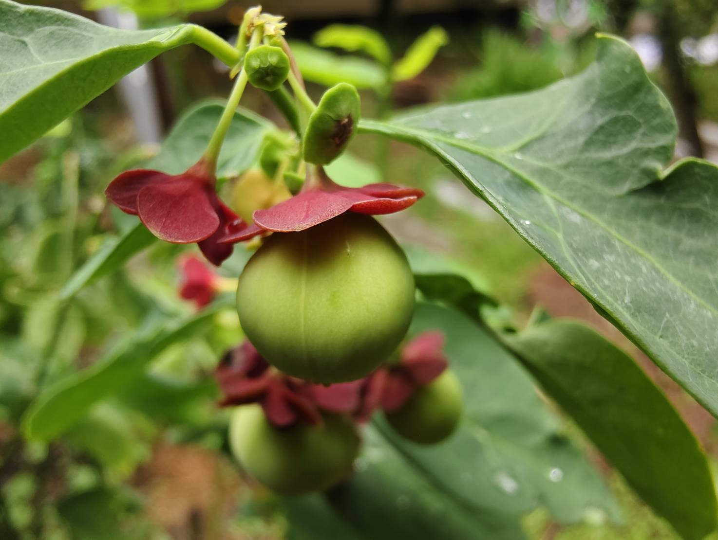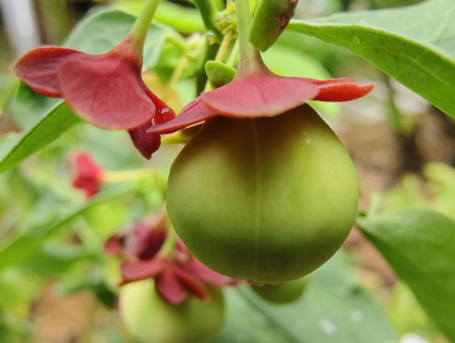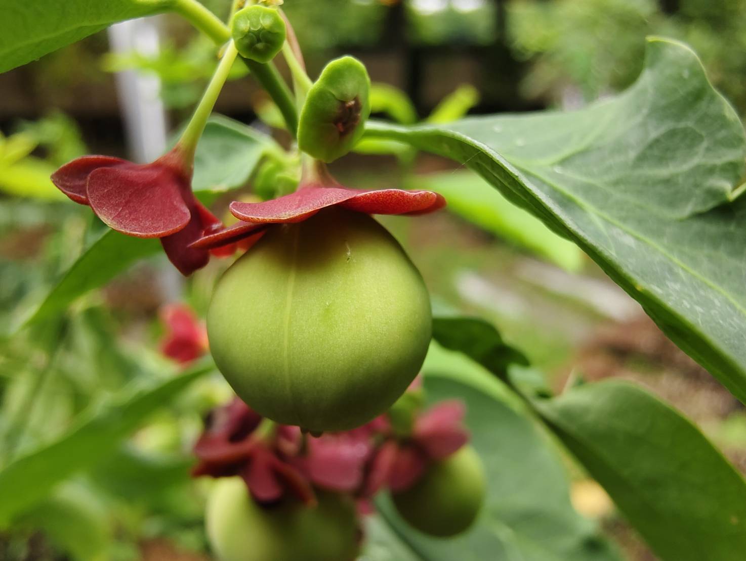 | ลักษณะผล | ผลเป็นผลเดี่ยว ผลห้อยลงด้านล่างใต้ก้านใบหลัก หรือใต้ใบย่อย ผลมีลักษณะกลมและแผ้นเล็กน้อย คล้ายผลมะยม ขนาดเล็กกว่า ขนาดผลกว้าง 1-1.5 เซนติเมตร ยาว 0.8-1.2 เซนติเมตร ที่ขั้วผลมีกลีบเลี้ยงสีแดงติดอยู่ ท้ายผลด้านล่างมีติ่งสีแดงขนาดเล็ก 3 ติ่ง เปลือกผลเรียบ หนา แบ่งเป็นร่องพูเล็กๆพอมองเห็นได้ 3 พู แต่มี 6 ร่องเมื่อปริแตก ผลอ่อนมีสีเขียวอ่อน ผลสุกมีสีขาวอมชมพู |