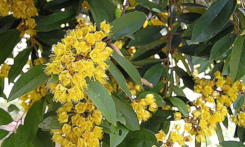 | ลักษณะดอก | ดอกมีกลิ่นหอมตลอดทั้งวัน บานได้นาน 7-10 วัน ช่อดอกดก เกิดตามซอกใบ เป็นช่อสั้น โคนกลีบเลี้ยงเชื่อมติดกัน ปลายแยกออกเป็น 5 แฉกคล้ายรูปดาว ไม่มีกลีบดอก มีเกสรตัวผู้จำนวนมาก ซึ่งเป็นส่วนที่มองเห็นเป็นสีเหลือง ติดดอกช่วงเดือนกรกฎาคมถึงสิงหาคม |
