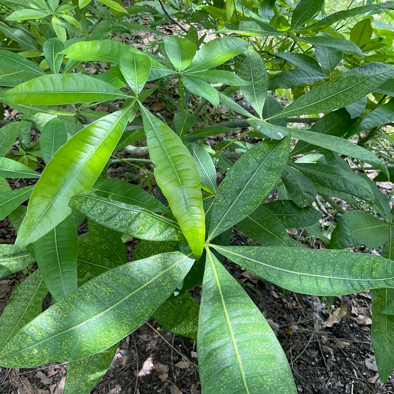 | ลักษณะใบ | ออกเป็นช่อที่ปลายยอด มีลักษณะเป็นแฉกคล้ายรูปวงกลม ในแต่ละก้านจะประกอบไปด้วยใบย่อย ประมาณ 5-7 ใบ ใบย่อยมีลักษณะเป็นรูปทรงไข่ยาว ปลายใบและโคนใบแหลม แผ่นใบเรียบ มีสีเขียวเข้มเป็นมัน ขอบใบเรียบ |