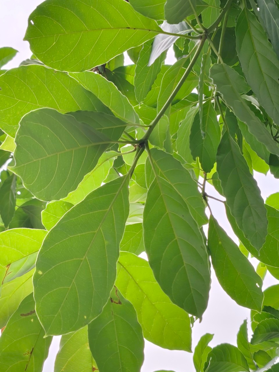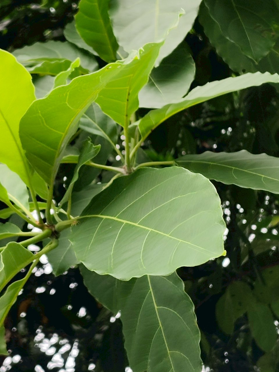 | ลักษณะใบ | ใบเป็นใบเดี่ยวออกเรียงสลับกับตั้งฉาก ใบมักออกรวมกันที่ปลายกิ่ง ลักษณะใบเป็นรูปรีหรือรูปไข่กลับ ปลายใบในหรือแหลม ยาว 8-17 เซนติเมตร หลังใบเป็นสีเขียวมัน ท้องใบมีสีอ่อนกว่า ใบแก่จะบางและเหนียว ผิวใบด้านบนมีขนสากขึ้นประปราย ด้านล่างมีขนนุ่ม |