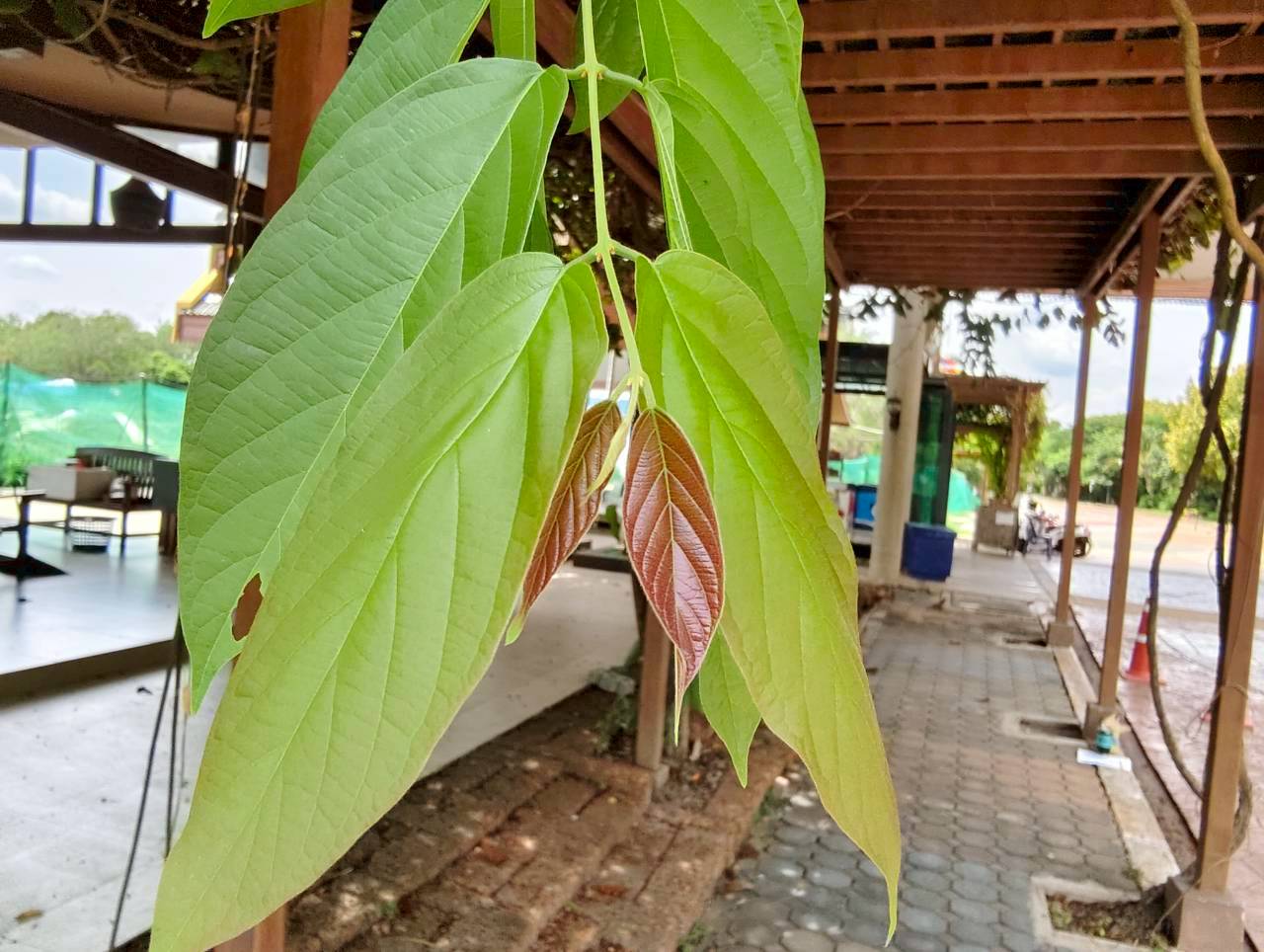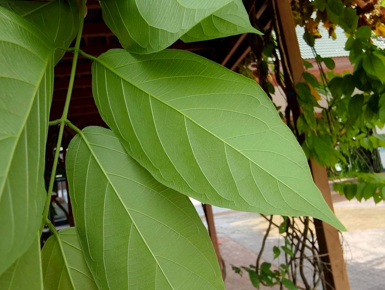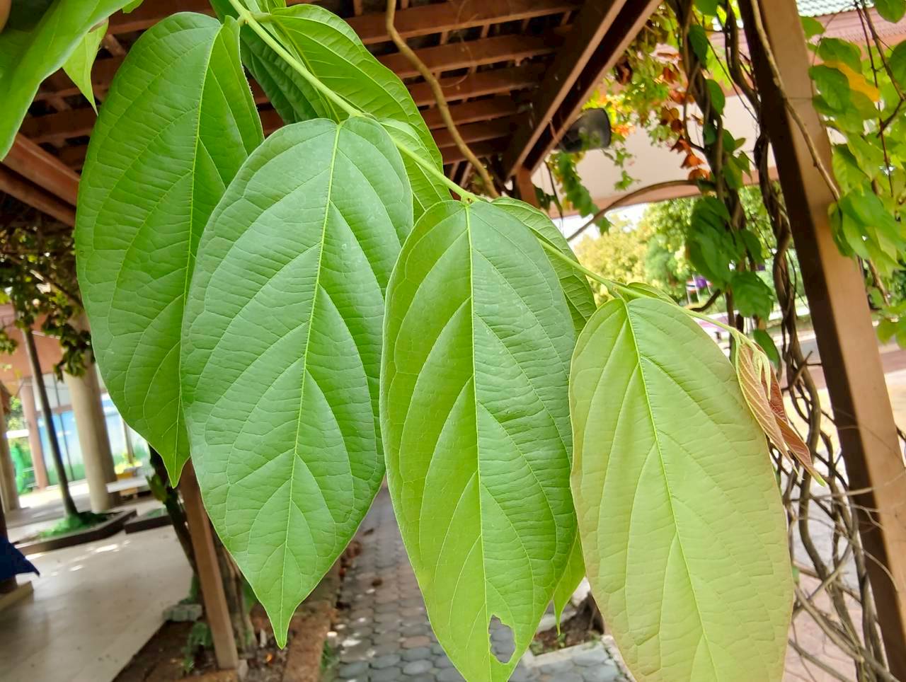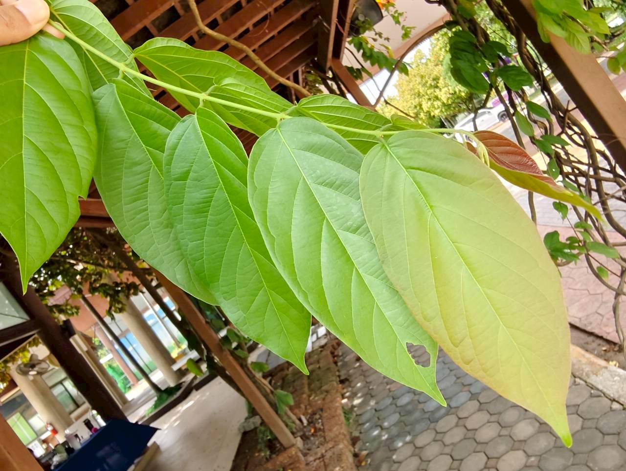 | ลักษณะใบ | ใบเป็นใบเดี่ยว ออกตรงข้ามกันเป็นคู่ ๆ ใบเป็นรูปมนขอบขนานหรือรูปใบหอก ปลายใบแหลมหรือมนและมีติ่งแหลม โคนใบจักเว้าเข้าเล็กน้อย ขอบใบเรียบหรือเป็นคลื่น แผ่นใบเป็นสีเขียว เนื้อบาง ท้องใบมีขนปกคลุมเป็นจำนวนมาก ใบอ่อนสีเขียวอมแดง เนื้อใบค่อนข้างเหนียว |