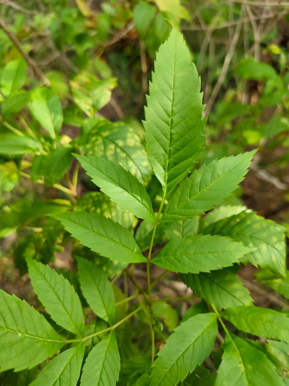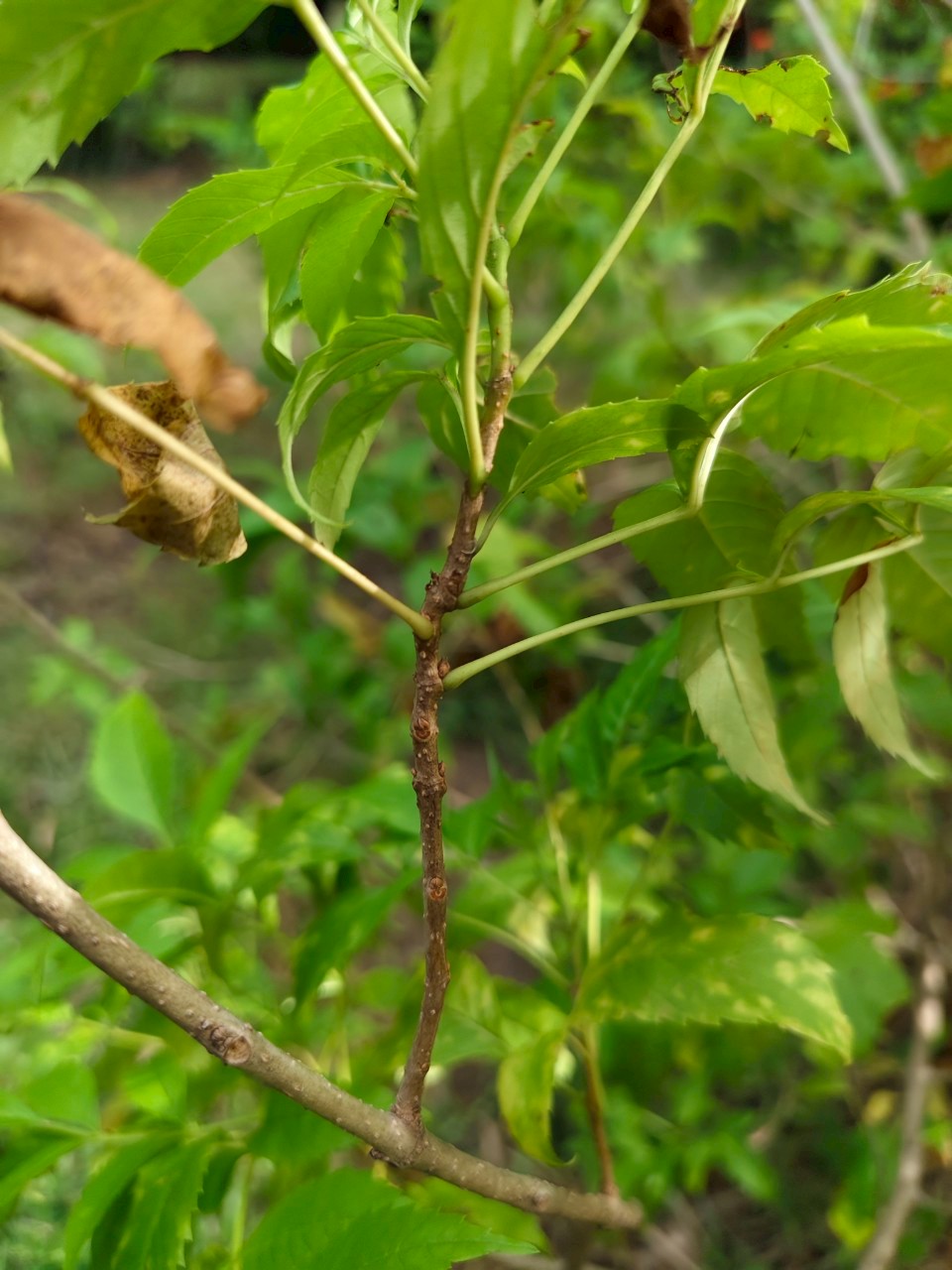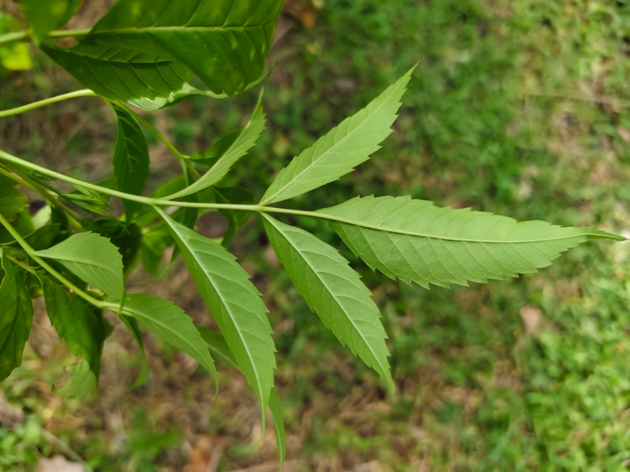 | ลักษณะใบ | ใบเป็นใบประกอบแบบขนนก ปลายคี่ เรียงตรงข้ามกัน ใบย่อย 5-13 ใบ ใบย่อยเป็นรูปใบหอกหรือรูปไข่แกมรูปขอบขนาน ปลายใบแหลม โคนใบสอบ ใต้ใบมีขนละเอียด |
