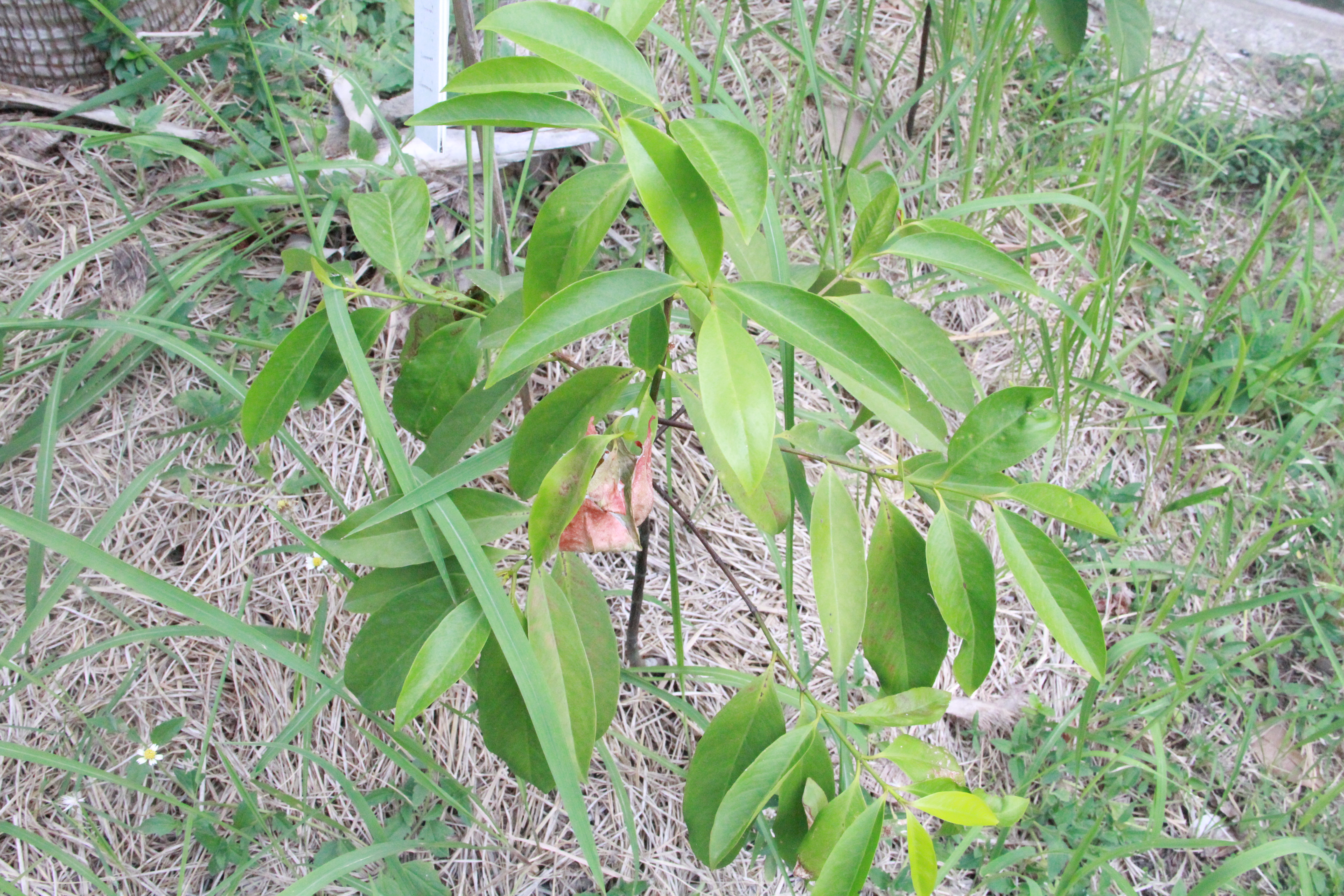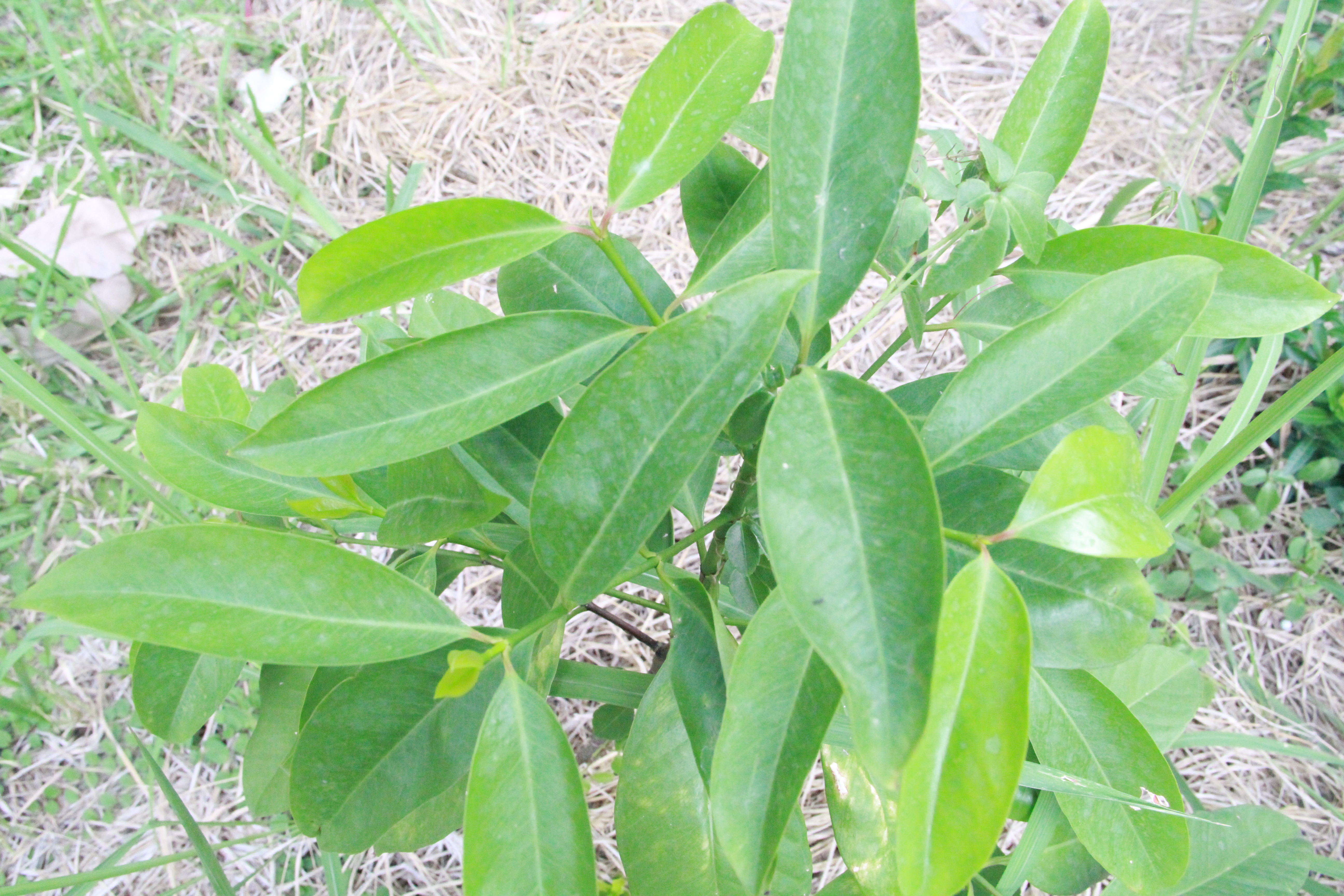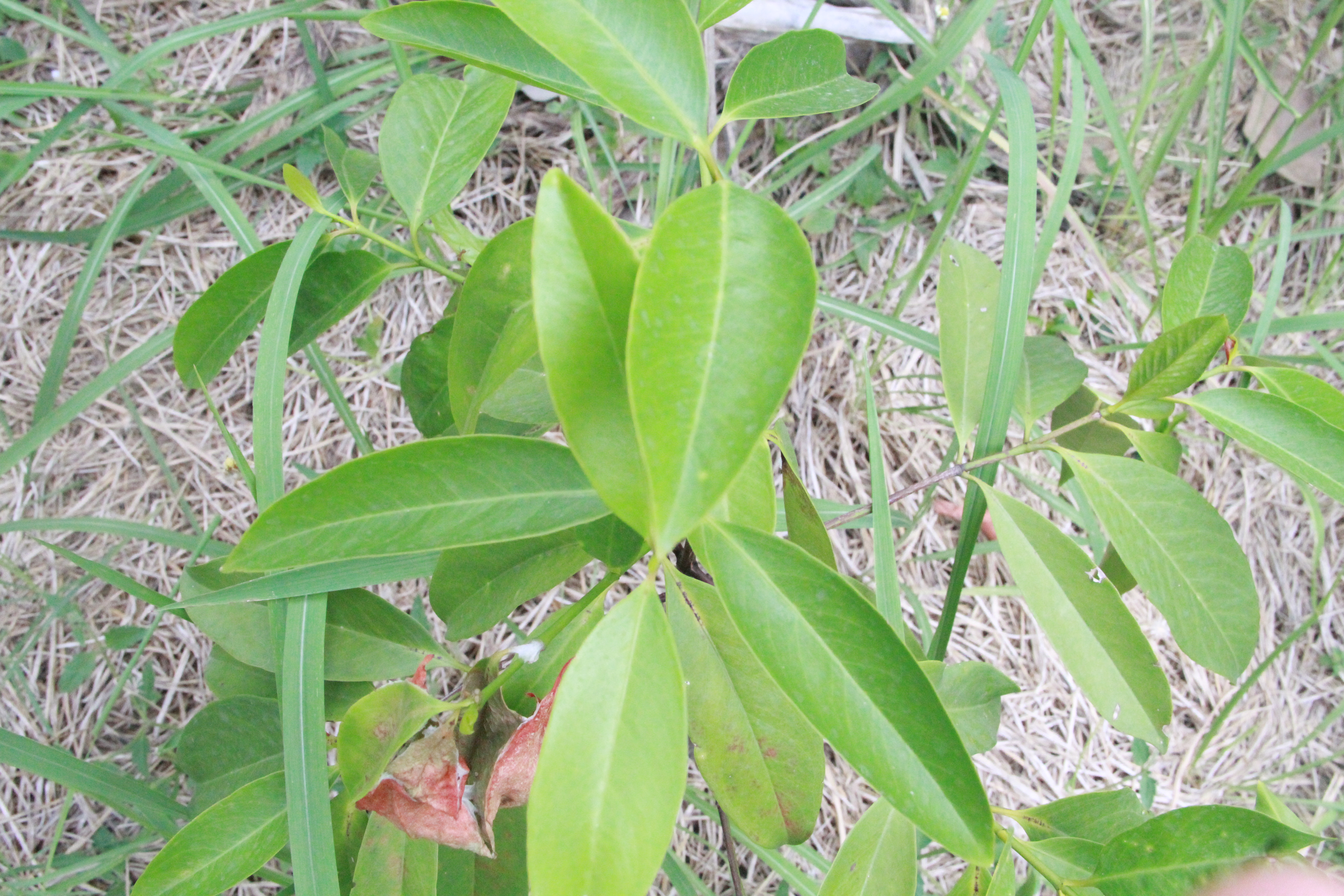 | ลักษณะใบ | ใบเป็นใบเดี่ยว ออกเรียบสลับตรงข้ามกัน ใบเป็นรูปรีแกมใบหอกหรือแกมขอบขนาน โคนใบสอบแหลม ปลายใบป้านหรือแหลมเล็กน้อย ขอบใบเรียบ ใบอ่อนเป็นสีเขียวอ่อนหรือเขียวอมสีม่วงแดง ส่วนใบแก่เป็นสีเขียวเข้ม บริเวณปลายกิ่งมักแตกเป็น 1-3 ยอด หลังใบเรียบลื่นเป็นมัน ท้องใบเรียบ เนื้อใบค่อนข้างหนาและเปราะ |