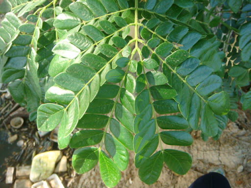 | ลักษณะใบ | ใบเป็นใบประกอบแบบขนนกสองชั้น ปลายคู่ เรียงสลับ ใบย่อยเรียงตรงข้าม มี 2-10 คู่ ใบรูปไข่รูปรีหรือคล้ายรูปสี่เหลี่ยมขนมเปียกปูน กว้าง 1-2.5 เซนติเมตร ยาว 1.5-5 เซนติเมตร ปลายใบแหลม โคนใบบิดเบี้ยว ผิวใบด้านบนสีเขียวเข้มเป็นมัน ด้านล่างมีขนนุ่ม ขอบใบเรียบ |