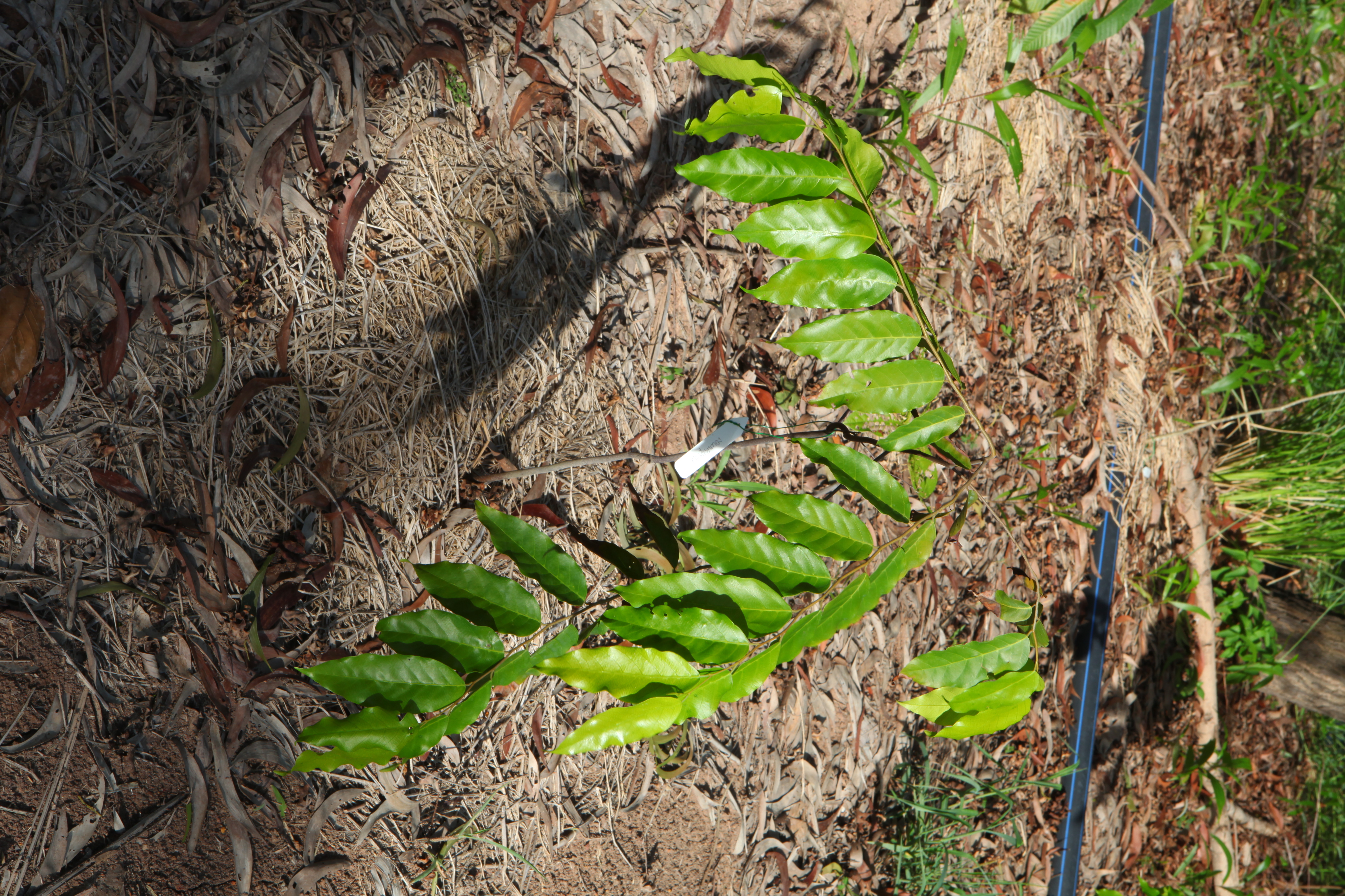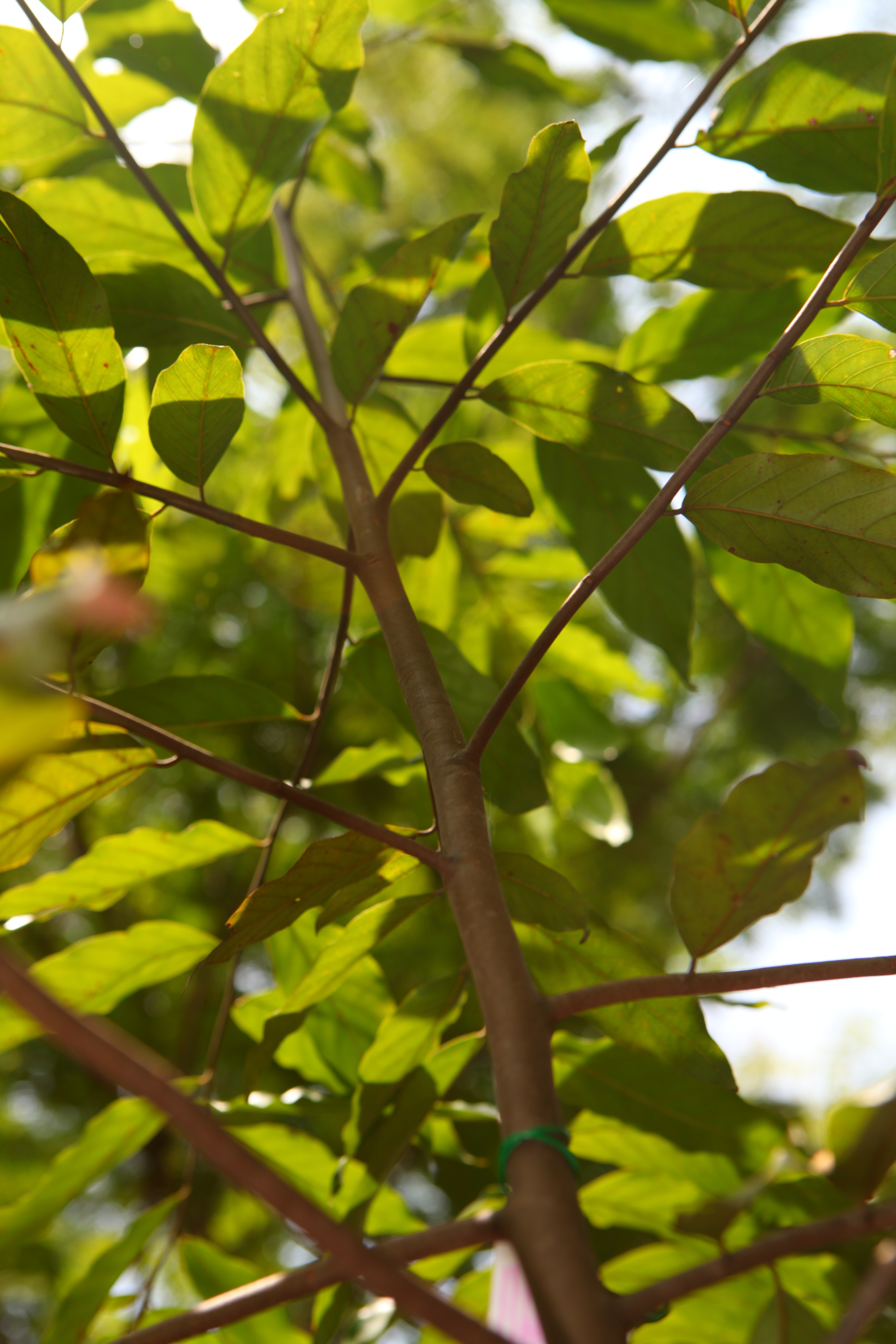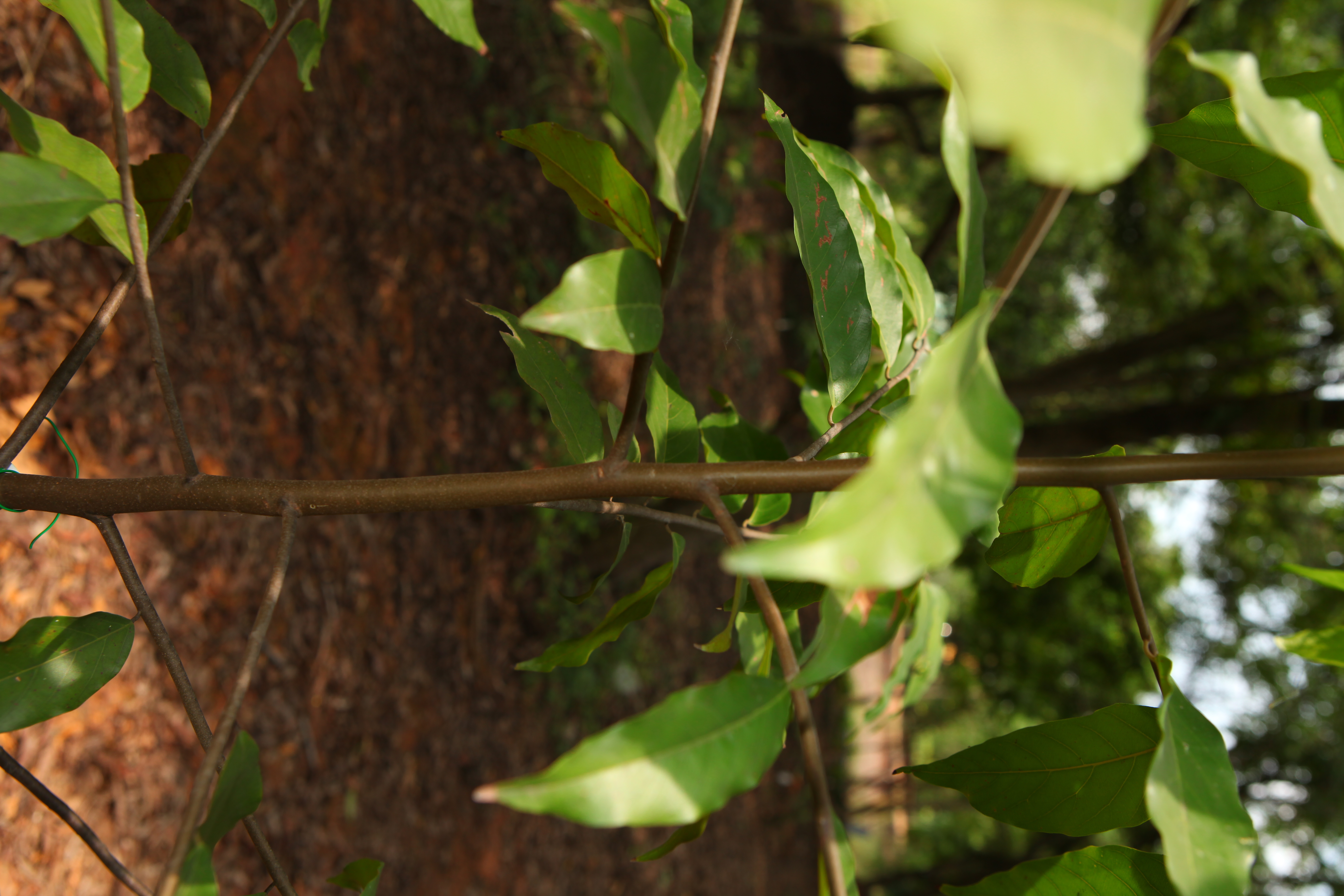 | ลักษณะใบ | ใบเป็นใบเดี่ยว ใบเป็นรูปไข่แกมหอกหรือดาบ ปลายใบเรียว โคนใบมน ป้านและเบี้ยว ใบกว้างประมาณ 3-6 เซนติเมตร ยาวประมาณ 10-15 เซนติเมตร แผ่นใบบางแต่ค่อนข้างเหนียว หลังใบเกลี้ยงเป็นมัน ท้องใบมีตุ่มหูดเกลี้ยง ๆ อยู่ตามง่ามแขนงของใบ ปลายโค้งแต่ไม่จรดกัน |