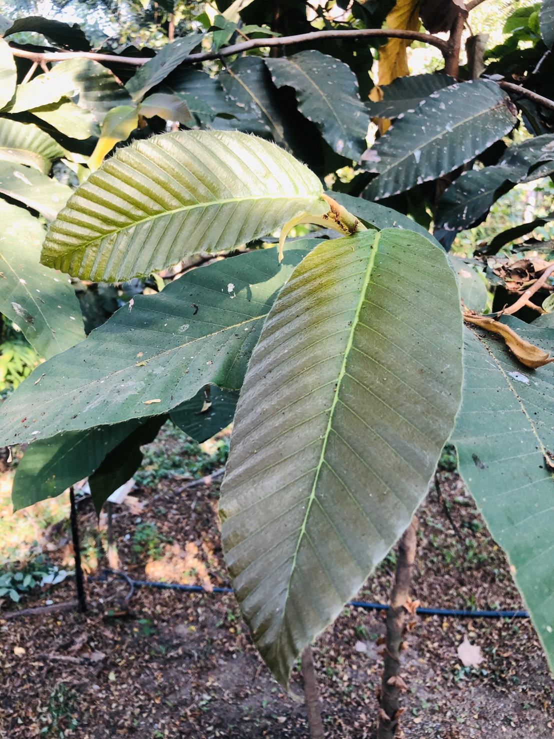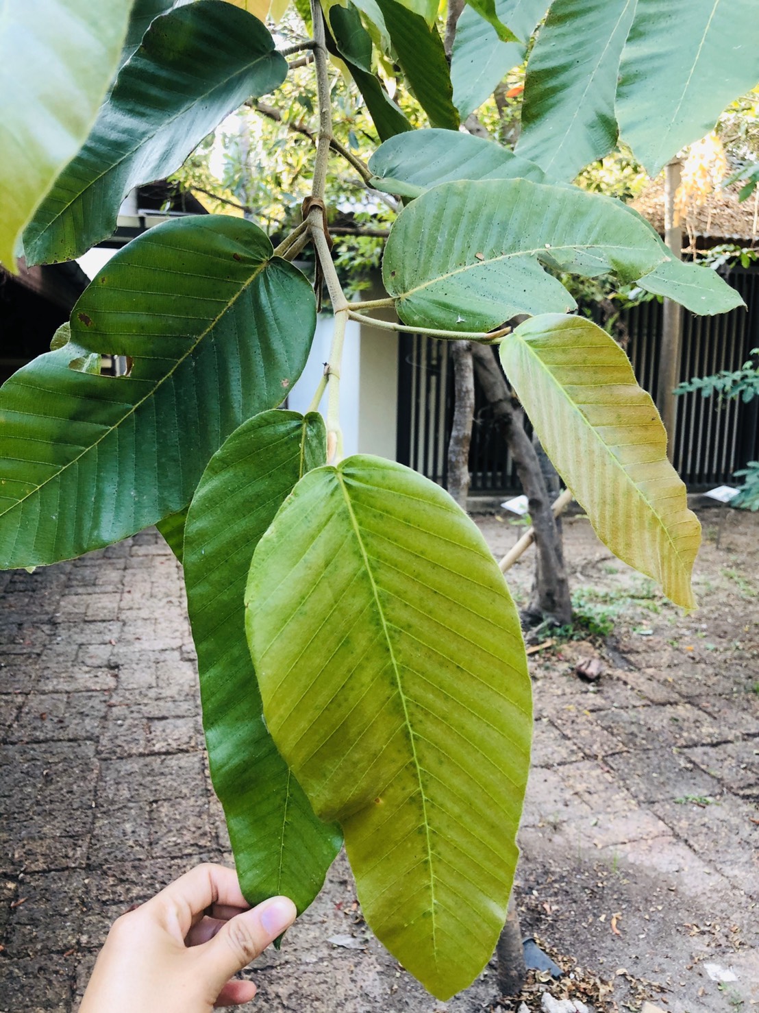 | ลักษณะใบ | ใบเป็นใบเดี่ยว ออกเรียงเวียนสลับ ใบเป็นรูปไข่แกมรูปขอบขนาน ปลายใบสอบทู่ โคนใบกว้าง ส่วนขอบใบเป็นคลื่นเล็กน้อย ใบมีขนาดกว้างประมาณ 6-14 เซนติเมตร ยาวประมาณ 12.5-25 เซนติเมตร เนื้อใบหนาและเหนียว ย่นเป็นลอน แผ่นใบมีขนปกคลุม ใบอ่อนมีขนสีเทา ใบแก่เกลี้ยงหรือเกือบเกลี้ยง มีหูใบขนาดใหญ่ |
