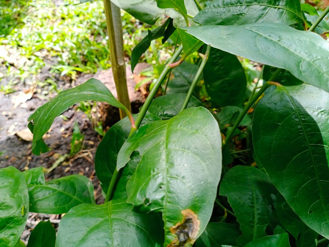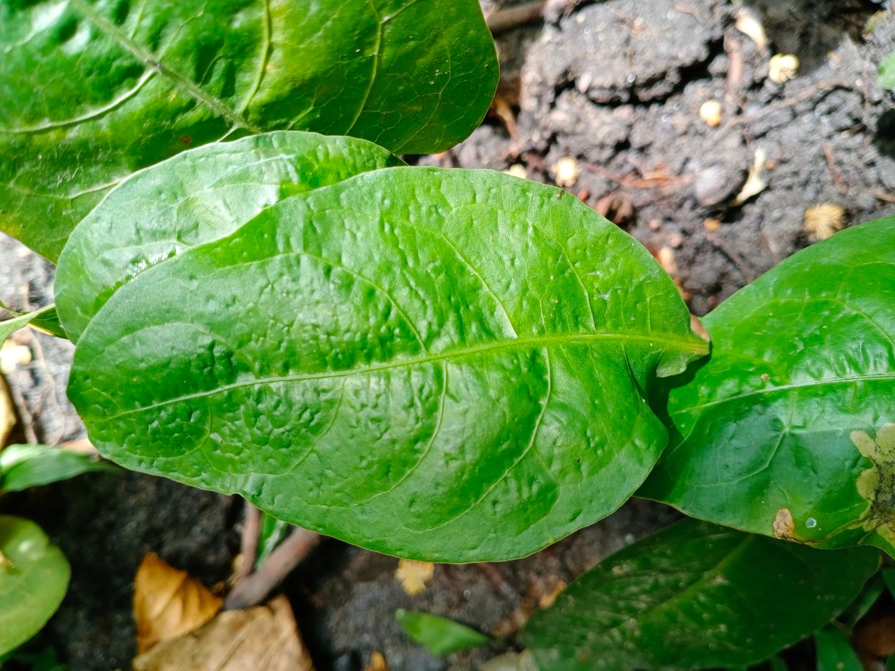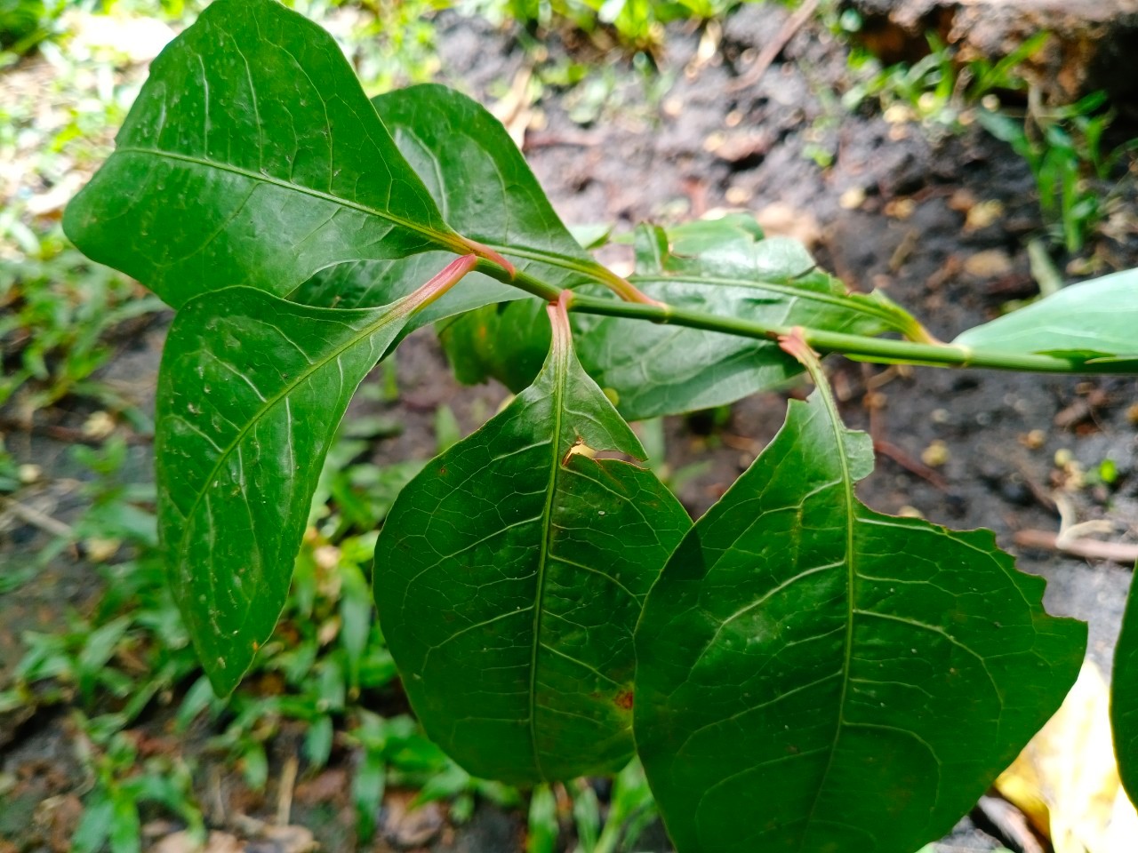 | ลักษณะใบ | ใบเป็นใบเดี่ยวออกเรียงสลับกัน ใบเป็นรูปไข่ ปลายใบแหลม โคนใบมน ขอบใบเป็นคลื่น ใบกว้างประมาณ 3-5 เซนติเมตร ยาวประมาณ 8-13 เซนติเมตร แผ่นใบบางเป็นสีเขียว แผ่นใบมักบิด ก้านใบและแกนกลางใบอ่อนเป็นสีแดง |