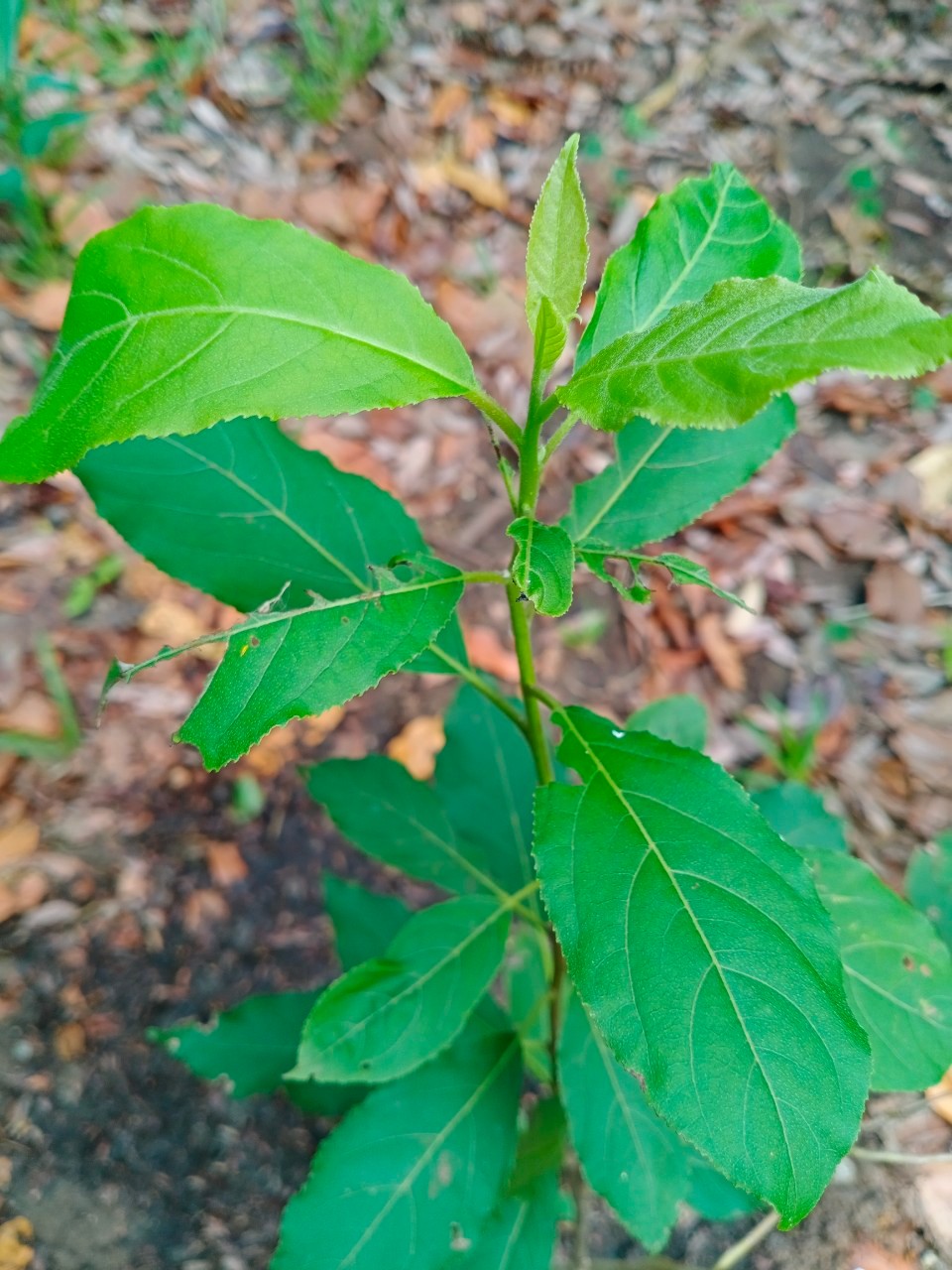 | ลักษณะใบ | ใบเป็นใบเดียว มีสีเขียว ขอบใบจัก ลักษณะใบสากมือ ออกเวียนสลับกันรอบลำต้น ปลายใบแหลม ขอบใบจักฟันเลื่อยถี่ |