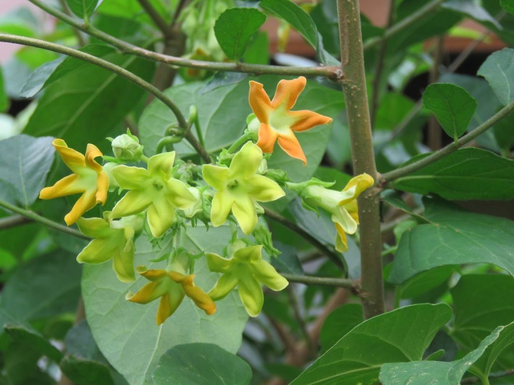 | ลักษณะดอก | ดอกออกเป็นช่อแบบกระจุกหรือออกเป็นพวงบริเวณซอกใบหรือโคนก้านใบ หนึ่งช่อจะมีดอกย่อยประมาณ 10-20 ดอก ดอกย่อยเป็นสีเขียวอมเหลือง ดอกมีกลื่นหอม กลีบดอกมี 5 กลีบ โคนกลีบดอกเชื่อมติดกันเป็นหลอดสั้น ๆ กลีบดอกย่นและบิด ปลายแยกเป็นแฉกแหลม 5 แฉก |