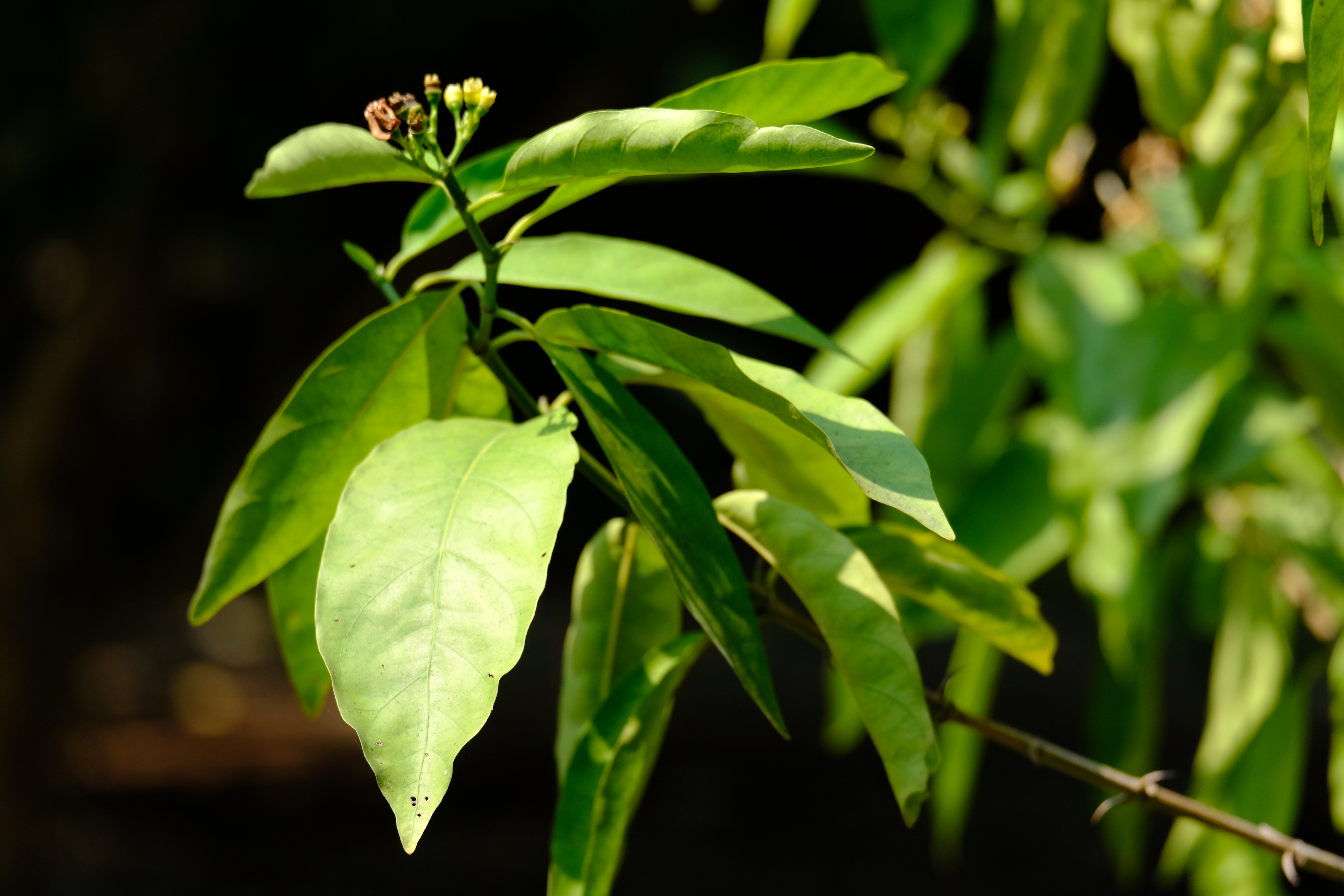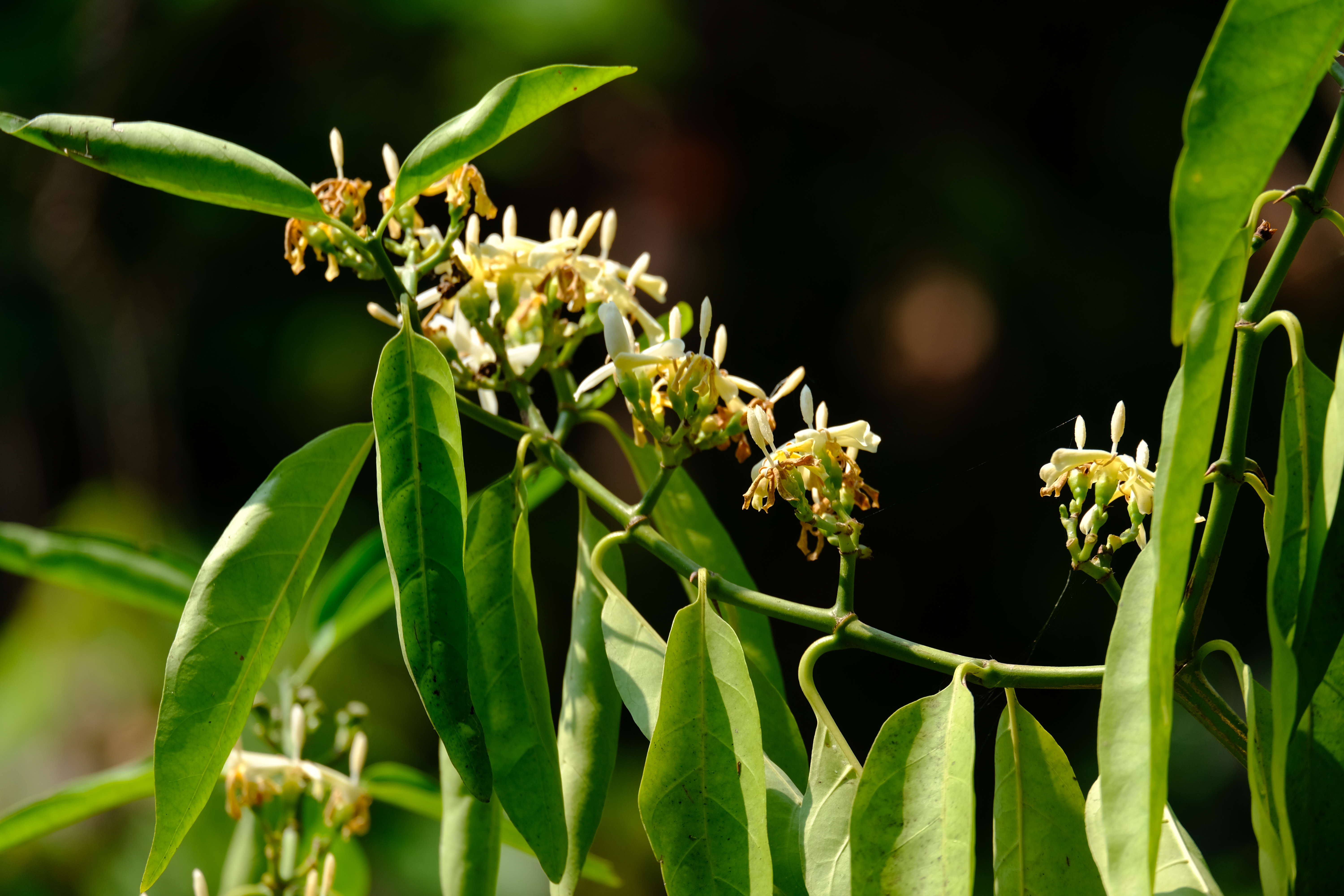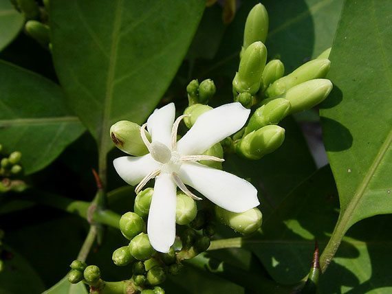 | ลักษณะดอก | ดอกออกเป็นกระจุกตามซอกใบใกล้ปลายกิ่ง ดอกเป็นช่อใหญ่ มีดอกย่อยประมาณ 10-25 ดอก ดอกย่อยขนาดเล็กสีขาว มีกลิ่นหอม ลักษณะคล้ายดอกเข็ม มีกลีบดอก 5 กลีบ |