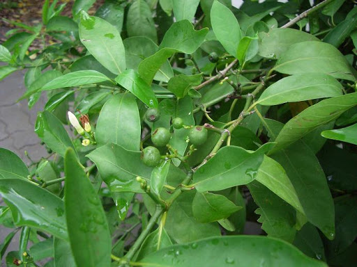 | ลักษณะใบ | ใบเป็นใบเดี่ยวออกตรงข้ามกัน ใบเป็นรูปรี ปลายใบแหลม โคนใบสอบ ส่วนขอบใบเรียบ ใบกว้างประมาณ 4-5 เซนติเมตร ยาวประมาณ 6-12 เซนติเมตร หลังใบเรียบเป็นสีเขียวเข้มเป็นมัน ท้องใบเรียบลื่น มีสีอ่อนกว่า เนื้อใบเหนียว หนา แข็ง หูใบขนาดเล็ก |