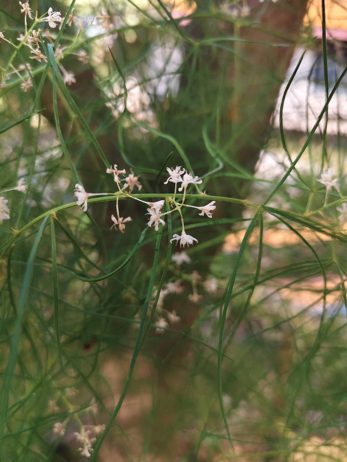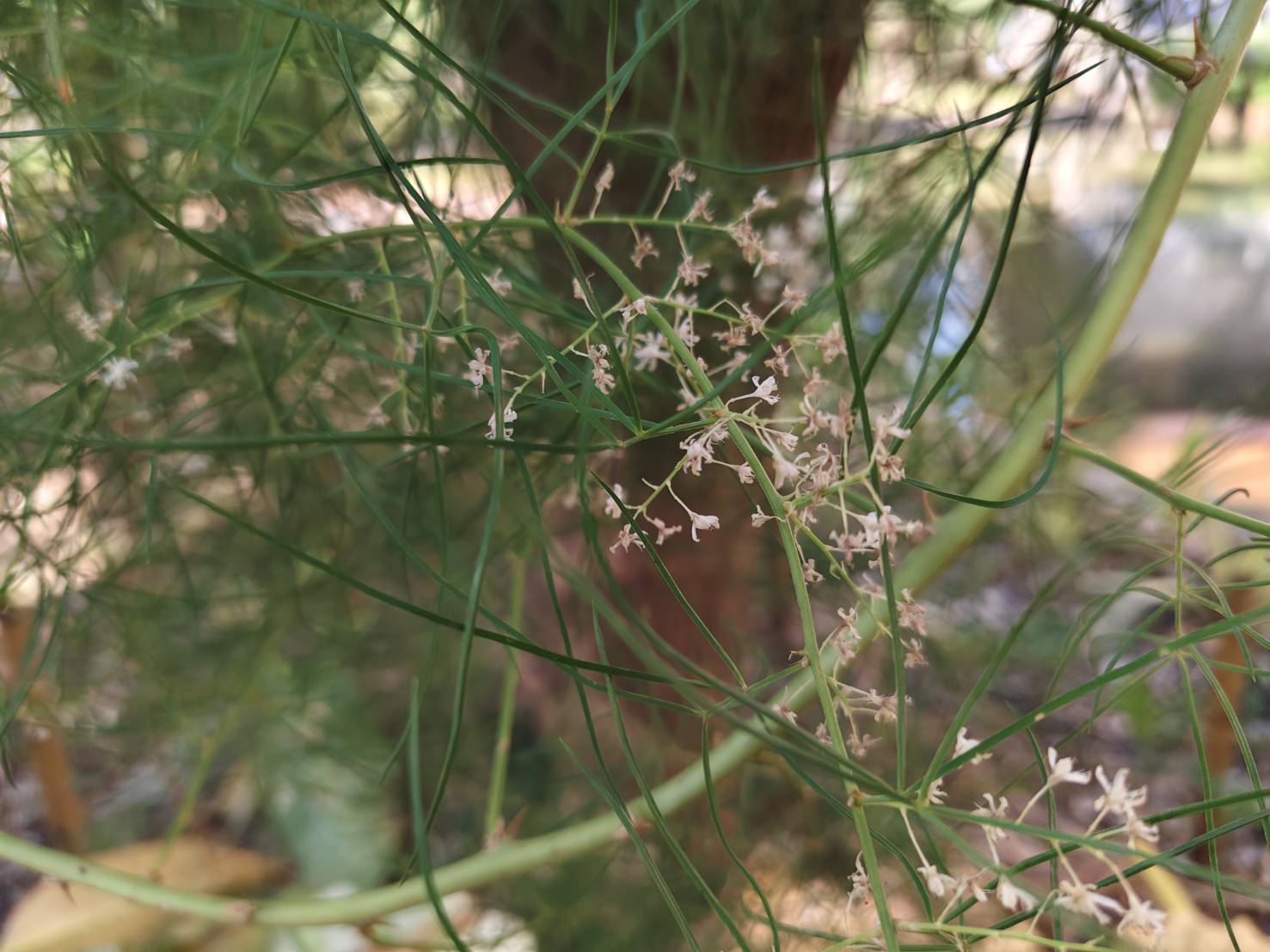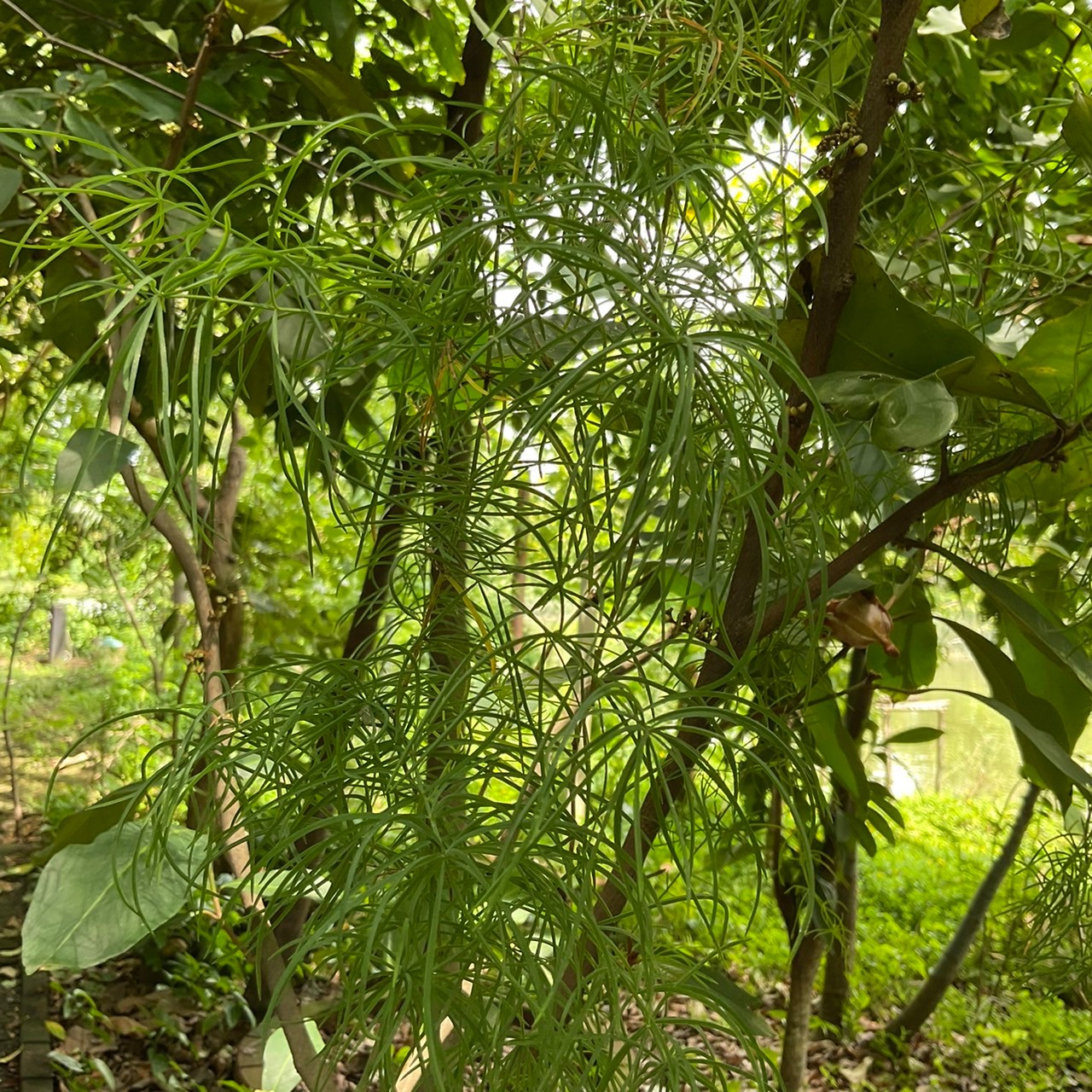 | ลักษณะใบ | ใบเป็นใบเดี่ยว แข็ง ออกรอบข้อเป็นฝอย ๆ คล้ายหางกระรอก หรือออกเรียงสลับเป็นกระจุก 3-4 ใบ ใบเป็นสีเขียว ดอก ใบเป็นรูปเข็มขนาดเล็ก ปลายใบแหลม เป็นรูปเคียว โคนใบแหลม กว้างประมาณ 0.5-1 มิลลิเมตร ยาวประมาณ 10-36 มิลลิเมตร แผ่นมักโค้ง สันเป็นสามเหลี่ยม มี 3 สัน มีหนามที่ซอกกระจุกใบ |