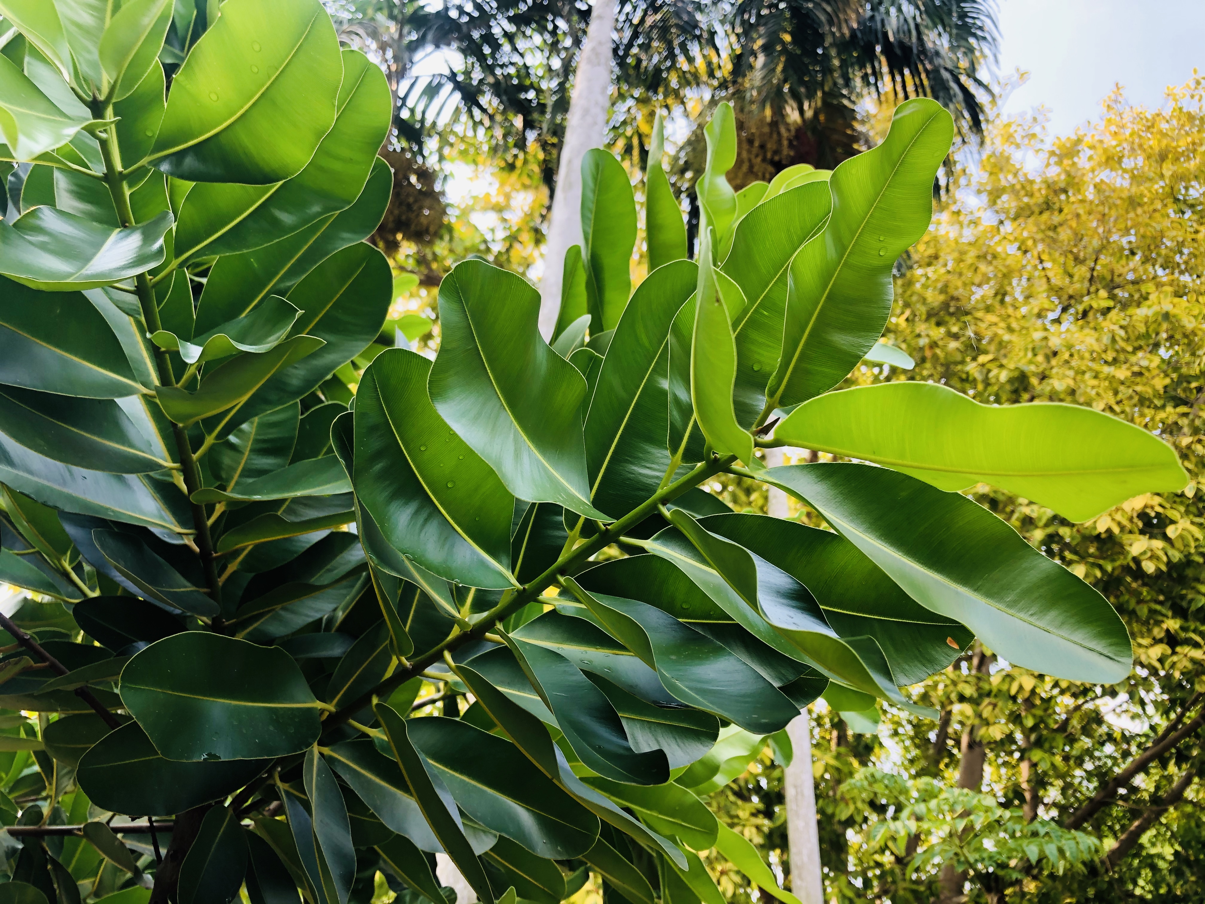 | ลักษณะใบ | ใบเป็นใบเดี่ยวออกเรียงตรงกันข้ามกัน ลักษณะใบเป็นรูปรี หรือรูปไข่กลับแกมขอบขนาน โคนใบสอบ ปลายใบมนกว้าง และมักหยักเว้าเล็กน้อย ใบมีความกว้างประมาณ 4-8 เซนติเมตร ยาว 8-15 เซนติเมตร ใบเป็นสีเขียวเข้ม เนื้อใบหนา แข็ง และเกลี้ยง ขอบใบเรียบและผิวเป็นมัน ท้องใบสีอ่อนกว่า ใบอ่อนเป็นสีน้ำตาลแดง เมื่อแก่แห้งเป็นสีน้ำตาล |