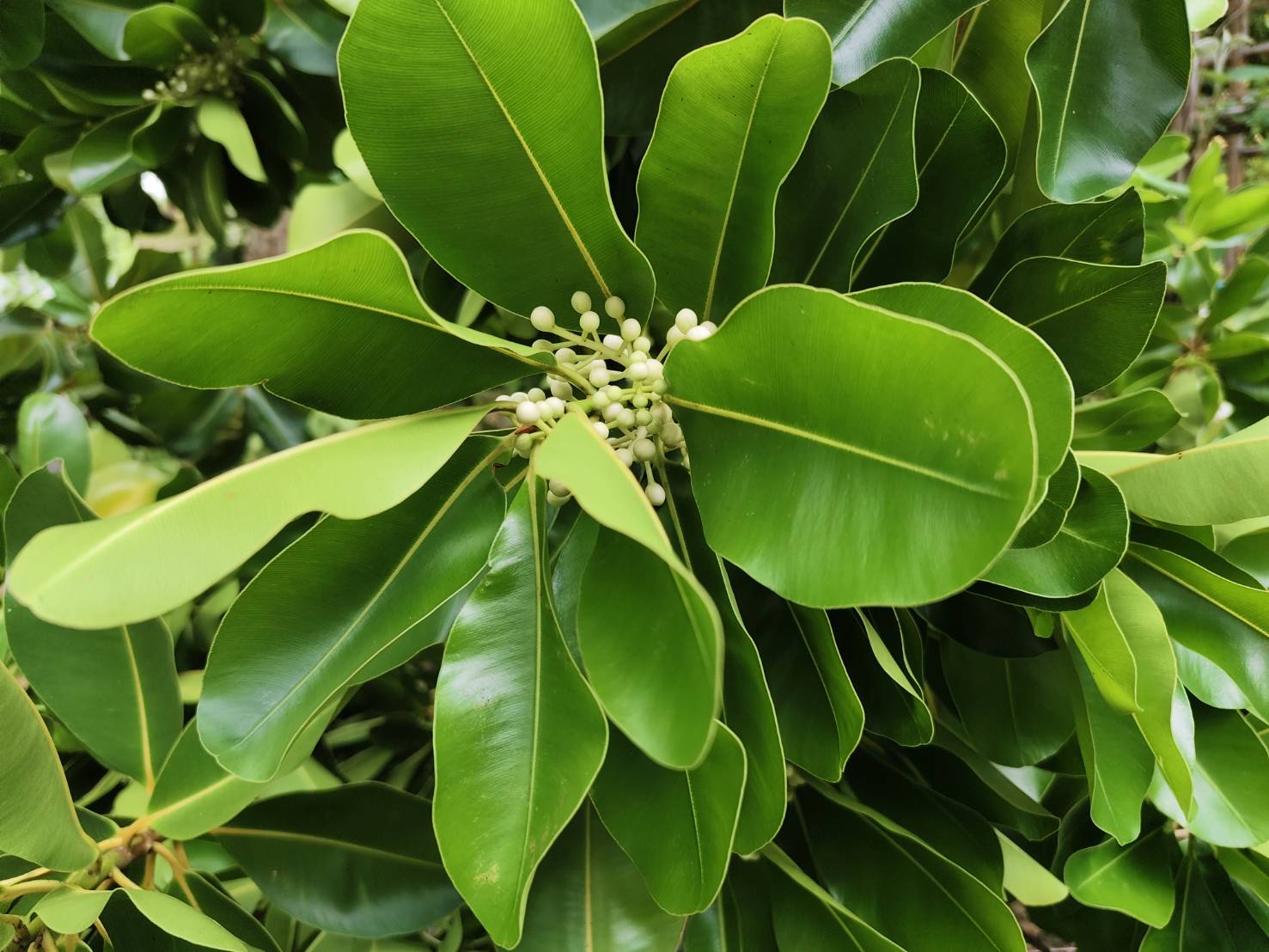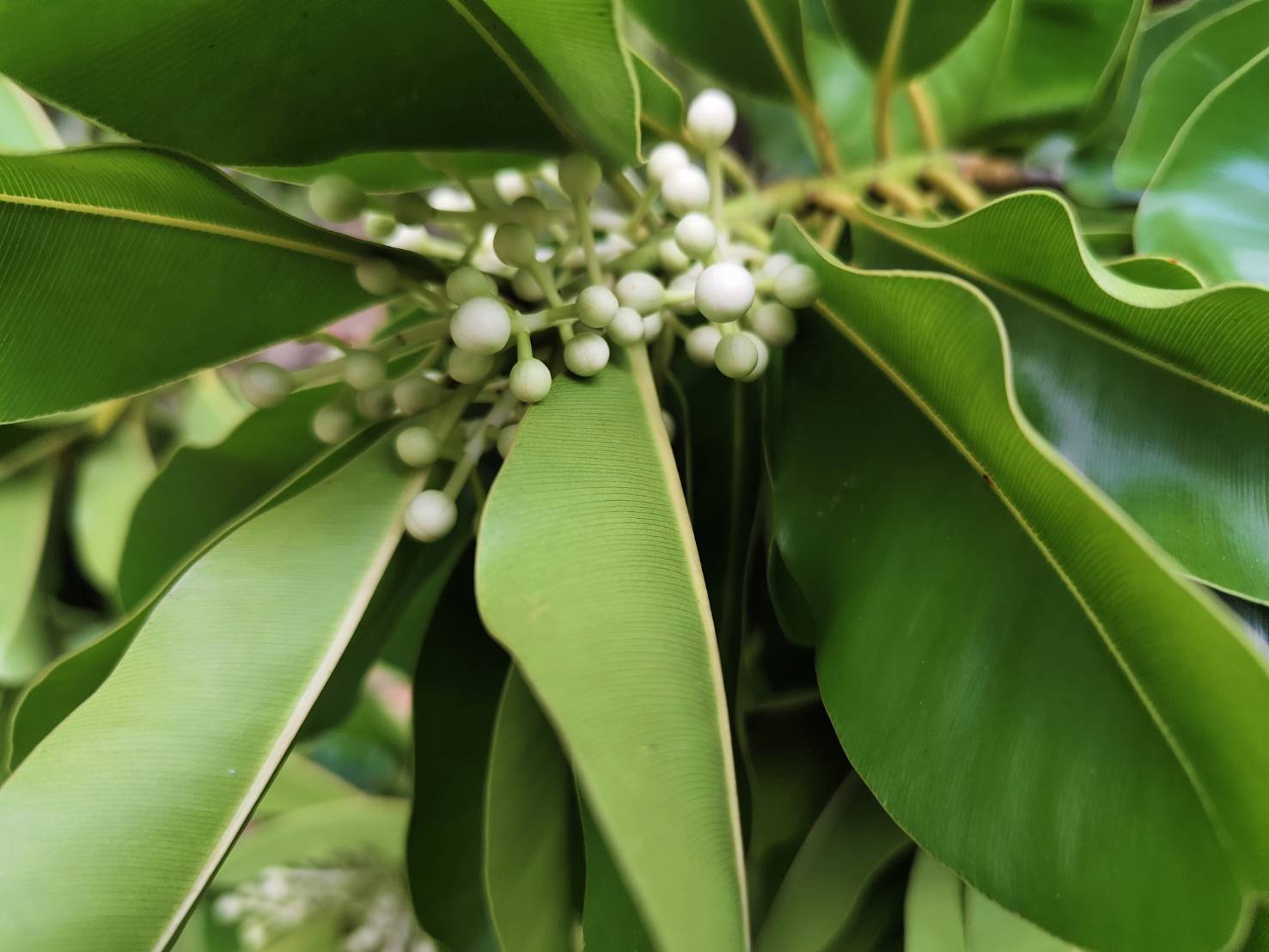 | ลักษณะดอก | ดอกออกเป็นช่อตามปลายกิ่งและง่ามใบ ช่อละประมาณ 5-8 ดอก ดอกเป็นดอกเดี่ยวแยกกันอิสระ ดอกเป็นสีขาวมีกลิ่นหอมอ่อน ๆ กลีบเลี้ยงมี 4 กลีบ ยาวประมาณ 2.7-10 มิลลิเมตร โดยสองกลีบนอกจะเป็นรูปขอบขนานแกมรูปไข่กลับและงอเป็นกระพุ้ง |