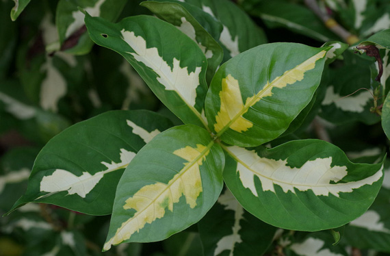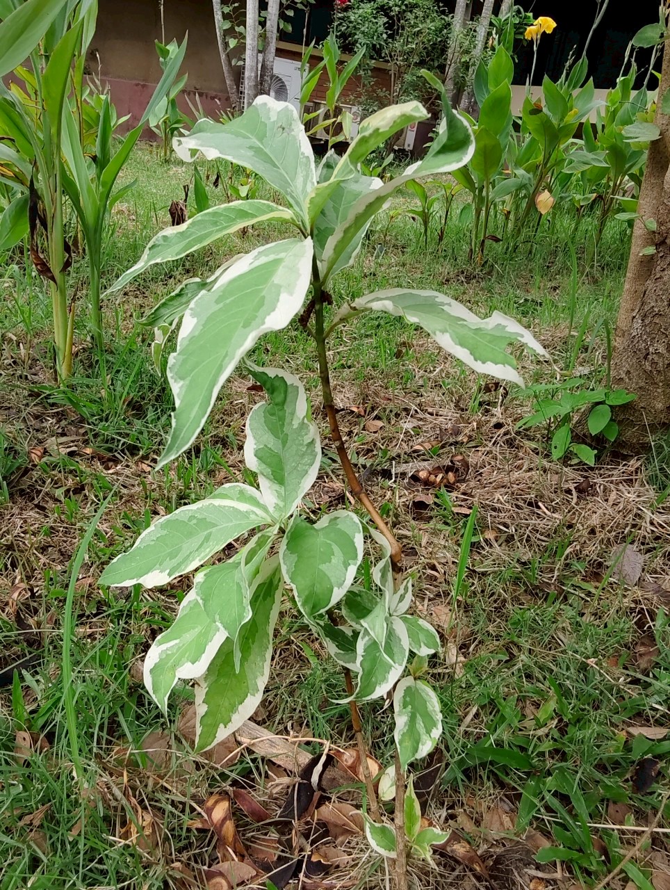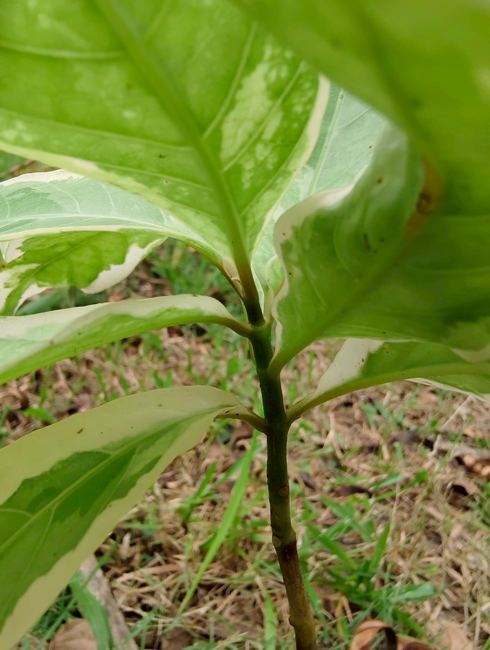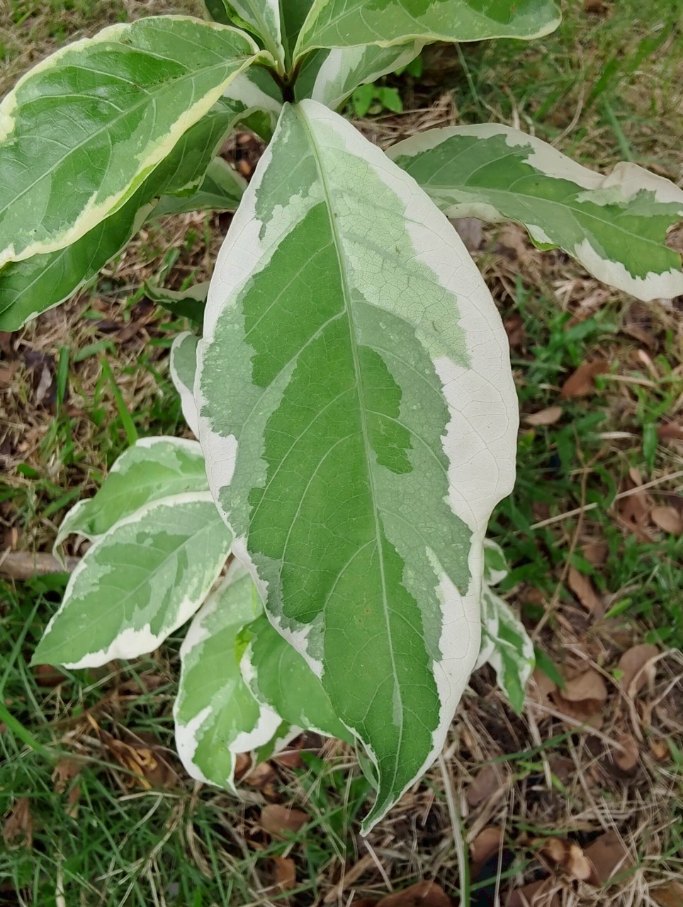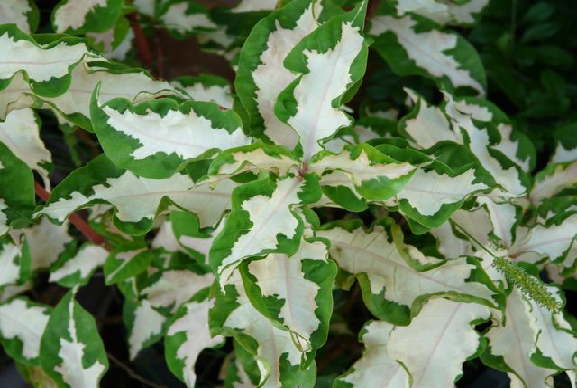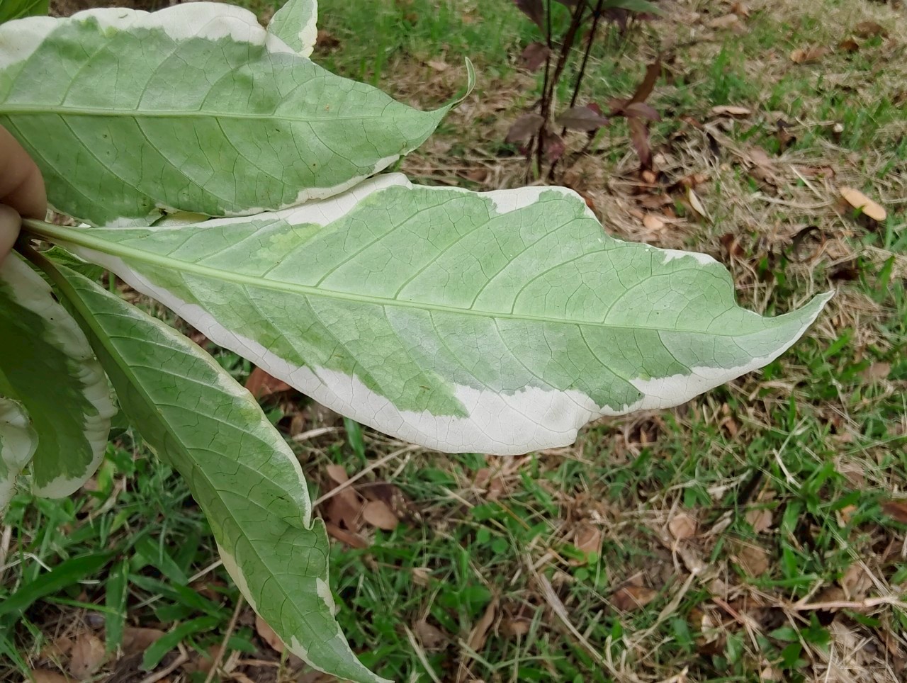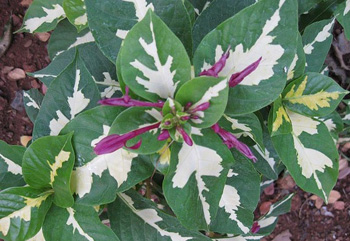 | ลักษณะใบ | ใบเป็นใบเดี่ยว ออกเรียงตรงข้ามเป็นคู่ ๆ สลับกันตามลำต้น ลักษณะของใบเป็นรูปรี ปลายใบแหลม โคนใบแหลม ส่วนขอบใบเป็นคลื่น ใบมีขนาดกว้างประมาณ 4-6 เซนติเมตร ยาวประมาณ 8-12 เซนติเมตร ใบสีเขียว กลางใบจะมีด่างสีขาวหรือสีเหลืองอ่อนจาง ๆ แทรกอยู่ |