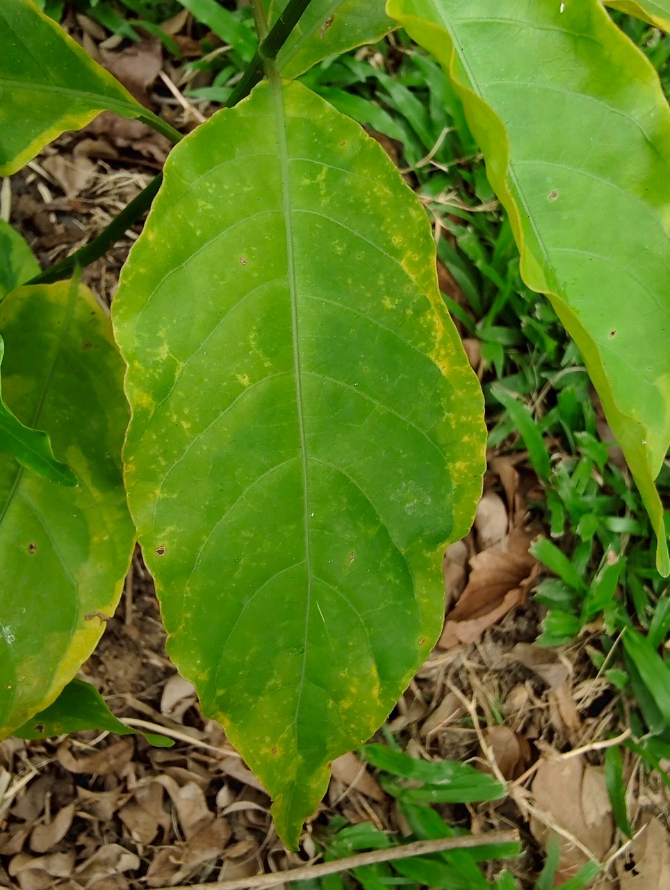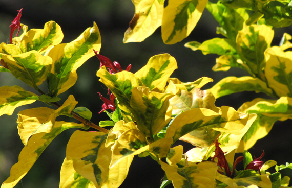 | ลักษณะใบ | ใบเป็นใบเดี่ยว ออกเรียงตรงข้ามเป็นคู่ ๆ สลับกันตามลำต้น ลักษณะของใบเป็นรูปรี ปลายใบแหลม โคนใบแหลม ส่วนขอบใบเป็นคลื่น ใบมีขนาดกว้างประมาณ 4-6 เซนติเมตร ยาวประมาณ 8-12 เซนติเมตร ใบเป็นสีเขียวหรือสีเหลืองอ่อน ๆ มีสีเหลืองเข้มแทรกตามขอบใบ |