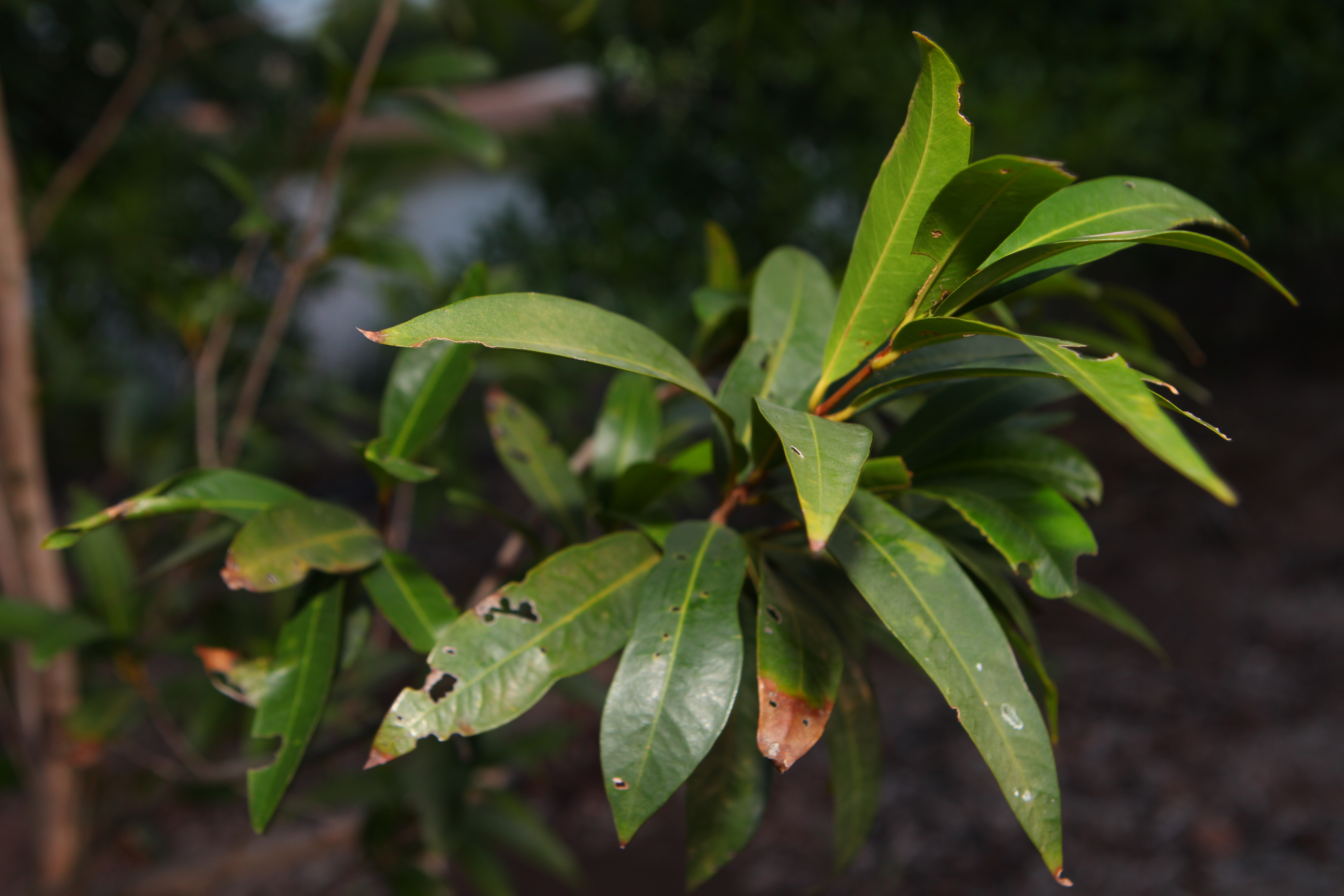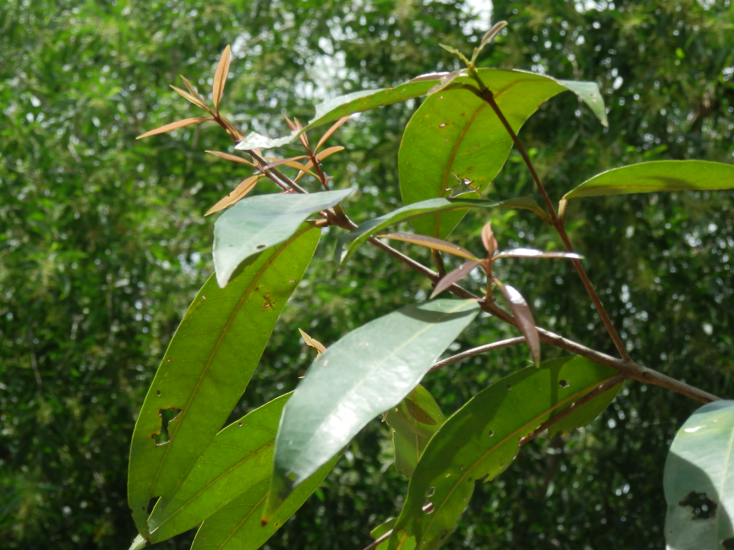 | ลักษณะใบ | ใบเป็นใบเดี่ยว ออกเรียงตรงข้ามกันเป็นคู่ ใบเป็นรูปขอบขนานแกมใบหอกเรียวยาว ปลายใบแหลม และมีติ่งแหลม โคนใบมนรี ส่วนขอบใบเรียบ กว้างประมาณ 3-4 เซนติเมตร ยาวประมาณ 12-17 เซนติเมตร แผ่นใบหนาเป็นสีเขียวเข้ม |