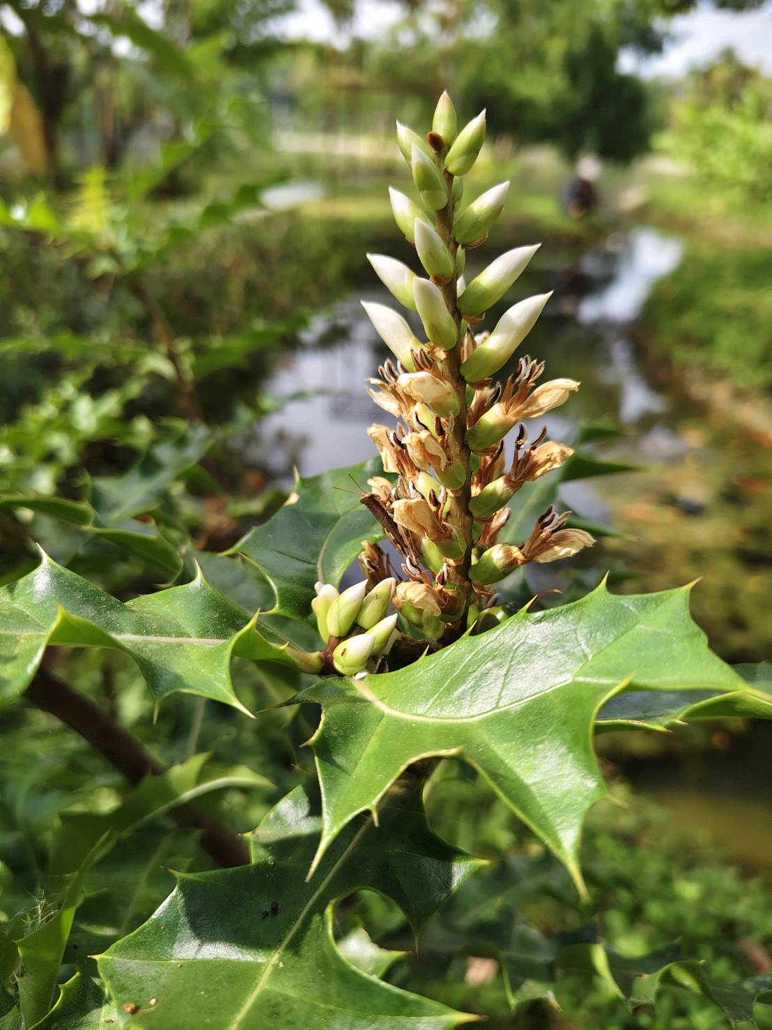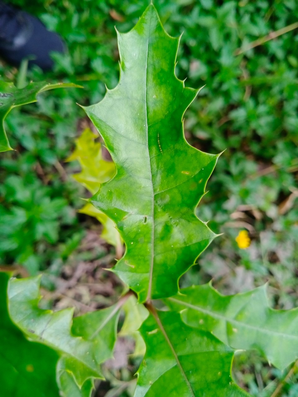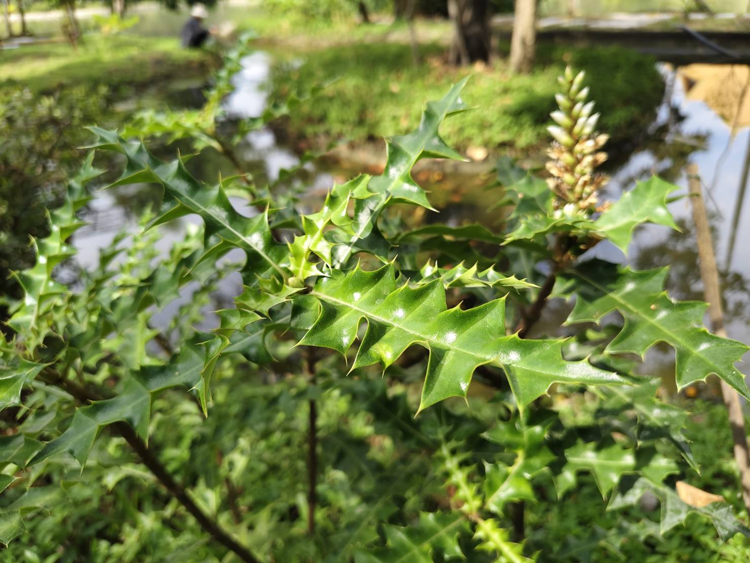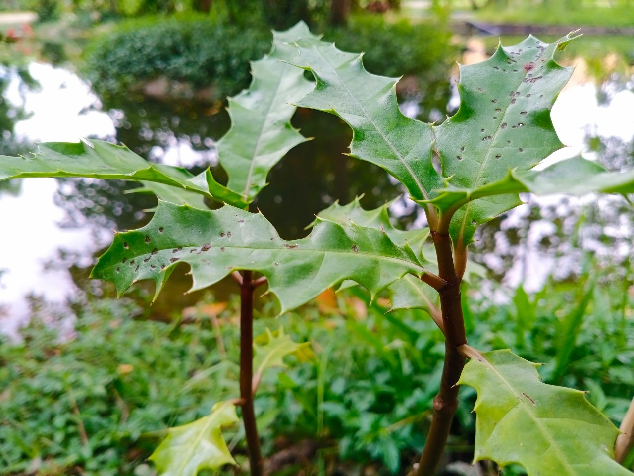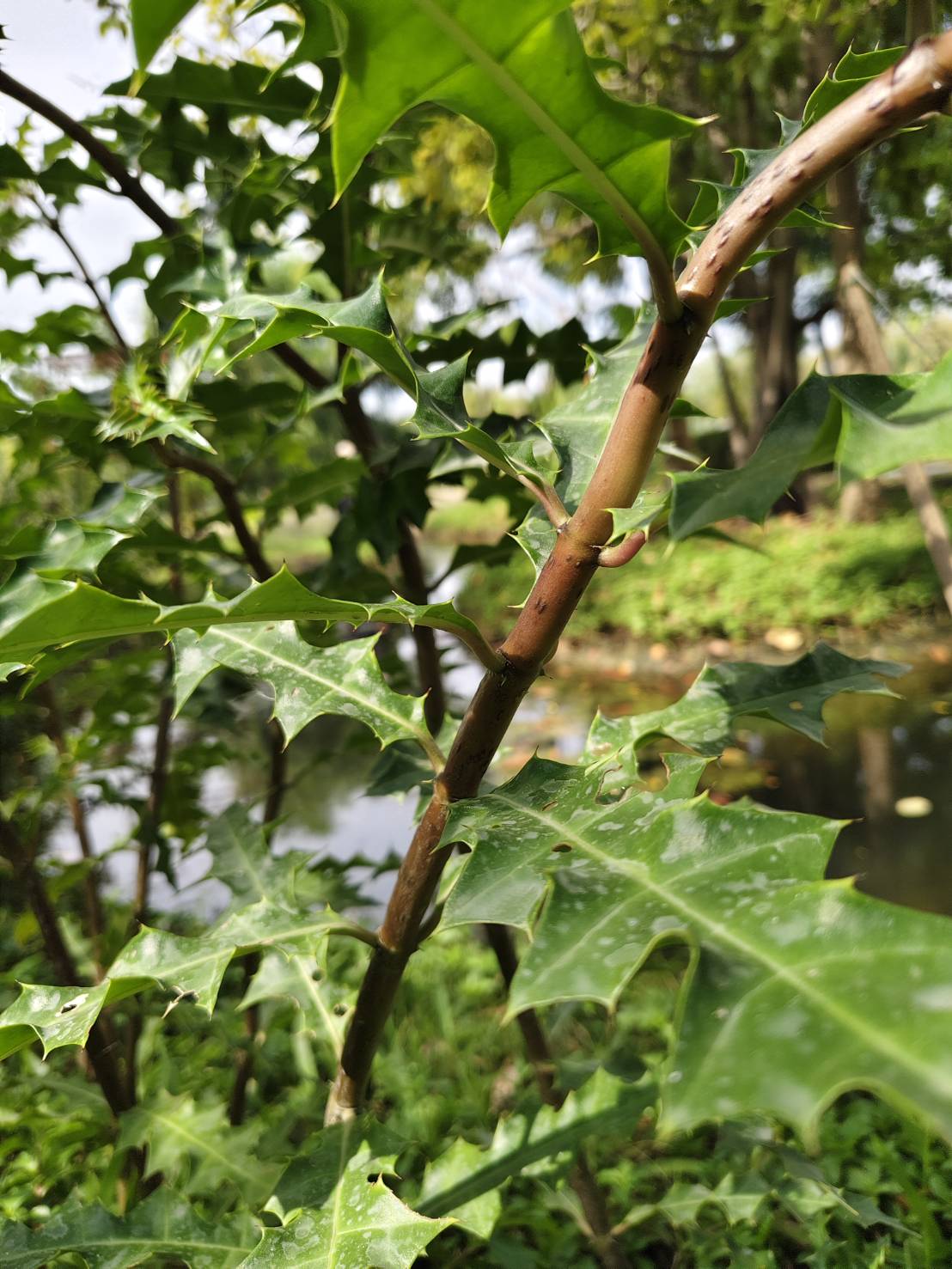 | ลักษณะใบ | ใบเป็นใบเดี่ยว ลักษณะของใบมีหนามคมอยู่ริมขอบใบและปลายใบ ขอบใบเว้าเป็นระยะๆ ผิวใบเรียบเป็นมันลื่น แผ่นใบสีเขียว เส้นใบสีขาว มีเหลือบสีขาวเป็นแนวก้างปลา เนื้อใบแข็งและเหนียว ใบกว้าง 4-7 เซนติเมตร ยาว 10-20 เซนติเมตร ใบออกเป็นคู่ตรงข้ามกัน ก้านใบสั้น |