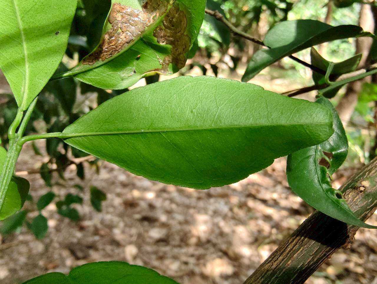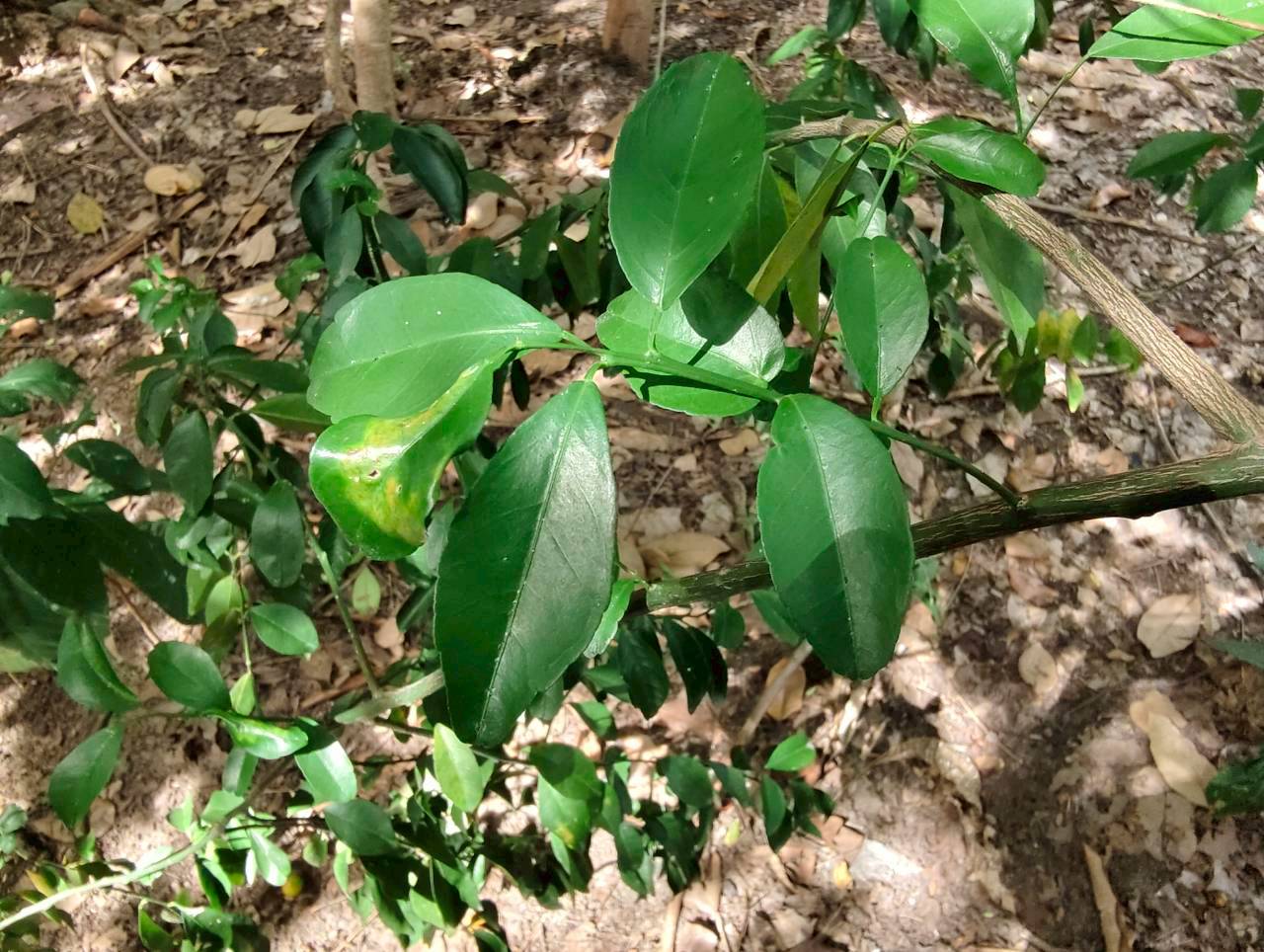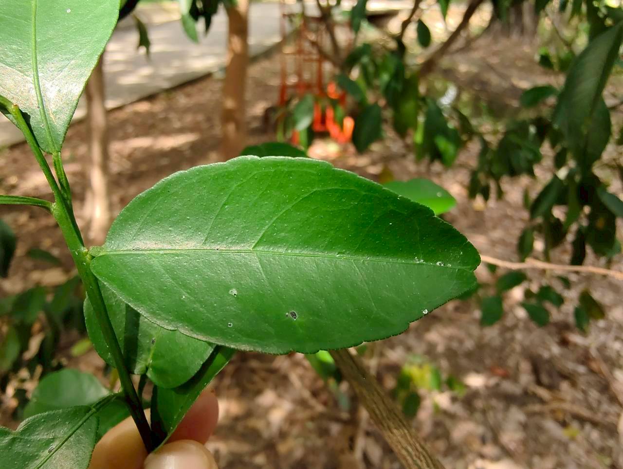 | ลักษณะใบ | ใบเป็นใบเดี่ยวเรียงสลับ มีต่อมน้ำมันเป็นจุดกระจายทั่วใบ ทำให้มีกลิ่นหอม ตัวใบแบ่งเป็นสองส่วน ครึ่งบนเป็นแผ่นกว้างรูปไข่ กว้างประมาณ 7 เซนติเมตร ยาวประมาณ 10 เซนติเมตร ครึ่งล่างแผ่เป็นปีกแคบคล้ายรูปสามเหลี่ยม กว้าง 2 เซนติเมตร ยาว 3 เซนติเมตร ใบหนา สีเขียวเข้มขอบใบเรียบหรือมีจักเล็กน้อย |