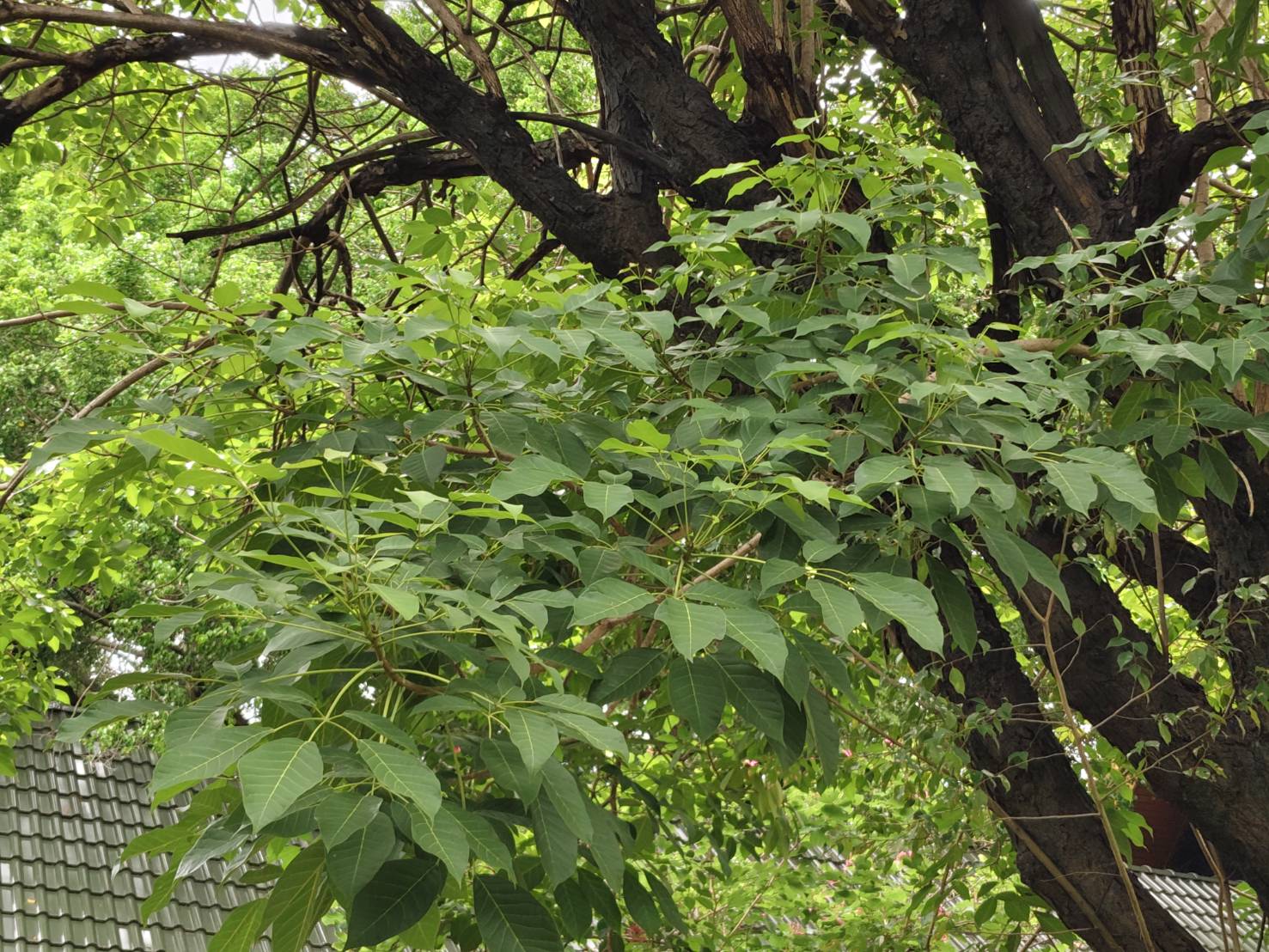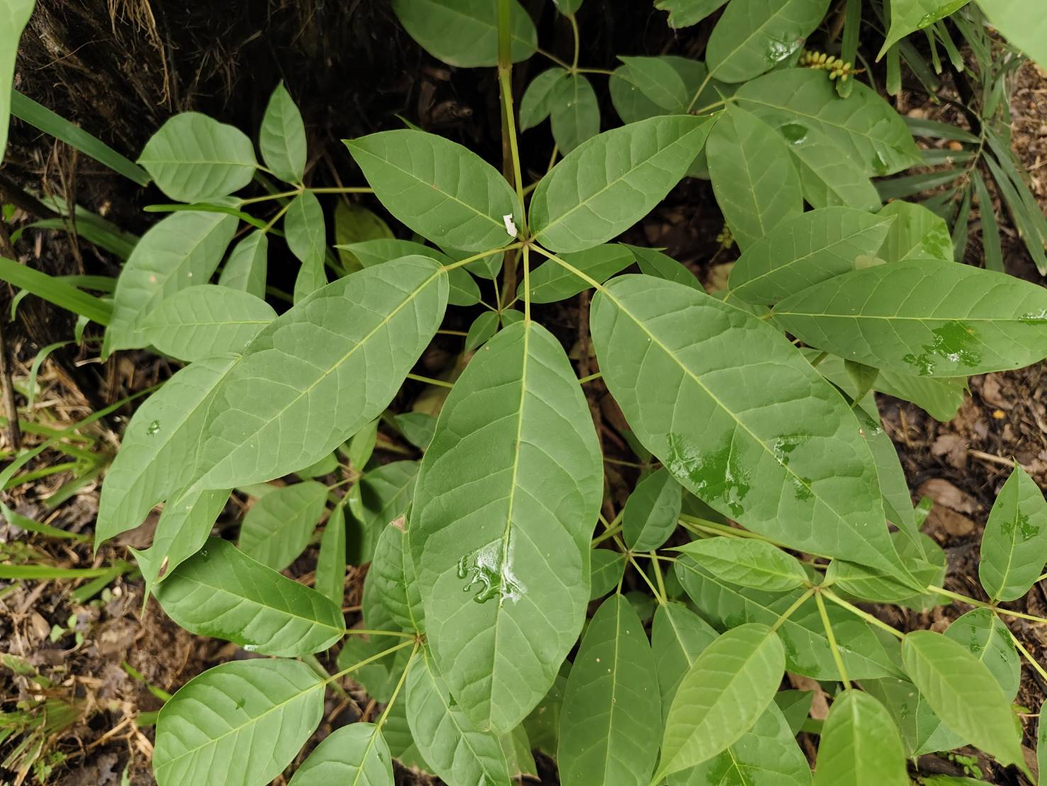 | ลักษณะใบ | ใบเป็นใบประกอบแบบนิ้วมือ เรียงตรงกันข้าม มีใบย่อย 5 ใบ รูปขอบขนานหรือรูปไข่แกมรูปรี ปลายแหลม โคนมนหรือสอบ ขอบเรียบ แผ่นใบหนา สีเขียวเข้ม |